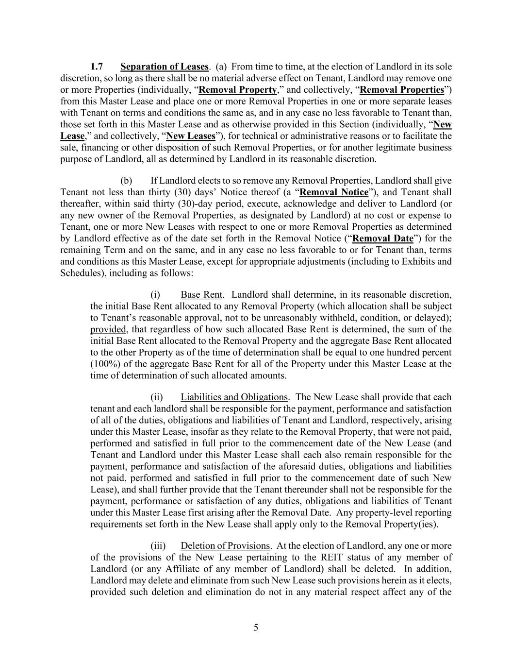 5 1.7 Separation of Leases. (a) From time to time, at the election of Landlord in its sole discretion, so long as there shall be no material adverse effect on Tenant, Landlord may remove one or more Properties (individually, “Removal Property,” and collectively, “Removal Properties”) from this Master Lease and place one or more Removal Properties in one or more separate leases with Tenant on terms and conditions the same as, and in any case no less favorable to Tenant than, those set forth in this Master Lease and as otherwise provided in this Section (individually, “New Lease,” and collectively, “New Leases”), for technical or administrative reasons or to facilitate the sale, financing or other disposition of such Removal Properties, or for another legitimate business purpose of Landlord, all as determined by Landlord in its reasonable discretion. (b) If Landlord elects to so remove any Removal Properties, Landlord shall give Tenant not less than thirty (30) days’ Notice thereof (a “Removal Notice”), and Tenant shall thereafter, within said thirty (30)-day period, execute, acknowledge and deliver to Landlord (or any new owner of the Removal Properties, as designated by Landlord) at no cost or expense to Tenant, one or more New Leases with respect to one or more Removal Properties as determined by Landlord effective as of the date set forth in the Removal Notice (“Removal Date”) for the remaining Term and on the same, and in any case no less favorable to or for Tenant than, terms and conditions as this Master Lease, except for appropriate adjustments (including to Exhibits and Schedules), including as follows: (i) Base Rent. Landlord shall determine, in its reasonable discretion, the initial Base Rent allocated to any Removal Property (which allocation shall be subject to Tenant’s reasonable approval, not to be unreasonably withheld, condition, or delayed); provided, that regardless of how such allocated Base Rent is determined, the sum of the initial Base Rent allocated to the Removal Property and the aggregate Base Rent allocated to the other Property as of the time of determination shall be equal to one hundred percent (100%) of the aggregate Base Rent for all of the Property under this Master Lease at the time of determination of such allocated amounts. (ii) Liabilities and Obligations. The New Lease shall provide that each tenant and each landlord shall be responsible for the payment, performance and satisfaction of all of the duties, obligations and liabilities of Tenant and Landlord, respectively, arising under this Master Lease, insofar as they relate to the Removal Property, that were not paid, performed and satisfied in full prior to the commencement date of the New Lease (and Tenant and Landlord under this Master Lease shall each also remain responsible for the payment, performance and satisfaction of the aforesaid duties, obligations and liabilities not paid, performed and satisfied in full prior to the commencement date of such New Lease), and shall further provide that the Tenant thereunder shall not be responsible for the payment, performance or satisfaction of any duties, obligations and liabilities of Tenant under this Master Lease first arising after the Removal Date. Any property-level reporting requirements set forth in the New Lease shall apply only to the Removal Property(ies). (iii) Deletion of Provisions. At the election of Landlord, any one or more of the provisions of the New Lease pertaining to the REIT status of any member of Landlord (or any Affiliate of any member of Landlord) shall be deleted. In addition, Landlord may delete and eliminate from such New Lease such provisions herein as it elects, provided such deletion and elimination do not in any material respect affect any of the