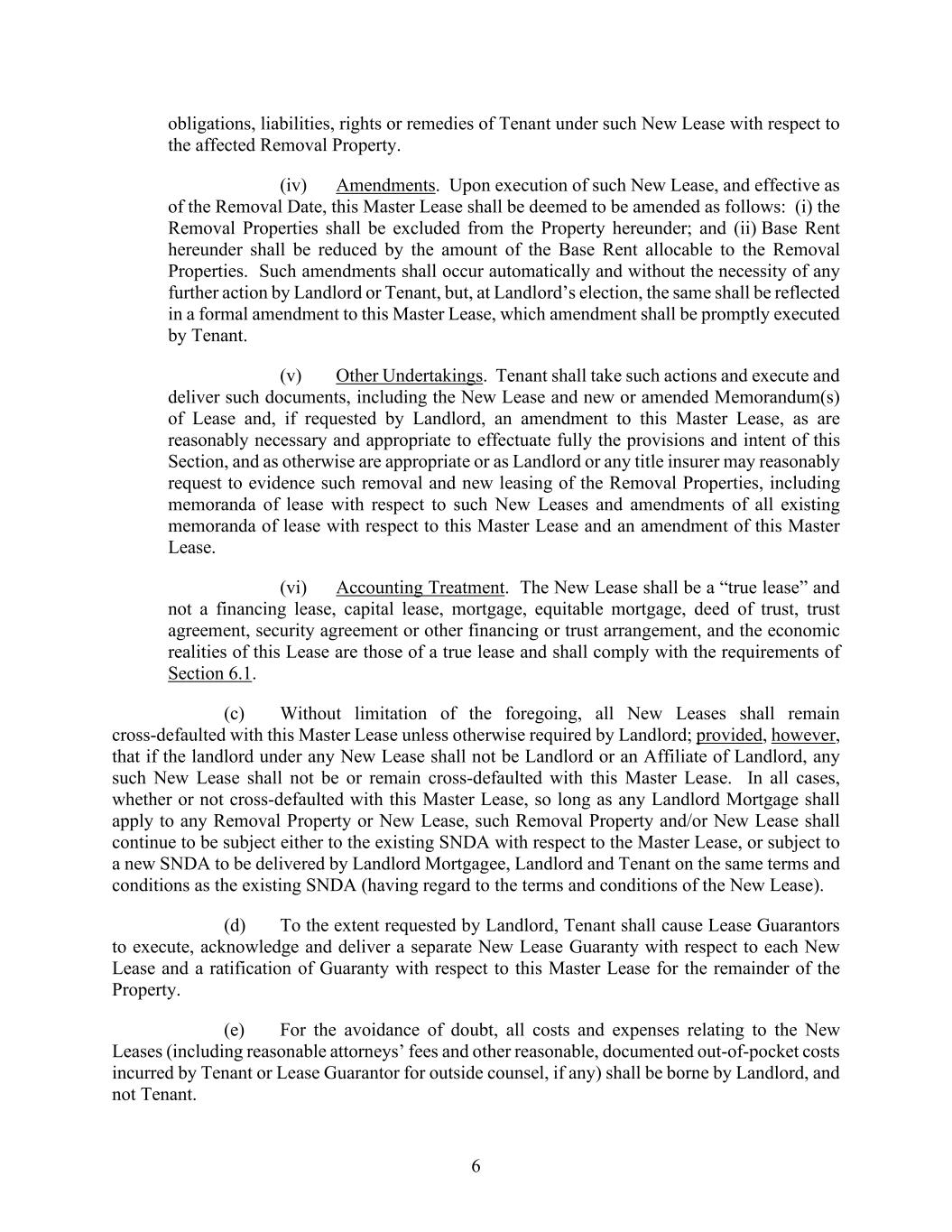 6 obligations, liabilities, rights or remedies of Tenant under such New Lease with respect to the affected Removal Property. (iv) Amendments. Upon execution of such New Lease, and effective as of the Removal Date, this Master Lease shall be deemed to be amended as follows: (i) the Removal Properties shall be excluded from the Property hereunder; and (ii) Base Rent hereunder shall be reduced by the amount of the Base Rent allocable to the Removal Properties. Such amendments shall occur automatically and without the necessity of any further action by Landlord or Tenant, but, at Landlord’s election, the same shall be reflected in a formal amendment to this Master Lease, which amendment shall be promptly executed by Tenant. (v) Other Undertakings. Tenant shall take such actions and execute and deliver such documents, including the New Lease and new or amended Memorandum(s) of Lease and, if requested by Landlord, an amendment to this Master Lease, as are reasonably necessary and appropriate to effectuate fully the provisions and intent of this Section, and as otherwise are appropriate or as Landlord or any title insurer may reasonably request to evidence such removal and new leasing of the Removal Properties, including memoranda of lease with respect to such New Leases and amendments of all existing memoranda of lease with respect to this Master Lease and an amendment of this Master Lease. (vi) Accounting Treatment. The New Lease shall be a “true lease” and not a financing lease, capital lease, mortgage, equitable mortgage, deed of trust, trust agreement, security agreement or other financing or trust arrangement, and the economic realities of this Lease are those of a true lease and shall comply with the requirements of Section 6.1. (c) Without limitation of the foregoing, all New Leases shall remain cross-defaulted with this Master Lease unless otherwise required by Landlord; provided, however, that if the landlord under any New Lease shall not be Landlord or an Affiliate of Landlord, any such New Lease shall not be or remain cross-defaulted with this Master Lease. In all cases, whether or not cross-defaulted with this Master Lease, so long as any Landlord Mortgage shall apply to any Removal Property or New Lease, such Removal Property and/or New Lease shall continue to be subject either to the existing SNDA with respect to the Master Lease, or subject to a new SNDA to be delivered by Landlord Mortgagee, Landlord and Tenant on the same terms and conditions as the existing SNDA (having regard to the terms and conditions of the New Lease). (d) To the extent requested by Landlord, Tenant shall cause Lease Guarantors to execute, acknowledge and deliver a separate New Lease Guaranty with respect to each New Lease and a ratification of Guaranty with respect to this Master Lease for the remainder of the Property. (e) For the avoidance of doubt, all costs and expenses relating to the New Leases (including reasonable attorneys’ fees and other reasonable, documented out-of-pocket costs incurred by Tenant or Lease Guarantor for outside counsel, if any) shall be borne by Landlord, and not Tenant.