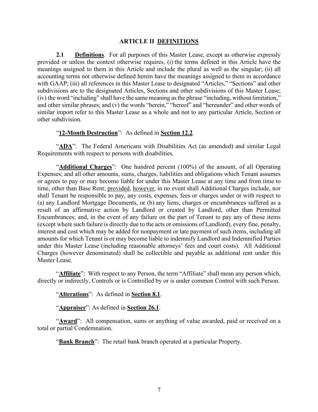 7 ARTICLE II DEFINITIONS 2.1 Definitions. For all purposes of this Master Lease, except as otherwise expressly provided or unless the context otherwise requires, (i) the terms defined in this Article have the meanings assigned to them in this Article and include the plural as well as the singular; (ii) all accounting terms not otherwise defined herein have the meanings assigned to them in accordance with GAAP; (iii) all references in this Master Lease to designated “Articles,” “Sections” and other subdivisions are to the designated Articles, Sections and other subdivisions of this Master Lease; (iv) the word “including” shall have the same meaning as the phrase “including, without limitation,” and other similar phrases; and (v) the words “herein,” “hereof” and “hereunder” and other words of similar import refer to this Master Lease as a whole and not to any particular Article, Section or other subdivision. “12-Month Destruction”: As defined in Section 12.2. “ADA”: The Federal Americans with Disabilities Act (as amended) and similar Legal Requirements with respect to persons with disabilities. “Additional Charges”: One hundred percent (100%) of the amount, of all Operating Expenses; and all other amounts, sums, charges, liabilities and obligations which Tenant assumes or agrees to pay or may become liable for under this Master Lease at any time and from time to time, other than Base Rent; provided, however, in no event shall Additional Charges include, nor shall Tenant be responsible to pay, any costs, expenses, fees or charges under or with respect to (a) any Landlord Mortgage Documents, or (b) any liens, charges or encumbrances suffered as a result of an affirmative action by Landlord or created by Landlord, other than Permitted Encumbrances; and, in the event of any failure on the part of Tenant to pay any of those items (except where such failure is directly due to the acts or omissions of Landlord), every fine, penalty, interest and cost which may be added for nonpayment or late payment of such items, including all amounts for which Tenant is or may become liable to indemnify Landlord and Indemnified Parties under this Master Lease (including reasonable attorneys’ fees and court costs). All Additional Charges (however denominated) shall be collectible and payable as additional rent under this Master Lease. “Affiliate”: With respect to any Person, the term “Affiliate” shall mean any person which, directly or indirectly, Controls or is Controlled by or is under common Control with such Person. “Alterations”: As defined in Section 8.1. “Appraiser”: As defined in Section 26.1. “Award”: All compensation, sums or anything of value awarded, paid or received on a total or partial Condemnation. “Bank Branch”: The retail bank branch operated at a particular Property.