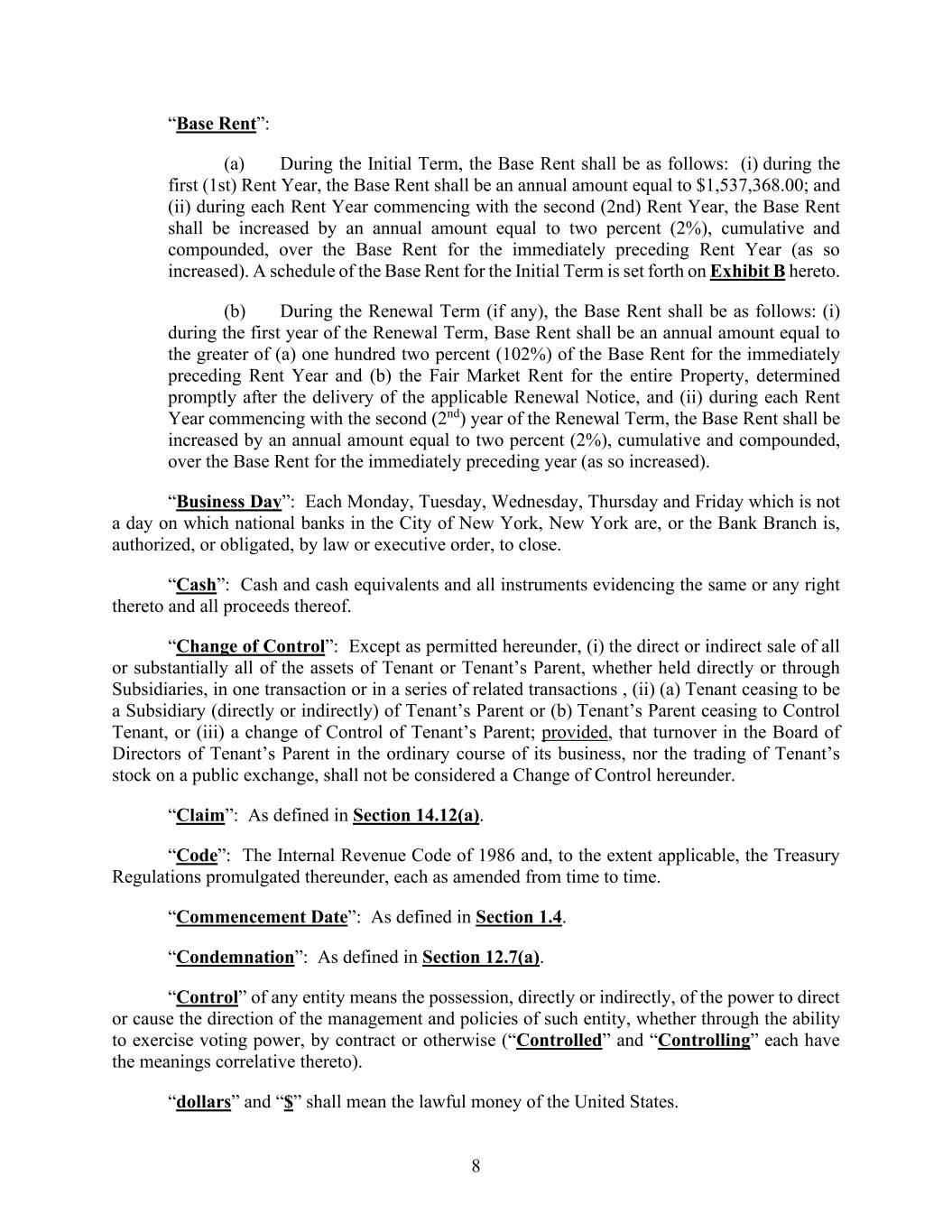 8 “Base Rent”: (a) During the Initial Term, the Base Rent shall be as follows: (i) during the first (1st) Rent Year, the Base Rent shall be an annual amount equal to $1,537,368.00; and (ii) during each Rent Year commencing with the second (2nd) Rent Year, the Base Rent shall be increased by an annual amount equal to two percent (2%), cumulative and compounded, over the Base Rent for the immediately preceding Rent Year (as so increased). A schedule of the Base Rent for the Initial Term is set forth on Exhibit B hereto. (b) During the Renewal Term (if any), the Base Rent shall be as follows: (i) during the first year of the Renewal Term, Base Rent shall be an annual amount equal to the greater of (a) one hundred two percent (102%) of the Base Rent for the immediately preceding Rent Year and (b) the Fair Market Rent for the entire Property, determined promptly after the delivery of the applicable Renewal Notice, and (ii) during each Rent Year commencing with the second (2nd) year of the Renewal Term, the Base Rent shall be increased by an annual amount equal to two percent (2%), cumulative and compounded, over the Base Rent for the immediately preceding year (as so increased). “Business Day”: Each Monday, Tuesday, Wednesday, Thursday and Friday which is not a day on which national banks in the City of New York, New York are, or the Bank Branch is, authorized, or obligated, by law or executive order, to close. “Cash”: Cash and cash equivalents and all instruments evidencing the same or any right thereto and all proceeds thereof. “Change of Control”: Except as permitted hereunder, (i) the direct or indirect sale of all or substantially all of the assets of Tenant or Tenant’s Parent, whether held directly or through Subsidiaries, in one transaction or in a series of related transactions , (ii) (a) Tenant ceasing to be a Subsidiary (directly or indirectly) of Tenant’s Parent or (b) Tenant’s Parent ceasing to Control Tenant, or (iii) a change of Control of Tenant’s Parent; provided, that turnover in the Board of Directors of Tenant’s Parent in the ordinary course of its business, nor the trading of Tenant’s stock on a public exchange, shall not be considered a Change of Control hereunder. “Claim”: As defined in Section 14.12(a). “Code”: The Internal Revenue Code of 1986 and, to the extent applicable, the Treasury Regulations promulgated thereunder, each as amended from time to time. “Commencement Date”: As defined in Section 1.4. “Condemnation”: As defined in Section 12.7(a). “Control” of any entity means the possession, directly or indirectly, of the power to direct or cause the direction of the management and policies of such entity, whether through the ability to exercise voting power, by contract or otherwise (“Controlled” and “Controlling” each have the meanings correlative thereto). “dollars” and “$” shall mean the lawful money of the United States.