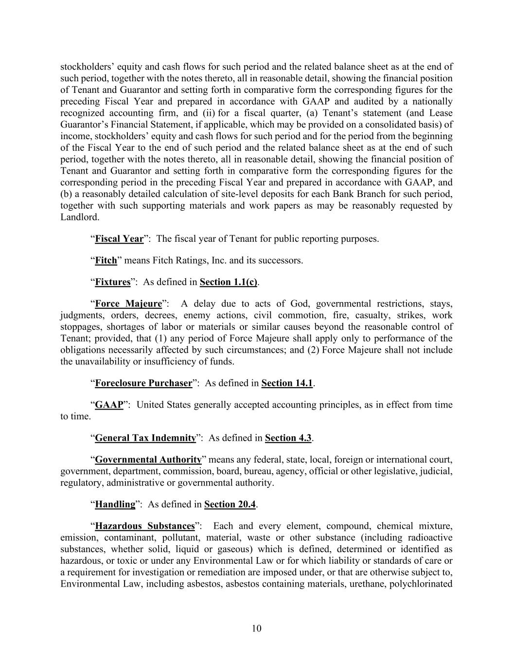 10 stockholders’ equity and cash flows for such period and the related balance sheet as at the end of such period, together with the notes thereto, all in reasonable detail, showing the financial position of Tenant and Guarantor and setting forth in comparative form the corresponding figures for the preceding Fiscal Year and prepared in accordance with GAAP and audited by a nationally recognized accounting firm, and (ii) for a fiscal quarter, (a) Tenant’s statement (and Lease Guarantor’s Financial Statement, if applicable, which may be provided on a consolidated basis) of income, stockholders’ equity and cash flows for such period and for the period from the beginning of the Fiscal Year to the end of such period and the related balance sheet as at the end of such period, together with the notes thereto, all in reasonable detail, showing the financial position of Tenant and Guarantor and setting forth in comparative form the corresponding figures for the corresponding period in the preceding Fiscal Year and prepared in accordance with GAAP, and (b) a reasonably detailed calculation of site-level deposits for each Bank Branch for such period, together with such supporting materials and work papers as may be reasonably requested by Landlord. “Fiscal Year”: The fiscal year of Tenant for public reporting purposes. “Fitch” means Fitch Ratings, Inc. and its successors. “Fixtures”: As defined in Section 1.1(c). “Force Majeure”: A delay due to acts of God, governmental restrictions, stays, judgments, orders, decrees, enemy actions, civil commotion, fire, casualty, strikes, work stoppages, shortages of labor or materials or similar causes beyond the reasonable control of Tenant; provided, that (1) any period of Force Majeure shall apply only to performance of the obligations necessarily affected by such circumstances; and (2) Force Majeure shall not include the unavailability or insufficiency of funds. “Foreclosure Purchaser”: As defined in Section 14.1. “GAAP”: United States generally accepted accounting principles, as in effect from time to time. “General Tax Indemnity”: As defined in Section 4.3. “Governmental Authority” means any federal, state, local, foreign or international court, government, department, commission, board, bureau, agency, official or other legislative, judicial, regulatory, administrative or governmental authority. “Handling”: As defined in Section 20.4. “Hazardous Substances”: Each and every element, compound, chemical mixture, emission, contaminant, pollutant, material, waste or other substance (including radioactive substances, whether solid, liquid or gaseous) which is defined, determined or identified as hazardous, or toxic or under any Environmental Law or for which liability or standards of care or a requirement for investigation or remediation are imposed under, or that are otherwise subject to, Environmental Law, including asbestos, asbestos containing materials, urethane, polychlorinated