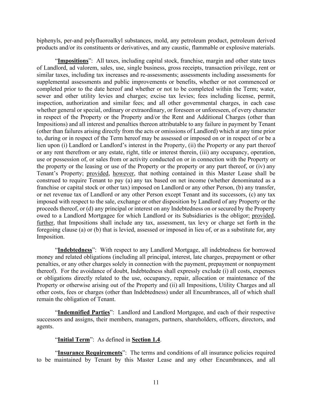 11 biphenyls, per-and polyfluoroalkyl substances, mold, any petroleum product, petroleum derived products and/or its constituents or derivatives, and any caustic, flammable or explosive materials. “Impositions”: All taxes, including capital stock, franchise, margin and other state taxes of Landlord, ad valorem, sales, use, single business, gross receipts, transaction privilege, rent or similar taxes, including tax increases and re-assessments; assessments including assessments for supplemental assessments and public improvements or benefits, whether or not commenced or completed prior to the date hereof and whether or not to be completed within the Term; water, sewer and other utility levies and charges; excise tax levies; fees including license, permit, inspection, authorization and similar fees; and all other governmental charges, in each case whether general or special, ordinary or extraordinary, or foreseen or unforeseen, of every character in respect of the Property or the Property and/or the Rent and Additional Charges (other than Impositions) and all interest and penalties thereon attributable to any failure in payment by Tenant (other than failures arising directly from the acts or omissions of Landlord) which at any time prior to, during or in respect of the Term hereof may be assessed or imposed on or in respect of or be a lien upon (i) Landlord or Landlord’s interest in the Property, (ii) the Property or any part thereof or any rent therefrom or any estate, right, title or interest therein, (iii) any occupancy, operation, use or possession of, or sales from or activity conducted on or in connection with the Property or the property or the leasing or use of the Property or the property or any part thereof, or (iv) any Tenant’s Property; provided, however, that nothing contained in this Master Lease shall be construed to require Tenant to pay (a) any tax based on net income (whether denominated as a franchise or capital stock or other tax) imposed on Landlord or any other Person, (b) any transfer, or net revenue tax of Landlord or any other Person except Tenant and its successors, (c) any tax imposed with respect to the sale, exchange or other disposition by Landlord of any Property or the proceeds thereof, or (d) any principal or interest on any Indebtedness on or secured by the Property owed to a Landlord Mortgagee for which Landlord or its Subsidiaries is the obligor; provided, further, that Impositions shall include any tax, assessment, tax levy or charge set forth in the foregoing clause (a) or (b) that is levied, assessed or imposed in lieu of, or as a substitute for, any Imposition. “Indebtedness”: With respect to any Landlord Mortgage, all indebtedness for borrowed money and related obligations (including all principal, interest, late charges, prepayment or other penalties, or any other charges solely in connection with the payment, prepayment or nonpayment thereof). For the avoidance of doubt, Indebtedness shall expressly exclude (i) all costs, expenses or obligations directly related to the use, occupancy, repair, allocation or maintenance of the Property or otherwise arising out of the Property and (ii) all Impositions, Utility Charges and all other costs, fees or charges (other than Indebtedness) under all Encumbrances, all of which shall remain the obligation of Tenant. “Indemnified Parties”: Landlord and Landlord Mortgagee, and each of their respective successors and assigns, their members, managers, partners, shareholders, officers, directors, and agents. “Initial Term”: As defined in Section 1.4. “Insurance Requirements”: The terms and conditions of all insurance policies required to be maintained by Tenant by this Master Lease and any other Encumbrances, and all