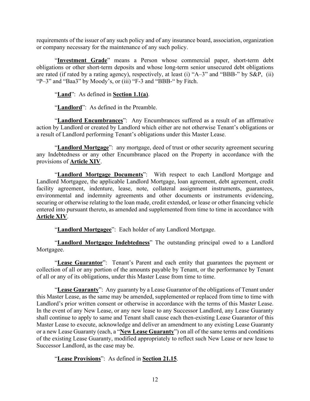 12 requirements of the issuer of any such policy and of any insurance board, association, organization or company necessary for the maintenance of any such policy. “Investment Grade” means a Person whose commercial paper, short-term debt obligations or other short-term deposits and whose long-term senior unsecured debt obligations are rated (if rated by a rating agency), respectively, at least (i) “A–3” and “BBB-” by S&P, (ii) “P–3” and “Baa3” by Moody’s, or (iii) “F-3 and “BBB-“ by Fitch. “Land”: As defined in Section 1.1(a). “Landlord”: As defined in the Preamble. “Landlord Encumbrances”: Any Encumbrances suffered as a result of an affirmative action by Landlord or created by Landlord which either are not otherwise Tenant’s obligations or a result of Landlord performing Tenant’s obligations under this Master Lease. “Landlord Mortgage”: any mortgage, deed of trust or other security agreement securing any Indebtedness or any other Encumbrance placed on the Property in accordance with the provisions of Article XIV. “Landlord Mortgage Documents”: With respect to each Landlord Mortgage and Landlord Mortgagee, the applicable Landlord Mortgage, loan agreement, debt agreement, credit facility agreement, indenture, lease, note, collateral assignment instruments, guarantees, environmental and indemnity agreements and other documents or instruments evidencing, securing or otherwise relating to the loan made, credit extended, or lease or other financing vehicle entered into pursuant thereto, as amended and supplemented from time to time in accordance with Article XIV. “Landlord Mortgagee”: Each holder of any Landlord Mortgage. “Landlord Mortgagee Indebtedness” The outstanding principal owed to a Landlord Mortgagee. “Lease Guarantor”: Tenant’s Parent and each entity that guarantees the payment or collection of all or any portion of the amounts payable by Tenant, or the performance by Tenant of all or any of its obligations, under this Master Lease from time to time. “Lease Guaranty”: Any guaranty by a Lease Guarantor of the obligations of Tenant under this Master Lease, as the same may be amended, supplemented or replaced from time to time with Landlord’s prior written consent or otherwise in accordance with the terms of this Master Lease. In the event of any New Lease, or any new lease to any Successor Landlord, any Lease Guaranty shall continue to apply to same and Tenant shall cause each then-existing Lease Guarantor of this Master Lease to execute, acknowledge and deliver an amendment to any existing Lease Guaranty or a new Lease Guaranty (each, a “New Lease Guaranty”) on all of the same terms and conditions of the existing Lease Guaranty, modified appropriately to reflect such New Lease or new lease to Successor Landlord, as the case may be. “Lease Provisions”: As defined in Section 21.15.