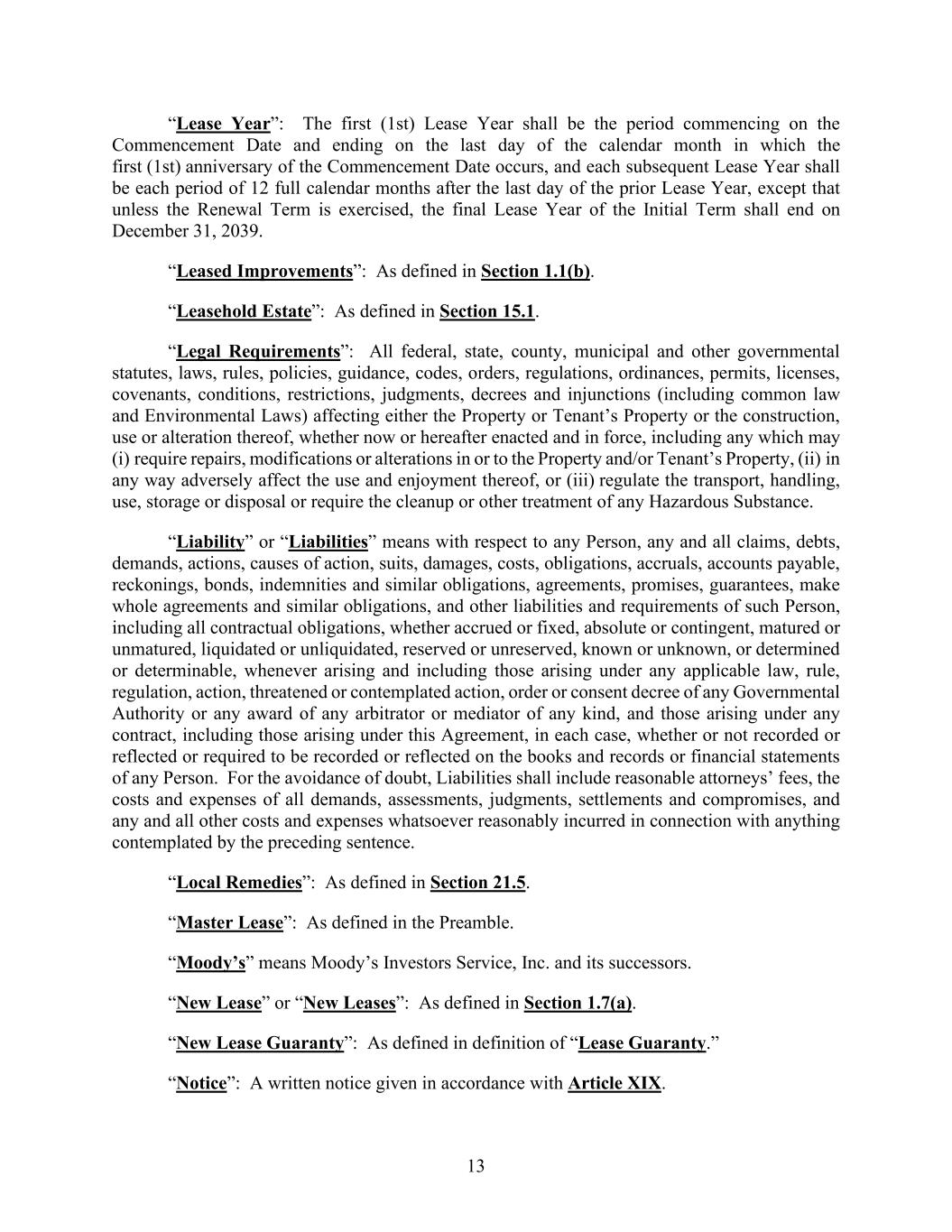13 “Lease Year”: The first (1st) Lease Year shall be the period commencing on the Commencement Date and ending on the last day of the calendar month in which the first (1st) anniversary of the Commencement Date occurs, and each subsequent Lease Year shall be each period of 12 full calendar months after the last day of the prior Lease Year, except that unless the Renewal Term is exercised, the final Lease Year of the Initial Term shall end on December 31, 2039. “Leased Improvements”: As defined in Section 1.1(b). “Leasehold Estate”: As defined in Section 15.1. “Legal Requirements”: All federal, state, county, municipal and other governmental statutes, laws, rules, policies, guidance, codes, orders, regulations, ordinances, permits, licenses, covenants, conditions, restrictions, judgments, decrees and injunctions (including common law and Environmental Laws) affecting either the Property or Tenant’s Property or the construction, use or alteration thereof, whether now or hereafter enacted and in force, including any which may (i) require repairs, modifications or alterations in or to the Property and/or Tenant’s Property, (ii) in any way adversely affect the use and enjoyment thereof, or (iii) regulate the transport, handling, use, storage or disposal or require the cleanup or other treatment of any Hazardous Substance. “Liability” or “Liabilities” means with respect to any Person, any and all claims, debts, demands, actions, causes of action, suits, damages, costs, obligations, accruals, accounts payable, reckonings, bonds, indemnities and similar obligations, agreements, promises, guarantees, make whole agreements and similar obligations, and other liabilities and requirements of such Person, including all contractual obligations, whether accrued or fixed, absolute or contingent, matured or unmatured, liquidated or unliquidated, reserved or unreserved, known or unknown, or determined or determinable, whenever arising and including those arising under any applicable law, rule, regulation, action, threatened or contemplated action, order or consent decree of any Governmental Authority or any award of any arbitrator or mediator of any kind, and those arising under any contract, including those arising under this Agreement, in each case, whether or not recorded or reflected or required to be recorded or reflected on the books and records or financial statements of any Person. For the avoidance of doubt, Liabilities shall include reasonable attorneys’ fees, the costs and expenses of all demands, assessments, judgments, settlements and compromises, and any and all other costs and expenses whatsoever reasonably incurred in connection with anything contemplated by the preceding sentence. “Local Remedies”: As defined in Section 21.5. “Master Lease”: As defined in the Preamble. “Moody’s” means Moody’s Investors Service, Inc. and its successors. “New Lease” or “New Leases”: As defined in Section 1.7(a). “New Lease Guaranty”: As defined in definition of “Lease Guaranty.” “Notice”: A written notice given in accordance with Article XIX.