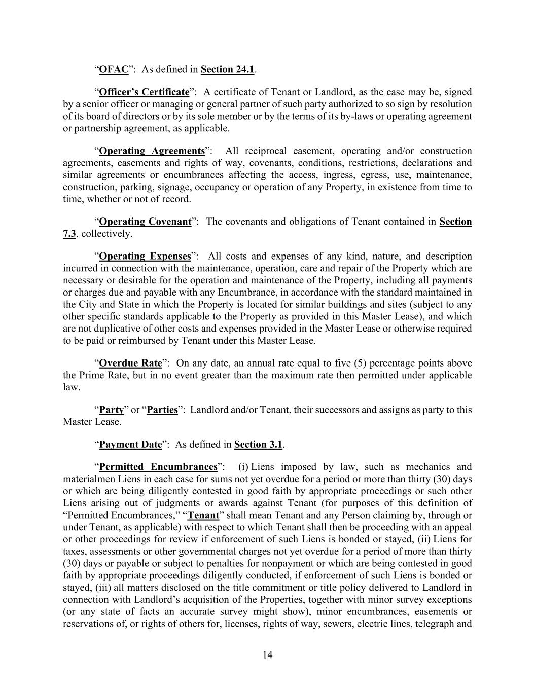 14 “OFAC”: As defined in Section 24.1. “Officer’s Certificate”: A certificate of Tenant or Landlord, as the case may be, signed by a senior officer or managing or general partner of such party authorized to so sign by resolution of its board of directors or by its sole member or by the terms of its by-laws or operating agreement or partnership agreement, as applicable. “Operating Agreements”: All reciprocal easement, operating and/or construction agreements, easements and rights of way, covenants, conditions, restrictions, declarations and similar agreements or encumbrances affecting the access, ingress, egress, use, maintenance, construction, parking, signage, occupancy or operation of any Property, in existence from time to time, whether or not of record. “Operating Covenant”: The covenants and obligations of Tenant contained in Section 7.3, collectively. “Operating Expenses”: All costs and expenses of any kind, nature, and description incurred in connection with the maintenance, operation, care and repair of the Property which are necessary or desirable for the operation and maintenance of the Property, including all payments or charges due and payable with any Encumbrance, in accordance with the standard maintained in the City and State in which the Property is located for similar buildings and sites (subject to any other specific standards applicable to the Property as provided in this Master Lease), and which are not duplicative of other costs and expenses provided in the Master Lease or otherwise required to be paid or reimbursed by Tenant under this Master Lease. “Overdue Rate”: On any date, an annual rate equal to five (5) percentage points above the Prime Rate, but in no event greater than the maximum rate then permitted under applicable law. “Party” or “Parties”: Landlord and/or Tenant, their successors and assigns as party to this Master Lease. “Payment Date”: As defined in Section 3.1. “Permitted Encumbrances”: (i) Liens imposed by law, such as mechanics and materialmen Liens in each case for sums not yet overdue for a period or more than thirty (30) days or which are being diligently contested in good faith by appropriate proceedings or such other Liens arising out of judgments or awards against Tenant (for purposes of this definition of “Permitted Encumbrances,” “Tenant” shall mean Tenant and any Person claiming by, through or under Tenant, as applicable) with respect to which Tenant shall then be proceeding with an appeal or other proceedings for review if enforcement of such Liens is bonded or stayed, (ii) Liens for taxes, assessments or other governmental charges not yet overdue for a period of more than thirty (30) days or payable or subject to penalties for nonpayment or which are being contested in good faith by appropriate proceedings diligently conducted, if enforcement of such Liens is bonded or stayed, (iii) all matters disclosed on the title commitment or title policy delivered to Landlord in connection with Landlord’s acquisition of the Properties, together with minor survey exceptions (or any state of facts an accurate survey might show), minor encumbrances, easements or reservations of, or rights of others for, licenses, rights of way, sewers, electric lines, telegraph and