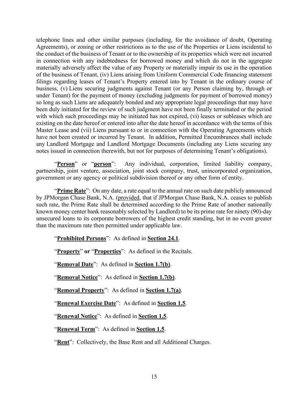 15 telephone lines and other similar purposes (including, for the avoidance of doubt, Operating Agreements), or zoning or other restrictions as to the use of the Properties or Liens incidental to the conduct of the business of Tenant or to the ownership of its properties which were not incurred in connection with any indebtedness for borrowed money and which do not in the aggregate materially adversely affect the value of any Property or materially impair its use in the operation of the business of Tenant, (iv) Liens arising from Uniform Commercial Code financing statement filings regarding leases of Tenant’s Property entered into by Tenant in the ordinary course of business, (v) Liens securing judgments against Tenant (or any Person claiming by, through or under Tenant) for the payment of money (excluding judgments for payment of borrowed money) so long as such Liens are adequately bonded and any appropriate legal proceedings that may have been duly initiated for the review of such judgment have not been finally terminated or the period with which such proceedings may be initiated has not expired, (vi) leases or subleases which are existing on the date hereof or entered into after the date hereof in accordance with the terms of this Master Lease and (vii) Liens pursuant to or in connection with the Operating Agreements which have not been created or incurred by Tenant. In addition, Permitted Encumbrances shall include any Landlord Mortgage and Landlord Mortgage Documents (including any Liens securing any notes issued in connection therewith, but not for purposes of determining Tenant’s obligations). “Person” or “person”: Any individual, corporation, limited liability company, partnership, joint venture, association, joint stock company, trust, unincorporated organization, government or any agency or political subdivision thereof or any other form of entity. “Prime Rate”: On any date, a rate equal to the annual rate on such date publicly announced by JPMorgan Chase Bank, N.A. (provided, that if JPMorgan Chase Bank, N.A. ceases to publish such rate, the Prime Rate shall be determined according to the Prime Rate of another nationally known money center bank reasonably selected by Landlord) to be its prime rate for ninety (90)-day unsecured loans to its corporate borrowers of the highest credit standing, but in no event greater than the maximum rate then permitted under applicable law. “Prohibited Persons”: As defined in Section 24.1. “Property” or “Properties”: As defined in the Recitals. “Removal Date”: As defined in Section 1.7(b). “Removal Notice”: As defined in Section 1.7(b). “Removal Property”: As defined in Section 1.7(a). “Renewal Exercise Date”: As defined in Section 1.5. “Renewal Notice”: As defined in Section 1.5. “Renewal Term”: As defined in Section 1.5. “Rent”: Collectively, the Base Rent and all Additional Charges.