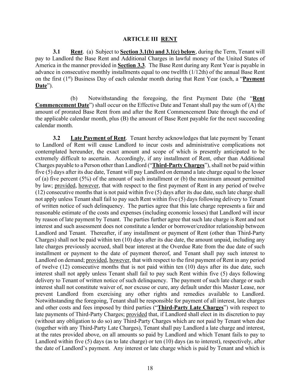 18 ARTICLE III RENT 3.1 Rent. (a) Subject to Section 3.1(b) and 3.1(c) below, during the Term, Tenant will pay to Landlord the Base Rent and Additional Charges in lawful money of the United States of America in the manner provided in Section 3.3. The Base Rent during any Rent Year is payable in advance in consecutive monthly installments equal to one twelfth (1/12th) of the annual Base Rent on the first (1st) Business Day of each calendar month during that Rent Year (each, a “Payment Date”). (b) Notwithstanding the foregoing, the first Payment Date (the “Rent Commencement Date”) shall occur on the Effective Date and Tenant shall pay the sum of (A) the amount of prorated Base Rent from and after the Rent Commencement Date through the end of the applicable calendar month, plus (B) the amount of Base Rent payable for the next succeeding calendar month. 3.2 Late Payment of Rent. Tenant hereby acknowledges that late payment by Tenant to Landlord of Rent will cause Landlord to incur costs and administrative complications not contemplated hereunder, the exact amount and scope of which is presently anticipated to be extremely difficult to ascertain. Accordingly, if any installment of Rent, other than Additional Charges payable to a Person other than Landlord (“Third-Party Charges”), shall not be paid within five (5) days after its due date, Tenant will pay Landlord on demand a late charge equal to the lesser of (a) five percent (5%) of the amount of such installment or (b) the maximum amount permitted by law; provided, however, that with respect to the first payment of Rent in any period of twelve (12) consecutive months that is not paid within five (5) days after its due date, such late charge shall not apply unless Tenant shall fail to pay such Rent within five (5) days following delivery to Tenant of written notice of such delinquency. The parties agree that this late charge represents a fair and reasonable estimate of the costs and expenses (including economic losses) that Landlord will incur by reason of late payment by Tenant. The parties further agree that such late charge is Rent and not interest and such assessment does not constitute a lender or borrower/creditor relationship between Landlord and Tenant. Thereafter, if any installment or payment of Rent (other than Third-Party Charges) shall not be paid within ten (10) days after its due date, the amount unpaid, including any late charges previously accrued, shall bear interest at the Overdue Rate from the due date of such installment or payment to the date of payment thereof, and Tenant shall pay such interest to Landlord on demand; provided, however, that with respect to the first payment of Rent in any period of twelve (12) consecutive months that is not paid within ten (10) days after its due date, such interest shall not apply unless Tenant shall fail to pay such Rent within five (5) days following delivery to Tenant of written notice of such delinquency. The payment of such late charge or such interest shall not constitute waiver of, nor excuse or cure, any default under this Master Lease, nor prevent Landlord from exercising any other rights and remedies available to Landlord. Notwithstanding the foregoing, Tenant shall be responsible for payment of all interest, late charges and other costs and fees imposed by third parties (“Third-Party Late Charges”) with respect to late payments of Third-Party Charges; provided that, if Landlord shall elect in its discretion to pay (without any obligation to do so) any Third-Party Charges which are not paid by Tenant when due (together with any Third-Party Late Charges), Tenant shall pay Landlord a late charge and interest, at the rates provided above, on all amounts so paid by Landlord and which Tenant fails to pay to Landlord within five (5) days (as to late charge) or ten (10) days (as to interest), respectively, after the date of Landlord’s payment. Any interest or late charge which is paid by Tenant and which is