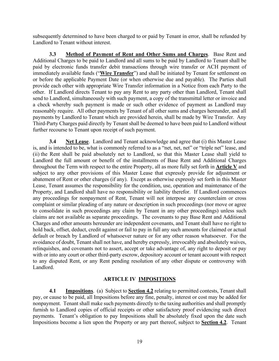 19 subsequently determined to have been charged to or paid by Tenant in error, shall be refunded by Landlord to Tenant without interest. 3.3 Method of Payment of Rent and Other Sums and Charges. Base Rent and Additional Charges to be paid to Landlord and all sums to be paid by Landlord to Tenant shall be paid by electronic funds transfer debit transactions through wire transfer or ACH payment of immediately available funds (“Wire Transfer”) and shall be initiated by Tenant for settlement on or before the applicable Payment Date (or when otherwise due and payable). The Parties shall provide each other with appropriate Wire Transfer information in a Notice from each Party to the other. If Landlord directs Tenant to pay any Rent to any party other than Landlord, Tenant shall send to Landlord, simultaneously with such payment, a copy of the transmittal letter or invoice and a check whereby such payment is made or such other evidence of payment as Landlord may reasonably require. All other payments by Tenant of all other sums and charges hereunder, and all payments by Landlord to Tenant which are provided herein, shall be made by Wire Transfer. Any Third-Party Charges paid directly by Tenant shall be deemed to have been paid to Landlord without further recourse to Tenant upon receipt of such payment. 3.4 Net Lease. Landlord and Tenant acknowledge and agree that (i) this Master Lease is, and is intended to be, what is commonly referred to as a “net, net, net” or “triple net” lease, and (ii) the Rent shall be paid absolutely net to Landlord, so that this Master Lease shall yield to Landlord the full amount or benefit of the installments of Base Rent and Additional Charges throughout the Term with respect to the entire Property, all as more fully set forth in Article V and subject to any other provisions of this Master Lease that expressly provide for adjustment or abatement of Rent or other charges (if any). Except as otherwise expressly set forth in this Master Lease, Tenant assumes the responsibility for the condition, use, operation and maintenance of the Property, and Landlord shall have no responsibility or liability therefor. If Landlord commences any proceedings for nonpayment of Rent, Tenant will not interpose any counterclaim or cross complaint or similar pleading of any nature or description in such proceedings (nor move or agree to consolidate in such proceedings any claim by Tenant in any other proceedings) unless such claims are not available as separate proceedings. The covenants to pay Base Rent and Additional Charges and other amounts hereunder are independent covenants, and Tenant shall have no right to hold back, offset, deduct, credit against or fail to pay in full any such amounts for claimed or actual default or breach by Landlord of whatsoever nature or for any other reason whatsoever. For the avoidance of doubt, Tenant shall not have, and hereby expressly, irrevocably and absolutely waives, relinquishes, and covenants not to assert, accept or take advantage of, any right to deposit or pay with or into any court or other third-party escrow, depository account or tenant account with respect to any disputed Rent, or any Rent pending resolution of any other dispute or controversy with Landlord. ARTICLE IV IMPOSITIONS 4.1 Impositions. (a) Subject to Section 4.2 relating to permitted contests, Tenant shall pay, or cause to be paid, all Impositions before any fine, penalty, interest or cost may be added for nonpayment. Tenant shall make such payments directly to the taxing authorities and shall promptly furnish to Landlord copies of official receipts or other satisfactory proof evidencing such direct payments. Tenant’s obligation to pay Impositions shall be absolutely fixed upon the date such Impositions become a lien upon the Property or any part thereof, subject to Section 4.2. Tenant