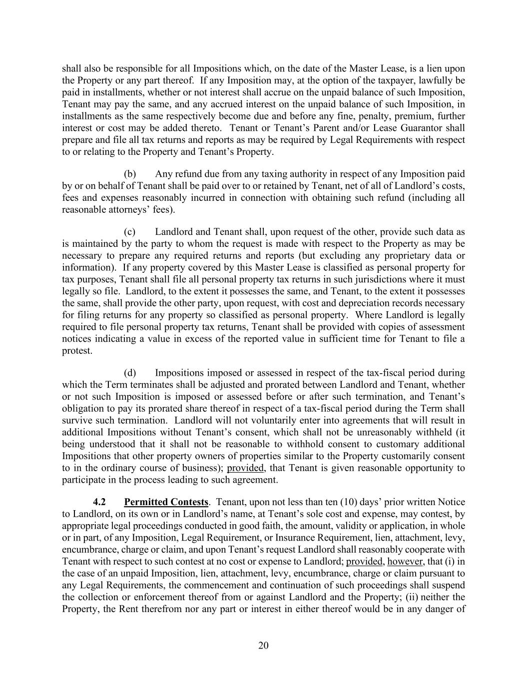 20 shall also be responsible for all Impositions which, on the date of the Master Lease, is a lien upon the Property or any part thereof. If any Imposition may, at the option of the taxpayer, lawfully be paid in installments, whether or not interest shall accrue on the unpaid balance of such Imposition, Tenant may pay the same, and any accrued interest on the unpaid balance of such Imposition, in installments as the same respectively become due and before any fine, penalty, premium, further interest or cost may be added thereto. Tenant or Tenant’s Parent and/or Lease Guarantor shall prepare and file all tax returns and reports as may be required by Legal Requirements with respect to or relating to the Property and Tenant’s Property. (b) Any refund due from any taxing authority in respect of any Imposition paid by or on behalf of Tenant shall be paid over to or retained by Tenant, net of all of Landlord’s costs, fees and expenses reasonably incurred in connection with obtaining such refund (including all reasonable attorneys’ fees). (c) Landlord and Tenant shall, upon request of the other, provide such data as is maintained by the party to whom the request is made with respect to the Property as may be necessary to prepare any required returns and reports (but excluding any proprietary data or information). If any property covered by this Master Lease is classified as personal property for tax purposes, Tenant shall file all personal property tax returns in such jurisdictions where it must legally so file. Landlord, to the extent it possesses the same, and Tenant, to the extent it possesses the same, shall provide the other party, upon request, with cost and depreciation records necessary for filing returns for any property so classified as personal property. Where Landlord is legally required to file personal property tax returns, Tenant shall be provided with copies of assessment notices indicating a value in excess of the reported value in sufficient time for Tenant to file a protest. (d) Impositions imposed or assessed in respect of the tax-fiscal period during which the Term terminates shall be adjusted and prorated between Landlord and Tenant, whether or not such Imposition is imposed or assessed before or after such termination, and Tenant’s obligation to pay its prorated share thereof in respect of a tax-fiscal period during the Term shall survive such termination. Landlord will not voluntarily enter into agreements that will result in additional Impositions without Tenant’s consent, which shall not be unreasonably withheld (it being understood that it shall not be reasonable to withhold consent to customary additional Impositions that other property owners of properties similar to the Property customarily consent to in the ordinary course of business); provided, that Tenant is given reasonable opportunity to participate in the process leading to such agreement. 4.2 Permitted Contests. Tenant, upon not less than ten (10) days’ prior written Notice to Landlord, on its own or in Landlord’s name, at Tenant’s sole cost and expense, may contest, by appropriate legal proceedings conducted in good faith, the amount, validity or application, in whole or in part, of any Imposition, Legal Requirement, or Insurance Requirement, lien, attachment, levy, encumbrance, charge or claim, and upon Tenant’s request Landlord shall reasonably cooperate with Tenant with respect to such contest at no cost or expense to Landlord; provided, however, that (i) in the case of an unpaid Imposition, lien, attachment, levy, encumbrance, charge or claim pursuant to any Legal Requirements, the commencement and continuation of such proceedings shall suspend the collection or enforcement thereof from or against Landlord and the Property; (ii) neither the Property, the Rent therefrom nor any part or interest in either thereof would be in any danger of