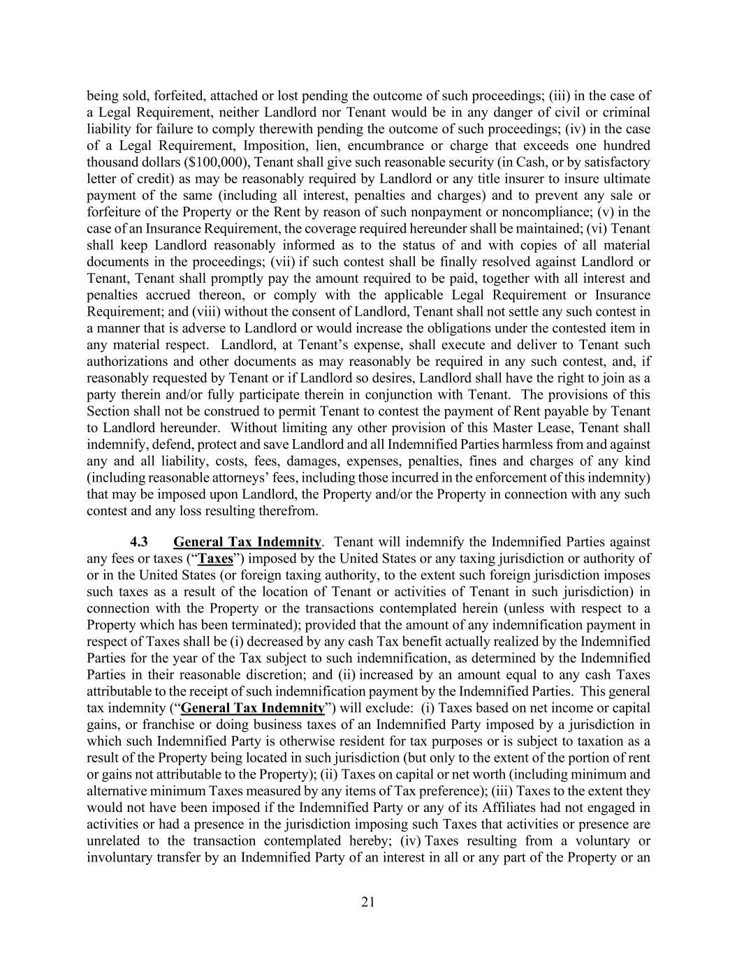 21 being sold, forfeited, attached or lost pending the outcome of such proceedings; (iii) in the case of a Legal Requirement, neither Landlord nor Tenant would be in any danger of civil or criminal liability for failure to comply therewith pending the outcome of such proceedings; (iv) in the case of a Legal Requirement, Imposition, lien, encumbrance or charge that exceeds one hundred thousand dollars ($100,000), Tenant shall give such reasonable security (in Cash, or by satisfactory letter of credit) as may be reasonably required by Landlord or any title insurer to insure ultimate payment of the same (including all interest, penalties and charges) and to prevent any sale or forfeiture of the Property or the Rent by reason of such nonpayment or noncompliance; (v) in the case of an Insurance Requirement, the coverage required hereunder shall be maintained; (vi) Tenant shall keep Landlord reasonably informed as to the status of and with copies of all material documents in the proceedings; (vii) if such contest shall be finally resolved against Landlord or Tenant, Tenant shall promptly pay the amount required to be paid, together with all interest and penalties accrued thereon, or comply with the applicable Legal Requirement or Insurance Requirement; and (viii) without the consent of Landlord, Tenant shall not settle any such contest in a manner that is adverse to Landlord or would increase the obligations under the contested item in any material respect. Landlord, at Tenant’s expense, shall execute and deliver to Tenant such authorizations and other documents as may reasonably be required in any such contest, and, if reasonably requested by Tenant or if Landlord so desires, Landlord shall have the right to join as a party therein and/or fully participate therein in conjunction with Tenant. The provisions of this Section shall not be construed to permit Tenant to contest the payment of Rent payable by Tenant to Landlord hereunder. Without limiting any other provision of this Master Lease, Tenant shall indemnify, defend, protect and save Landlord and all Indemnified Parties harmless from and against any and all liability, costs, fees, damages, expenses, penalties, fines and charges of any kind (including reasonable attorneys’ fees, including those incurred in the enforcement of this indemnity) that may be imposed upon Landlord, the Property and/or the Property in connection with any such contest and any loss resulting therefrom. 4.3 General Tax Indemnity. Tenant will indemnify the Indemnified Parties against any fees or taxes (“Taxes”) imposed by the United States or any taxing jurisdiction or authority of or in the United States (or foreign taxing authority, to the extent such foreign jurisdiction imposes such taxes as a result of the location of Tenant or activities of Tenant in such jurisdiction) in connection with the Property or the transactions contemplated herein (unless with respect to a Property which has been terminated); provided that the amount of any indemnification payment in respect of Taxes shall be (i) decreased by any cash Tax benefit actually realized by the Indemnified Parties for the year of the Tax subject to such indemnification, as determined by the Indemnified Parties in their reasonable discretion; and (ii) increased by an amount equal to any cash Taxes attributable to the receipt of such indemnification payment by the Indemnified Parties. This general tax indemnity (“General Tax Indemnity”) will exclude: (i) Taxes based on net income or capital gains, or franchise or doing business taxes of an Indemnified Party imposed by a jurisdiction in which such Indemnified Party is otherwise resident for tax purposes or is subject to taxation as a result of the Property being located in such jurisdiction (but only to the extent of the portion of rent or gains not attributable to the Property); (ii) Taxes on capital or net worth (including minimum and alternative minimum Taxes measured by any items of Tax preference); (iii) Taxes to the extent they would not have been imposed if the Indemnified Party or any of its Affiliates had not engaged in activities or had a presence in the jurisdiction imposing such Taxes that activities or presence are unrelated to the transaction contemplated hereby; (iv) Taxes resulting from a voluntary or involuntary transfer by an Indemnified Party of an interest in all or any part of the Property or an