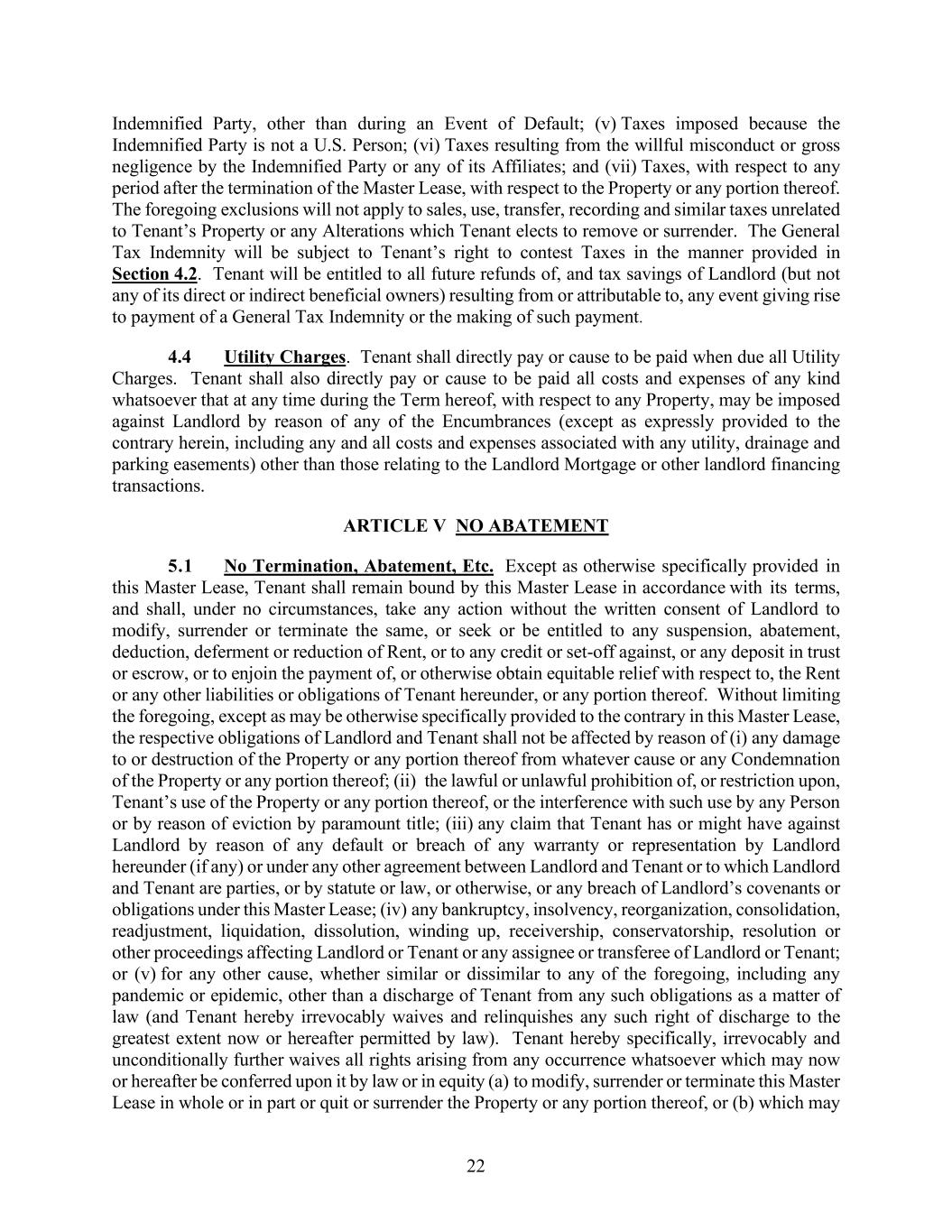 22 Indemnified Party, other than during an Event of Default; (v) Taxes imposed because the Indemnified Party is not a U.S. Person; (vi) Taxes resulting from the willful misconduct or gross negligence by the Indemnified Party or any of its Affiliates; and (vii) Taxes, with respect to any period after the termination of the Master Lease, with respect to the Property or any portion thereof. The foregoing exclusions will not apply to sales, use, transfer, recording and similar taxes unrelated to Tenant’s Property or any Alterations which Tenant elects to remove or surrender. The General Tax Indemnity will be subject to Tenant’s right to contest Taxes in the manner provided in Section 4.2. Tenant will be entitled to all future refunds of, and tax savings of Landlord (but not any of its direct or indirect beneficial owners) resulting from or attributable to, any event giving rise to payment of a General Tax Indemnity or the making of such payment. 4.4 Utility Charges. Tenant shall directly pay or cause to be paid when due all Utility Charges. Tenant shall also directly pay or cause to be paid all costs and expenses of any kind whatsoever that at any time during the Term hereof, with respect to any Property, may be imposed against Landlord by reason of any of the Encumbrances (except as expressly provided to the contrary herein, including any and all costs and expenses associated with any utility, drainage and parking easements) other than those relating to the Landlord Mortgage or other landlord financing transactions. ARTICLE V NO ABATEMENT 5.1 No Termination, Abatement, Etc. Except as otherwise specifically provided in this Master Lease, Tenant shall remain bound by this Master Lease in accordance with its terms, and shall, under no circumstances, take any action without the written consent of Landlord to modify, surrender or terminate the same, or seek or be entitled to any suspension, abatement, deduction, deferment or reduction of Rent, or to any credit or set-off against, or any deposit in trust or escrow, or to enjoin the payment of, or otherwise obtain equitable relief with respect to, the Rent or any other liabilities or obligations of Tenant hereunder, or any portion thereof. Without limiting the foregoing, except as may be otherwise specifically provided to the contrary in this Master Lease, the respective obligations of Landlord and Tenant shall not be affected by reason of (i) any damage to or destruction of the Property or any portion thereof from whatever cause or any Condemnation of the Property or any portion thereof; (ii) the lawful or unlawful prohibition of, or restriction upon, Tenant’s use of the Property or any portion thereof, or the interference with such use by any Person or by reason of eviction by paramount title; (iii) any claim that Tenant has or might have against Landlord by reason of any default or breach of any warranty or representation by Landlord hereunder (if any) or under any other agreement between Landlord and Tenant or to which Landlord and Tenant are parties, or by statute or law, or otherwise, or any breach of Landlord’s covenants or obligations under this Master Lease; (iv) any bankruptcy, insolvency, reorganization, consolidation, readjustment, liquidation, dissolution, winding up, receivership, conservatorship, resolution or other proceedings affecting Landlord or Tenant or any assignee or transferee of Landlord or Tenant; or (v) for any other cause, whether similar or dissimilar to any of the foregoing, including any pandemic or epidemic, other than a discharge of Tenant from any such obligations as a matter of law (and Tenant hereby irrevocably waives and relinquishes any such right of discharge to the greatest extent now or hereafter permitted by law). Tenant hereby specifically, irrevocably and unconditionally further waives all rights arising from any occurrence whatsoever which may now or hereafter be conferred upon it by law or in equity (a) to modify, surrender or terminate this Master Lease in whole or in part or quit or surrender the Property or any portion thereof, or (b) which may