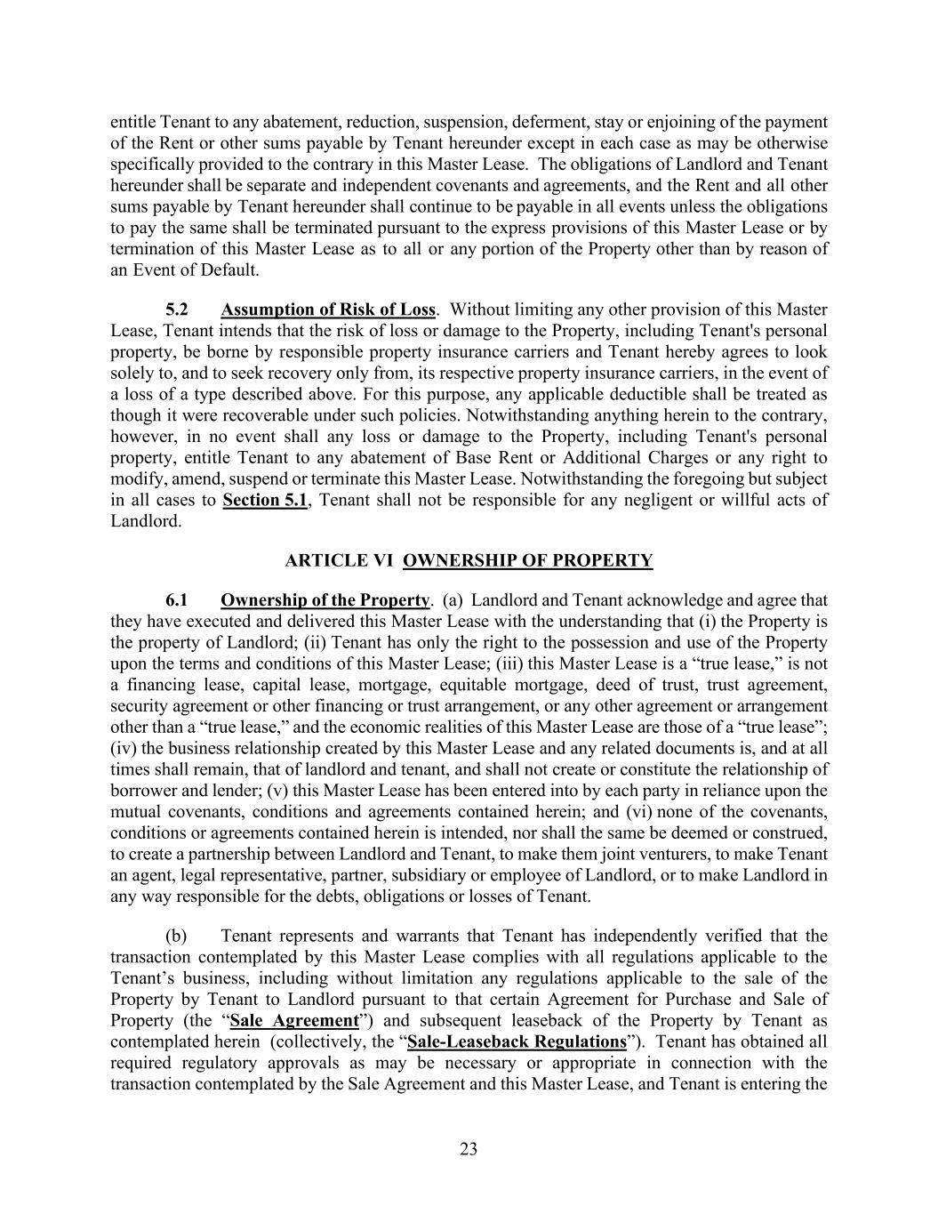 23 entitle Tenant to any abatement, reduction, suspension, deferment, stay or enjoining of the payment of the Rent or other sums payable by Tenant hereunder except in each case as may be otherwise specifically provided to the contrary in this Master Lease. The obligations of Landlord and Tenant hereunder shall be separate and independent covenants and agreements, and the Rent and all other sums payable by Tenant hereunder shall continue to be payable in all events unless the obligations to pay the same shall be terminated pursuant to the express provisions of this Master Lease or by termination of this Master Lease as to all or any portion of the Property other than by reason of an Event of Default. 5.2 Assumption of Risk of Loss. Without limiting any other provision of this Master Lease, Tenant intends that the risk of loss or damage to the Property, including Tenant's personal property, be borne by responsible property insurance carriers and Tenant hereby agrees to look solely to, and to seek recovery only from, its respective property insurance carriers, in the event of a loss of a type described above. For this purpose, any applicable deductible shall be treated as though it were recoverable under such policies. Notwithstanding anything herein to the contrary, however, in no event shall any loss or damage to the Property, including Tenant's personal property, entitle Tenant to any abatement of Base Rent or Additional Charges or any right to modify, amend, suspend or terminate this Master Lease. Notwithstanding the foregoing but subject in all cases to Section 5.1, Tenant shall not be responsible for any negligent or willful acts of Landlord. ARTICLE VI OWNERSHIP OF PROPERTY 6.1 Ownership of the Property. (a) Landlord and Tenant acknowledge and agree that they have executed and delivered this Master Lease with the understanding that (i) the Property is the property of Landlord; (ii) Tenant has only the right to the possession and use of the Property upon the terms and conditions of this Master Lease; (iii) this Master Lease is a “true lease,” is not a financing lease, capital lease, mortgage, equitable mortgage, deed of trust, trust agreement, security agreement or other financing or trust arrangement, or any other agreement or arrangement other than a “true lease,” and the economic realities of this Master Lease are those of a “true lease”; (iv) the business relationship created by this Master Lease and any related documents is, and at all times shall remain, that of landlord and tenant, and shall not create or constitute the relationship of borrower and lender; (v) this Master Lease has been entered into by each party in reliance upon the mutual covenants, conditions and agreements contained herein; and (vi) none of the covenants, conditions or agreements contained herein is intended, nor shall the same be deemed or construed, to create a partnership between Landlord and Tenant, to make them joint venturers, to make Tenant an agent, legal representative, partner, subsidiary or employee of Landlord, or to make Landlord in any way responsible for the debts, obligations or losses of Tenant. (b) Tenant represents and warrants that Tenant has independently verified that the transaction contemplated by this Master Lease complies with all regulations applicable to the Tenant’s business, including without limitation any regulations applicable to the sale of the Property by Tenant to Landlord pursuant to that certain Agreement for Purchase and Sale of Property (the “Sale Agreement”) and subsequent leaseback of the Property by Tenant as contemplated herein (collectively, the “Sale-Leaseback Regulations”). Tenant has obtained all required regulatory approvals as may be necessary or appropriate in connection with the transaction contemplated by the Sale Agreement and this Master Lease, and Tenant is entering the