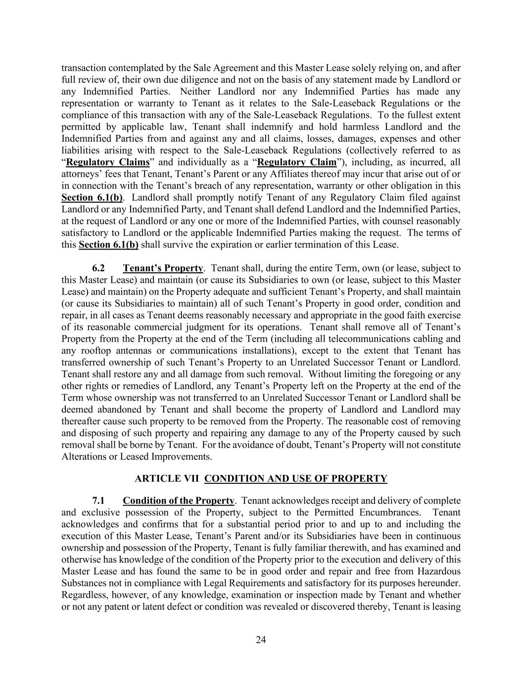 24 transaction contemplated by the Sale Agreement and this Master Lease solely relying on, and after full review of, their own due diligence and not on the basis of any statement made by Landlord or any Indemnified Parties. Neither Landlord nor any Indemnified Parties has made any representation or warranty to Tenant as it relates to the Sale-Leaseback Regulations or the compliance of this transaction with any of the Sale-Leaseback Regulations. To the fullest extent permitted by applicable law, Tenant shall indemnify and hold harmless Landlord and the Indemnified Parties from and against any and all claims, losses, damages, expenses and other liabilities arising with respect to the Sale-Leaseback Regulations (collectively referred to as “Regulatory Claims” and individually as a “Regulatory Claim”), including, as incurred, all attorneys’ fees that Tenant, Tenant’s Parent or any Affiliates thereof may incur that arise out of or in connection with the Tenant’s breach of any representation, warranty or other obligation in this Section 6.1(b). Landlord shall promptly notify Tenant of any Regulatory Claim filed against Landlord or any Indemnified Party, and Tenant shall defend Landlord and the Indemnified Parties, at the request of Landlord or any one or more of the Indemnified Parties, with counsel reasonably satisfactory to Landlord or the applicable Indemnified Parties making the request. The terms of this Section 6.1(b) shall survive the expiration or earlier termination of this Lease. 6.2 Tenant’s Property. Tenant shall, during the entire Term, own (or lease, subject to this Master Lease) and maintain (or cause its Subsidiaries to own (or lease, subject to this Master Lease) and maintain) on the Property adequate and sufficient Tenant’s Property, and shall maintain (or cause its Subsidiaries to maintain) all of such Tenant’s Property in good order, condition and repair, in all cases as Tenant deems reasonably necessary and appropriate in the good faith exercise of its reasonable commercial judgment for its operations. Tenant shall remove all of Tenant’s Property from the Property at the end of the Term (including all telecommunications cabling and any rooftop antennas or communications installations), except to the extent that Tenant has transferred ownership of such Tenant’s Property to an Unrelated Successor Tenant or Landlord. Tenant shall restore any and all damage from such removal. Without limiting the foregoing or any other rights or remedies of Landlord, any Tenant’s Property left on the Property at the end of the Term whose ownership was not transferred to an Unrelated Successor Tenant or Landlord shall be deemed abandoned by Tenant and shall become the property of Landlord and Landlord may thereafter cause such property to be removed from the Property. The reasonable cost of removing and disposing of such property and repairing any damage to any of the Property caused by such removal shall be borne by Tenant. For the avoidance of doubt, Tenant’s Property will not constitute Alterations or Leased Improvements. ARTICLE VII CONDITION AND USE OF PROPERTY 7.1 Condition of the Property. Tenant acknowledges receipt and delivery of complete and exclusive possession of the Property, subject to the Permitted Encumbrances. Tenant acknowledges and confirms that for a substantial period prior to and up to and including the execution of this Master Lease, Tenant’s Parent and/or its Subsidiaries have been in continuous ownership and possession of the Property, Tenant is fully familiar therewith, and has examined and otherwise has knowledge of the condition of the Property prior to the execution and delivery of this Master Lease and has found the same to be in good order and repair and free from Hazardous Substances not in compliance with Legal Requirements and satisfactory for its purposes hereunder. Regardless, however, of any knowledge, examination or inspection made by Tenant and whether or not any patent or latent defect or condition was revealed or discovered thereby, Tenant is leasing
