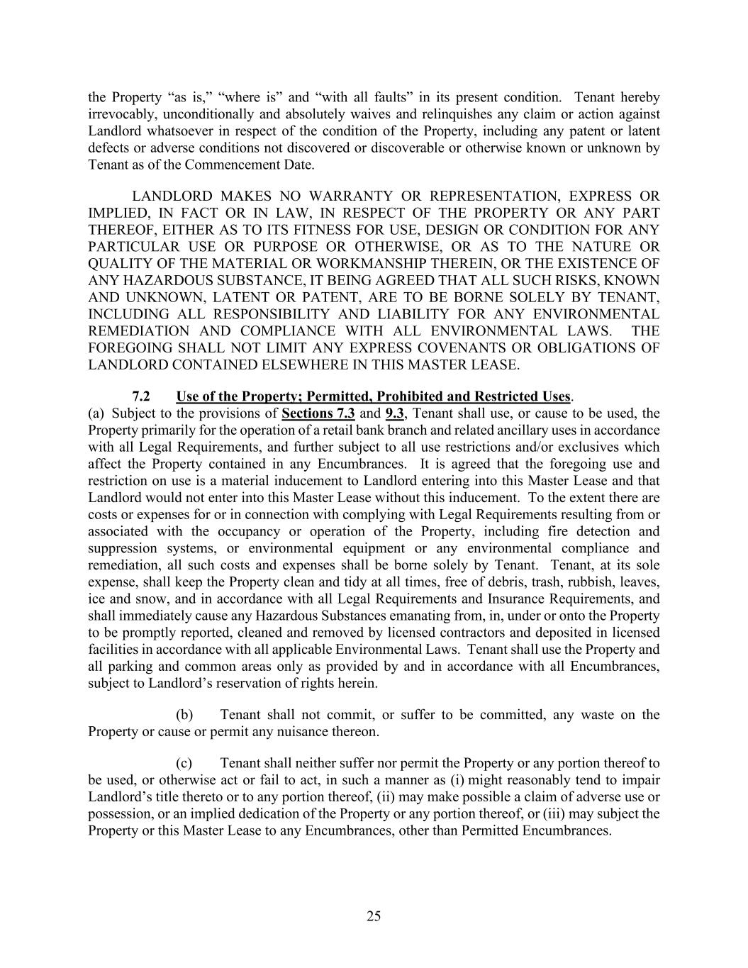 25 the Property “as is,” “where is” and “with all faults” in its present condition. Tenant hereby irrevocably, unconditionally and absolutely waives and relinquishes any claim or action against Landlord whatsoever in respect of the condition of the Property, including any patent or latent defects or adverse conditions not discovered or discoverable or otherwise known or unknown by Tenant as of the Commencement Date. LANDLORD MAKES NO WARRANTY OR REPRESENTATION, EXPRESS OR IMPLIED, IN FACT OR IN LAW, IN RESPECT OF THE PROPERTY OR ANY PART THEREOF, EITHER AS TO ITS FITNESS FOR USE, DESIGN OR CONDITION FOR ANY PARTICULAR USE OR PURPOSE OR OTHERWISE, OR AS TO THE NATURE OR QUALITY OF THE MATERIAL OR WORKMANSHIP THEREIN, OR THE EXISTENCE OF ANY HAZARDOUS SUBSTANCE, IT BEING AGREED THAT ALL SUCH RISKS, KNOWN AND UNKNOWN, LATENT OR PATENT, ARE TO BE BORNE SOLELY BY TENANT, INCLUDING ALL RESPONSIBILITY AND LIABILITY FOR ANY ENVIRONMENTAL REMEDIATION AND COMPLIANCE WITH ALL ENVIRONMENTAL LAWS. THE FOREGOING SHALL NOT LIMIT ANY EXPRESS COVENANTS OR OBLIGATIONS OF LANDLORD CONTAINED ELSEWHERE IN THIS MASTER LEASE. 7.2 Use of the Property; Permitted, Prohibited and Restricted Uses. (a) Subject to the provisions of Sections 7.3 and 9.3, Tenant shall use, or cause to be used, the Property primarily for the operation of a retail bank branch and related ancillary uses in accordance with all Legal Requirements, and further subject to all use restrictions and/or exclusives which affect the Property contained in any Encumbrances. It is agreed that the foregoing use and restriction on use is a material inducement to Landlord entering into this Master Lease and that Landlord would not enter into this Master Lease without this inducement. To the extent there are costs or expenses for or in connection with complying with Legal Requirements resulting from or associated with the occupancy or operation of the Property, including fire detection and suppression systems, or environmental equipment or any environmental compliance and remediation, all such costs and expenses shall be borne solely by Tenant. Tenant, at its sole expense, shall keep the Property clean and tidy at all times, free of debris, trash, rubbish, leaves, ice and snow, and in accordance with all Legal Requirements and Insurance Requirements, and shall immediately cause any Hazardous Substances emanating from, in, under or onto the Property to be promptly reported, cleaned and removed by licensed contractors and deposited in licensed facilities in accordance with all applicable Environmental Laws. Tenant shall use the Property and all parking and common areas only as provided by and in accordance with all Encumbrances, subject to Landlord’s reservation of rights herein. (b) Tenant shall not commit, or suffer to be committed, any waste on the Property or cause or permit any nuisance thereon. (c) Tenant shall neither suffer nor permit the Property or any portion thereof to be used, or otherwise act or fail to act, in such a manner as (i) might reasonably tend to impair Landlord’s title thereto or to any portion thereof, (ii) may make possible a claim of adverse use or possession, or an implied dedication of the Property or any portion thereof, or (iii) may subject the Property or this Master Lease to any Encumbrances, other than Permitted Encumbrances.