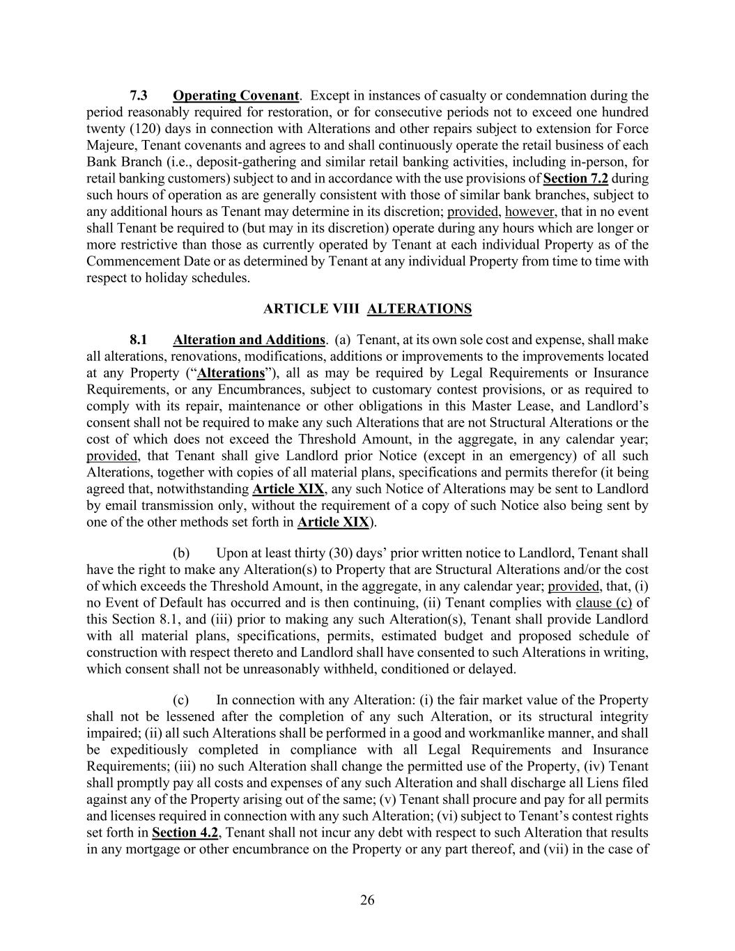 26 7.3 Operating Covenant. Except in instances of casualty or condemnation during the period reasonably required for restoration, or for consecutive periods not to exceed one hundred twenty (120) days in connection with Alterations and other repairs subject to extension for Force Majeure, Tenant covenants and agrees to and shall continuously operate the retail business of each Bank Branch (i.e., deposit-gathering and similar retail banking activities, including in-person, for retail banking customers) subject to and in accordance with the use provisions of Section 7.2 during such hours of operation as are generally consistent with those of similar bank branches, subject to any additional hours as Tenant may determine in its discretion; provided, however, that in no event shall Tenant be required to (but may in its discretion) operate during any hours which are longer or more restrictive than those as currently operated by Tenant at each individual Property as of the Commencement Date or as determined by Tenant at any individual Property from time to time with respect to holiday schedules. ARTICLE VIII ALTERATIONS 8.1 Alteration and Additions. (a) Tenant, at its own sole cost and expense, shall make all alterations, renovations, modifications, additions or improvements to the improvements located at any Property (“Alterations”), all as may be required by Legal Requirements or Insurance Requirements, or any Encumbrances, subject to customary contest provisions, or as required to comply with its repair, maintenance or other obligations in this Master Lease, and Landlord’s consent shall not be required to make any such Alterations that are not Structural Alterations or the cost of which does not exceed the Threshold Amount, in the aggregate, in any calendar year; provided, that Tenant shall give Landlord prior Notice (except in an emergency) of all such Alterations, together with copies of all material plans, specifications and permits therefor (it being agreed that, notwithstanding Article XIX, any such Notice of Alterations may be sent to Landlord by email transmission only, without the requirement of a copy of such Notice also being sent by one of the other methods set forth in Article XIX). (b) Upon at least thirty (30) days’ prior written notice to Landlord, Tenant shall have the right to make any Alteration(s) to Property that are Structural Alterations and/or the cost of which exceeds the Threshold Amount, in the aggregate, in any calendar year; provided, that, (i) no Event of Default has occurred and is then continuing, (ii) Tenant complies with clause (c) of this Section 8.1, and (iii) prior to making any such Alteration(s), Tenant shall provide Landlord with all material plans, specifications, permits, estimated budget and proposed schedule of construction with respect thereto and Landlord shall have consented to such Alterations in writing, which consent shall not be unreasonably withheld, conditioned or delayed. (c) In connection with any Alteration: (i) the fair market value of the Property shall not be lessened after the completion of any such Alteration, or its structural integrity impaired; (ii) all such Alterations shall be performed in a good and workmanlike manner, and shall be expeditiously completed in compliance with all Legal Requirements and Insurance Requirements; (iii) no such Alteration shall change the permitted use of the Property, (iv) Tenant shall promptly pay all costs and expenses of any such Alteration and shall discharge all Liens filed against any of the Property arising out of the same; (v) Tenant shall procure and pay for all permits and licenses required in connection with any such Alteration; (vi) subject to Tenant’s contest rights set forth in Section 4.2, Tenant shall not incur any debt with respect to such Alteration that results in any mortgage or other encumbrance on the Property or any part thereof, and (vii) in the case of