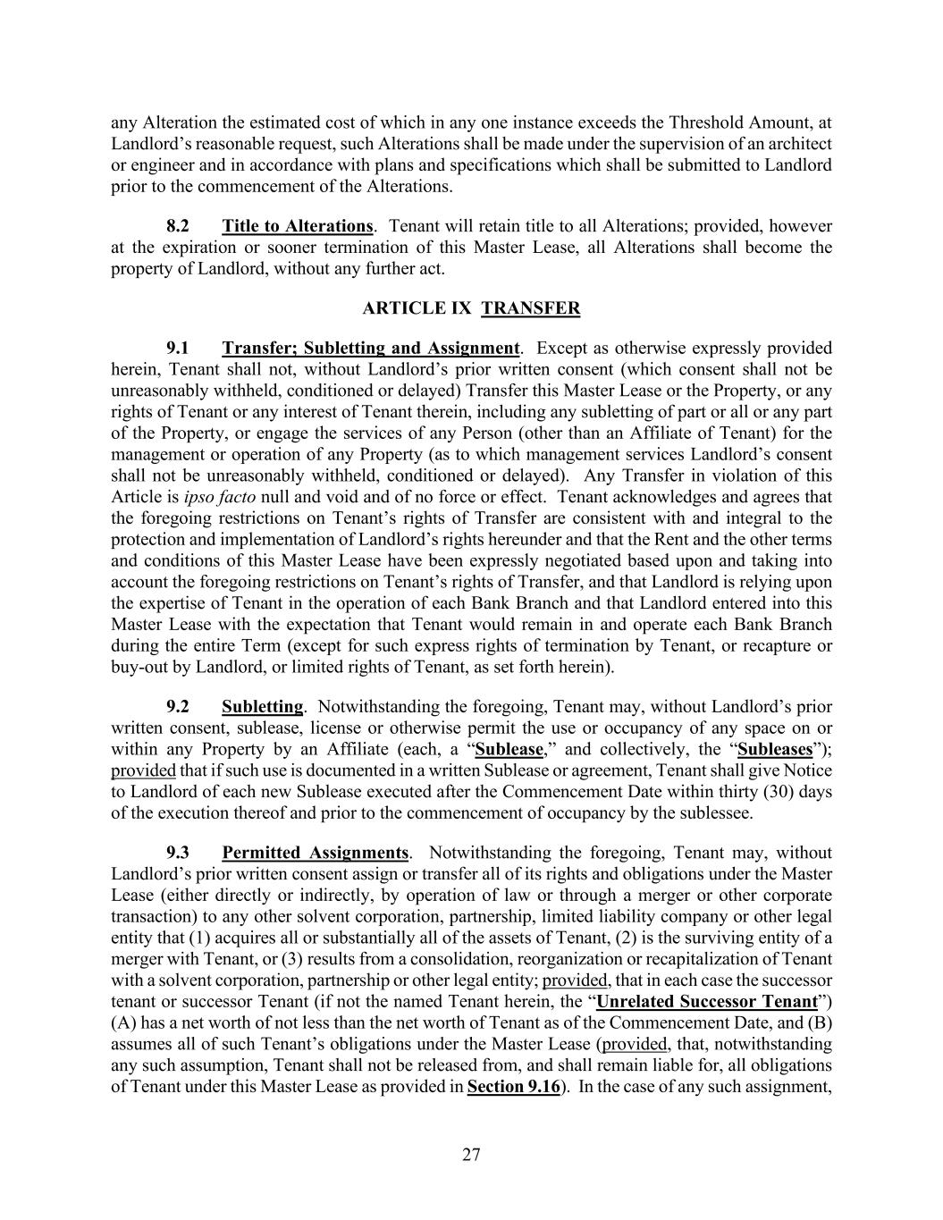 27 any Alteration the estimated cost of which in any one instance exceeds the Threshold Amount, at Landlord’s reasonable request, such Alterations shall be made under the supervision of an architect or engineer and in accordance with plans and specifications which shall be submitted to Landlord prior to the commencement of the Alterations. 8.2 Title to Alterations. Tenant will retain title to all Alterations; provided, however at the expiration or sooner termination of this Master Lease, all Alterations shall become the property of Landlord, without any further act. ARTICLE IX TRANSFER 9.1 Transfer; Subletting and Assignment. Except as otherwise expressly provided herein, Tenant shall not, without Landlord’s prior written consent (which consent shall not be unreasonably withheld, conditioned or delayed) Transfer this Master Lease or the Property, or any rights of Tenant or any interest of Tenant therein, including any subletting of part or all or any part of the Property, or engage the services of any Person (other than an Affiliate of Tenant) for the management or operation of any Property (as to which management services Landlord’s consent shall not be unreasonably withheld, conditioned or delayed). Any Transfer in violation of this Article is ipso facto null and void and of no force or effect. Tenant acknowledges and agrees that the foregoing restrictions on Tenant’s rights of Transfer are consistent with and integral to the protection and implementation of Landlord’s rights hereunder and that the Rent and the other terms and conditions of this Master Lease have been expressly negotiated based upon and taking into account the foregoing restrictions on Tenant’s rights of Transfer, and that Landlord is relying upon the expertise of Tenant in the operation of each Bank Branch and that Landlord entered into this Master Lease with the expectation that Tenant would remain in and operate each Bank Branch during the entire Term (except for such express rights of termination by Tenant, or recapture or buy-out by Landlord, or limited rights of Tenant, as set forth herein). 9.2 Subletting. Notwithstanding the foregoing, Tenant may, without Landlord’s prior written consent, sublease, license or otherwise permit the use or occupancy of any space on or within any Property by an Affiliate (each, a “Sublease,” and collectively, the “Subleases”); provided that if such use is documented in a written Sublease or agreement, Tenant shall give Notice to Landlord of each new Sublease executed after the Commencement Date within thirty (30) days of the execution thereof and prior to the commencement of occupancy by the sublessee. 9.3 Permitted Assignments. Notwithstanding the foregoing, Tenant may, without Landlord’s prior written consent assign or transfer all of its rights and obligations under the Master Lease (either directly or indirectly, by operation of law or through a merger or other corporate transaction) to any other solvent corporation, partnership, limited liability company or other legal entity that (1) acquires all or substantially all of the assets of Tenant, (2) is the surviving entity of a merger with Tenant, or (3) results from a consolidation, reorganization or recapitalization of Tenant with a solvent corporation, partnership or other legal entity; provided, that in each case the successor tenant or successor Tenant (if not the named Tenant herein, the “Unrelated Successor Tenant”) (A) has a net worth of not less than the net worth of Tenant as of the Commencement Date, and (B) assumes all of such Tenant’s obligations under the Master Lease (provided, that, notwithstanding any such assumption, Tenant shall not be released from, and shall remain liable for, all obligations of Tenant under this Master Lease as provided in Section 9.16). In the case of any such assignment,