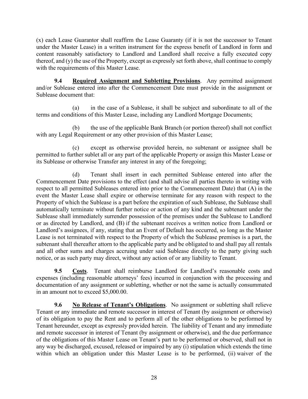 28 (x) each Lease Guarantor shall reaffirm the Lease Guaranty (if it is not the successor to Tenant under the Master Lease) in a written instrument for the express benefit of Landlord in form and content reasonably satisfactory to Landlord and Landlord shall receive a fully executed copy thereof, and (y) the use of the Property, except as expressly set forth above, shall continue to comply with the requirements of this Master Lease. 9.4 Required Assignment and Subletting Provisions. Any permitted assignment and/or Sublease entered into after the Commencement Date must provide in the assignment or Sublease document that: (a) in the case of a Sublease, it shall be subject and subordinate to all of the terms and conditions of this Master Lease, including any Landlord Mortgage Documents; (b) the use of the applicable Bank Branch (or portion thereof) shall not conflict with any Legal Requirement or any other provision of this Master Lease; (c) except as otherwise provided herein, no subtenant or assignee shall be permitted to further sublet all or any part of the applicable Property or assign this Master Lease or its Sublease or otherwise Transfer any interest in any of the foregoing; (d) Tenant shall insert in each permitted Sublease entered into after the Commencement Date provisions to the effect (and shall advise all parties thereto in writing with respect to all permitted Subleases entered into prior to the Commencement Date) that (A) in the event the Master Lease shall expire or otherwise terminate for any reason with respect to the Property of which the Sublease is a part before the expiration of such Sublease, the Sublease shall automatically terminate without further notice or action of any kind and the subtenant under the Sublease shall immediately surrender possession of the premises under the Sublease to Landlord or as directed by Landlord, and (B) if the subtenant receives a written notice from Landlord or Landlord’s assignees, if any, stating that an Event of Default has occurred, so long as the Master Lease is not terminated with respect to the Property of which the Sublease premises is a part, the subtenant shall thereafter attorn to the applicable party and be obligated to and shall pay all rentals and all other sums and charges accruing under said Sublease directly to the party giving such notice, or as such party may direct, without any action of or any liability to Tenant. 9.5 Costs. Tenant shall reimburse Landlord for Landlord’s reasonable costs and expenses (including reasonable attorneys’ fees) incurred in conjunction with the processing and documentation of any assignment or subletting, whether or not the same is actually consummated in an amount not to exceed $5,000.00. 9.6 No Release of Tenant’s Obligations. No assignment or subletting shall relieve Tenant or any immediate and remote successor in interest of Tenant (by assignment or otherwise) of its obligation to pay the Rent and to perform all of the other obligations to be performed by Tenant hereunder, except as expressly provided herein. The liability of Tenant and any immediate and remote successor in interest of Tenant (by assignment or otherwise), and the due performance of the obligations of this Master Lease on Tenant’s part to be performed or observed, shall not in any way be discharged, excused, released or impaired by any (i) stipulation which extends the time within which an obligation under this Master Lease is to be performed, (ii) waiver of the