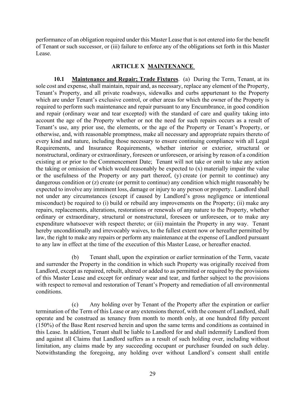 29 performance of an obligation required under this Master Lease that is not entered into for the benefit of Tenant or such successor, or (iii) failure to enforce any of the obligations set forth in this Master Lease. ARTICLE X MAINTENANCE 10.1 Maintenance and Repair; Trade Fixtures. (a) During the Term, Tenant, at its sole cost and expense, shall maintain, repair and, as necessary, replace any element of the Property, Tenant’s Property, and all private roadways, sidewalks and curbs appurtenant to the Property which are under Tenant’s exclusive control, or other areas for which the owner of the Property is required to perform such maintenance and repair pursuant to any Encumbrance, in good condition and repair (ordinary wear and tear excepted) with the standard of care and quality taking into account the age of the Property whether or not the need for such repairs occurs as a result of Tenant’s use, any prior use, the elements, or the age of the Property or Tenant’s Property, or otherwise, and, with reasonable promptness, make all necessary and appropriate repairs thereto of every kind and nature, including those necessary to ensure continuing compliance with all Legal Requirements, and Insurance Requirements, whether interior or exterior, structural or nonstructural, ordinary or extraordinary, foreseen or unforeseen, or arising by reason of a condition existing at or prior to the Commencement Date; Tenant will not take or omit to take any action the taking or omission of which would reasonably be expected to (x) materially impair the value or the usefulness of the Property or any part thereof, (y) create (or permit to continue) any dangerous condition or (z) create (or permit to continue) any condition which might reasonably be expected to involve any imminent loss, damage or injury to any person or property. Landlord shall not under any circumstances (except if caused by Landlord’s gross negligence or intentional misconduct) be required to (i) build or rebuild any improvements on the Property; (ii) make any repairs, replacements, alterations, restorations or renewals of any nature to the Property, whether ordinary or extraordinary, structural or nonstructural, foreseen or unforeseen, or to make any expenditure whatsoever with respect thereto; or (iii) maintain the Property in any way. Tenant hereby unconditionally and irrevocably waives, to the fullest extent now or hereafter permitted by law, the right to make any repairs or perform any maintenance at the expense of Landlord pursuant to any law in effect at the time of the execution of this Master Lease, or hereafter enacted. (b) Tenant shall, upon the expiration or earlier termination of the Term, vacate and surrender the Property in the condition in which such Property was originally received from Landlord, except as repaired, rebuilt, altered or added to as permitted or required by the provisions of this Master Lease and except for ordinary wear and tear, and further subject to the provisions with respect to removal and restoration of Tenant’s Property and remediation of all environmental conditions. (c) Any holding over by Tenant of the Property after the expiration or earlier termination of the Term of this Lease or any extensions thereof, with the consent of Landlord, shall operate and be construed as tenancy from month to month only, at one hundred fifty percent (150%) of the Base Rent reserved herein and upon the same terms and conditions as contained in this Lease. In addition, Tenant shall be liable to Landlord for and shall indemnify Landlord from and against all Claims that Landlord suffers as a result of such holding over, including without limitation, any claims made by any succeeding occupant or purchaser founded on such delay. Notwithstanding the foregoing, any holding over without Landlord’s consent shall entitle