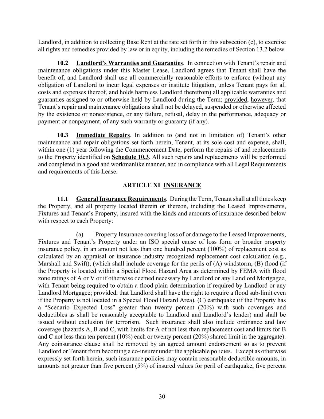 30 Landlord, in addition to collecting Base Rent at the rate set forth in this subsection (c), to exercise all rights and remedies provided by law or in equity, including the remedies of Section 13.2 below. 10.2 Landlord’s Warranties and Guaranties. In connection with Tenant’s repair and maintenance obligations under this Master Lease, Landlord agrees that Tenant shall have the benefit of, and Landlord shall use all commercially reasonable efforts to enforce (without any obligation of Landlord to incur legal expenses or institute litigation, unless Tenant pays for all costs and expenses thereof, and holds harmless Landlord therefrom) all applicable warranties and guaranties assigned to or otherwise held by Landlord during the Term; provided, however, that Tenant’s repair and maintenance obligations shall not be delayed, suspended or otherwise affected by the existence or nonexistence, or any failure, refusal, delay in the performance, adequacy or payment or nonpayment, of any such warranty or guaranty (if any). 10.3 Immediate Repairs. In addition to (and not in limitation of) Tenant’s other maintenance and repair obligations set forth herein, Tenant, at its sole cost and expense, shall, within one (1) year following the Commencement Date, perform the repairs of and replacements to the Property identified on Schedule 10.3. All such repairs and replacements will be performed and completed in a good and workmanlike manner, and in compliance with all Legal Requirements and requirements of this Lease. ARTICLE XI INSURANCE 11.1 General Insurance Requirements. During the Term, Tenant shall at all times keep the Property, and all property located therein or thereon, including the Leased Improvements, Fixtures and Tenant’s Property, insured with the kinds and amounts of insurance described below with respect to each Property: (a) Property Insurance covering loss of or damage to the Leased Improvements, Fixtures and Tenant’s Property under an ISO special cause of loss form or broader property insurance policy, in an amount not less than one hundred percent (100%) of replacement cost as calculated by an appraisal or insurance industry recognized replacement cost calculation (e.g., Marshall and Swift), (which shall include coverage for the perils of (A) windstorm, (B) flood (if the Property is located within a Special Flood Hazard Area as determined by FEMA with flood zone ratings of A or V or if otherwise deemed necessary by Landlord or any Landlord Mortgagee, with Tenant being required to obtain a flood plain determination if required by Landlord or any Landlord Mortgagee; provided, that Landlord shall have the right to require a flood sub-limit even if the Property is not located in a Special Flood Hazard Area), (C) earthquake (if the Property has a “Scenario Expected Loss” greater than twenty percent (20%) with such coverages and deductibles as shall be reasonably acceptable to Landlord and Landlord’s lender) and shall be issued without exclusion for terrorism. Such insurance shall also include ordinance and law coverage (hazards A, B and C, with limits for A of not less than replacement cost and limits for B and C not less than ten percent (10%) each or twenty percent (20%) shared limit in the aggregate). Any coinsurance clause shall be removed by an agreed amount endorsement so as to prevent Landlord or Tenant from becoming a co-insurer under the applicable policies. Except as otherwise expressly set forth herein, such insurance policies may contain reasonable deductible amounts, in amounts not greater than five percent (5%) of insured values for peril of earthquake, five percent