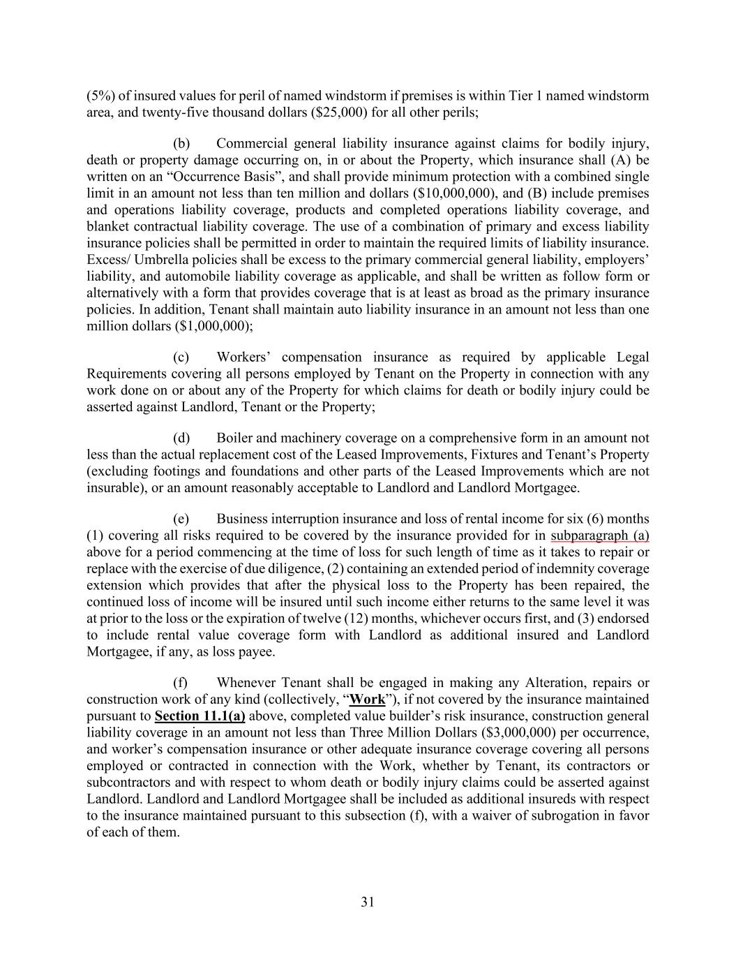 31 (5%) of insured values for peril of named windstorm if premises is within Tier 1 named windstorm area, and twenty-five thousand dollars ($25,000) for all other perils; (b) Commercial general liability insurance against claims for bodily injury, death or property damage occurring on, in or about the Property, which insurance shall (A) be written on an “Occurrence Basis”, and shall provide minimum protection with a combined single limit in an amount not less than ten million and dollars ($10,000,000), and (B) include premises and operations liability coverage, products and completed operations liability coverage, and blanket contractual liability coverage. The use of a combination of primary and excess liability insurance policies shall be permitted in order to maintain the required limits of liability insurance. Excess/ Umbrella policies shall be excess to the primary commercial general liability, employers’ liability, and automobile liability coverage as applicable, and shall be written as follow form or alternatively with a form that provides coverage that is at least as broad as the primary insurance policies. In addition, Tenant shall maintain auto liability insurance in an amount not less than one million dollars ($1,000,000); (c) Workers’ compensation insurance as required by applicable Legal Requirements covering all persons employed by Tenant on the Property in connection with any work done on or about any of the Property for which claims for death or bodily injury could be asserted against Landlord, Tenant or the Property; (d) Boiler and machinery coverage on a comprehensive form in an amount not less than the actual replacement cost of the Leased Improvements, Fixtures and Tenant’s Property (excluding footings and foundations and other parts of the Leased Improvements which are not insurable), or an amount reasonably acceptable to Landlord and Landlord Mortgagee. (e) Business interruption insurance and loss of rental income for six (6) months (1) covering all risks required to be covered by the insurance provided for in subparagraph (a) above for a period commencing at the time of loss for such length of time as it takes to repair or replace with the exercise of due diligence, (2) containing an extended period of indemnity coverage extension which provides that after the physical loss to the Property has been repaired, the continued loss of income will be insured until such income either returns to the same level it was at prior to the loss or the expiration of twelve (12) months, whichever occurs first, and (3) endorsed to include rental value coverage form with Landlord as additional insured and Landlord Mortgagee, if any, as loss payee. (f) Whenever Tenant shall be engaged in making any Alteration, repairs or construction work of any kind (collectively, “Work”), if not covered by the insurance maintained pursuant to Section 11.1(a) above, completed value builder’s risk insurance, construction general liability coverage in an amount not less than Three Million Dollars ($3,000,000) per occurrence, and worker’s compensation insurance or other adequate insurance coverage covering all persons employed or contracted in connection with the Work, whether by Tenant, its contractors or subcontractors and with respect to whom death or bodily injury claims could be asserted against Landlord. Landlord and Landlord Mortgagee shall be included as additional insureds with respect to the insurance maintained pursuant to this subsection (f), with a waiver of subrogation in favor of each of them.