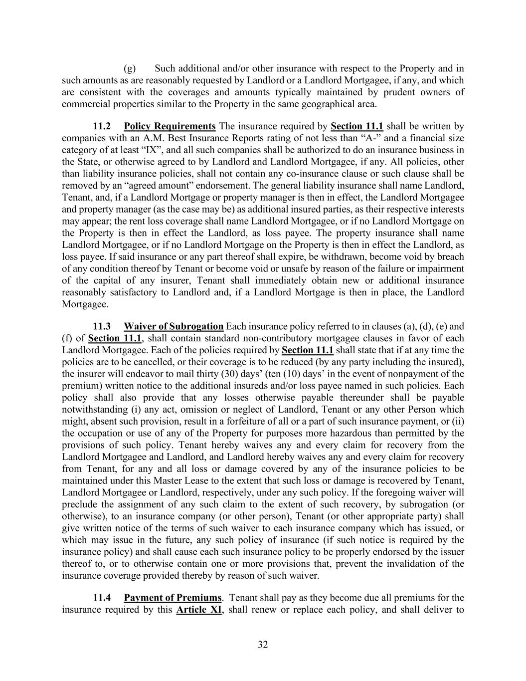 32 (g) Such additional and/or other insurance with respect to the Property and in such amounts as are reasonably requested by Landlord or a Landlord Mortgagee, if any, and which are consistent with the coverages and amounts typically maintained by prudent owners of commercial properties similar to the Property in the same geographical area. 11.2 Policy Requirements The insurance required by Section 11.1 shall be written by companies with an A.M. Best Insurance Reports rating of not less than “A-” and a financial size category of at least “IX”, and all such companies shall be authorized to do an insurance business in the State, or otherwise agreed to by Landlord and Landlord Mortgagee, if any. All policies, other than liability insurance policies, shall not contain any co-insurance clause or such clause shall be removed by an “agreed amount” endorsement. The general liability insurance shall name Landlord, Tenant, and, if a Landlord Mortgage or property manager is then in effect, the Landlord Mortgagee and property manager (as the case may be) as additional insured parties, as their respective interests may appear; the rent loss coverage shall name Landlord Mortgagee, or if no Landlord Mortgage on the Property is then in effect the Landlord, as loss payee. The property insurance shall name Landlord Mortgagee, or if no Landlord Mortgage on the Property is then in effect the Landlord, as loss payee. If said insurance or any part thereof shall expire, be withdrawn, become void by breach of any condition thereof by Tenant or become void or unsafe by reason of the failure or impairment of the capital of any insurer, Tenant shall immediately obtain new or additional insurance reasonably satisfactory to Landlord and, if a Landlord Mortgage is then in place, the Landlord Mortgagee. 11.3 Waiver of Subrogation Each insurance policy referred to in clauses (a), (d), (e) and (f) of Section 11.1, shall contain standard non-contributory mortgagee clauses in favor of each Landlord Mortgagee. Each of the policies required by Section 11.1 shall state that if at any time the policies are to be cancelled, or their coverage is to be reduced (by any party including the insured), the insurer will endeavor to mail thirty (30) days’ (ten (10) days’ in the event of nonpayment of the premium) written notice to the additional insureds and/or loss payee named in such policies. Each policy shall also provide that any losses otherwise payable thereunder shall be payable notwithstanding (i) any act, omission or neglect of Landlord, Tenant or any other Person which might, absent such provision, result in a forfeiture of all or a part of such insurance payment, or (ii) the occupation or use of any of the Property for purposes more hazardous than permitted by the provisions of such policy. Tenant hereby waives any and every claim for recovery from the Landlord Mortgagee and Landlord, and Landlord hereby waives any and every claim for recovery from Tenant, for any and all loss or damage covered by any of the insurance policies to be maintained under this Master Lease to the extent that such loss or damage is recovered by Tenant, Landlord Mortgagee or Landlord, respectively, under any such policy. If the foregoing waiver will preclude the assignment of any such claim to the extent of such recovery, by subrogation (or otherwise), to an insurance company (or other person), Tenant (or other appropriate party) shall give written notice of the terms of such waiver to each insurance company which has issued, or which may issue in the future, any such policy of insurance (if such notice is required by the insurance policy) and shall cause each such insurance policy to be properly endorsed by the issuer thereof to, or to otherwise contain one or more provisions that, prevent the invalidation of the insurance coverage provided thereby by reason of such waiver. 11.4 Payment of Premiums. Tenant shall pay as they become due all premiums for the insurance required by this Article XI, shall renew or replace each policy, and shall deliver to