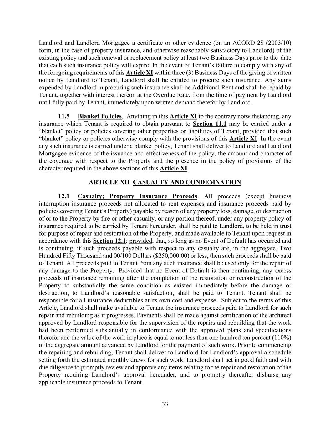 33 Landlord and Landlord Mortgagee a certificate or other evidence (on an ACORD 28 (2003/10) form, in the case of property insurance, and otherwise reasonably satisfactory to Landlord) of the existing policy and such renewal or replacement policy at least two Business Days prior to the date that each such insurance policy will expire. In the event of Tenant’s failure to comply with any of the foregoing requirements of this Article XI within three (3) Business Days of the giving of written notice by Landlord to Tenant, Landlord shall be entitled to procure such insurance. Any sums expended by Landlord in procuring such insurance shall be Additional Rent and shall be repaid by Tenant, together with interest thereon at the Overdue Rate, from the time of payment by Landlord until fully paid by Tenant, immediately upon written demand therefor by Landlord. 11.5 Blanket Policies. Anything in this Article XI to the contrary notwithstanding, any insurance which Tenant is required to obtain pursuant to Section 11.1 may be carried under a “blanket” policy or policies covering other properties or liabilities of Tenant, provided that such “blanket” policy or policies otherwise comply with the provisions of this Article XI. In the event any such insurance is carried under a blanket policy, Tenant shall deliver to Landlord and Landlord Mortgagee evidence of the issuance and effectiveness of the policy, the amount and character of the coverage with respect to the Property and the presence in the policy of provisions of the character required in the above sections of this Article XI. ARTICLE XII CASUALTY AND CONDEMNATION 12.1 Casualty; Property Insurance Proceeds. All proceeds (except business interruption insurance proceeds not allocated to rent expenses and insurance proceeds paid by policies covering Tenant’s Property) payable by reason of any property loss, damage, or destruction of or to the Property by fire or other casualty, or any portion thereof, under any property policy of insurance required to be carried by Tenant hereunder, shall be paid to Landlord, to be held in trust for purpose of repair and restoration of the Property, and made available to Tenant upon request in accordance with this Section 12.1; provided, that, so long as no Event of Default has occurred and is continuing, if such proceeds payable with respect to any casualty are, in the aggregate, Two Hundred Fifty Thousand and 00/100 Dollars ($250,000.00) or less, then such proceeds shall be paid to Tenant. All proceeds paid to Tenant from any such insurance shall be used only for the repair of any damage to the Property. Provided that no Event of Default is then continuing, any excess proceeds of insurance remaining after the completion of the restoration or reconstruction of the Property to substantially the same condition as existed immediately before the damage or destruction, to Landlord’s reasonable satisfaction, shall be paid to Tenant. Tenant shall be responsible for all insurance deductibles at its own cost and expense. Subject to the terms of this Article, Landlord shall make available to Tenant the insurance proceeds paid to Landlord for such repair and rebuilding as it progresses. Payments shall be made against certification of the architect approved by Landlord responsible for the supervision of the repairs and rebuilding that the work had been performed substantially in conformance with the approved plans and specifications therefor and the value of the work in place is equal to not less than one hundred ten percent (110%) of the aggregate amount advanced by Landlord for the payment of such work. Prior to commencing the repairing and rebuilding, Tenant shall deliver to Landlord for Landlord’s approval a schedule setting forth the estimated monthly draws for such work. Landlord shall act in good faith and with due diligence to promptly review and approve any items relating to the repair and restoration of the Property requiring Landlord’s approval hereunder, and to promptly thereafter disburse any applicable insurance proceeds to Tenant.
