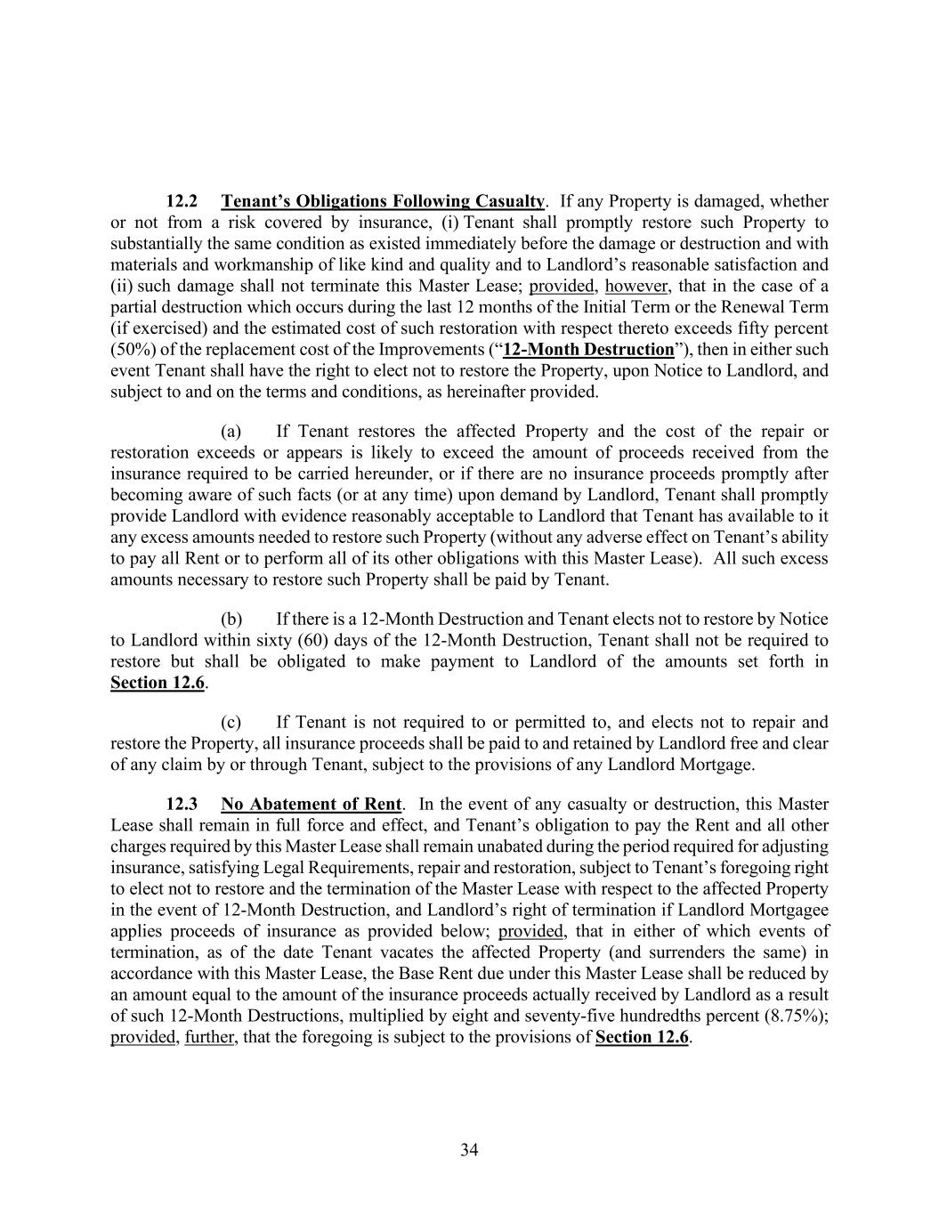 34 12.2 Tenant’s Obligations Following Casualty. If any Property is damaged, whether or not from a risk covered by insurance, (i) Tenant shall promptly restore such Property to substantially the same condition as existed immediately before the damage or destruction and with materials and workmanship of like kind and quality and to Landlord’s reasonable satisfaction and (ii) such damage shall not terminate this Master Lease; provided, however, that in the case of a partial destruction which occurs during the last 12 months of the Initial Term or the Renewal Term (if exercised) and the estimated cost of such restoration with respect thereto exceeds fifty percent (50%) of the replacement cost of the Improvements (“12-Month Destruction”), then in either such event Tenant shall have the right to elect not to restore the Property, upon Notice to Landlord, and subject to and on the terms and conditions, as hereinafter provided. (a) If Tenant restores the affected Property and the cost of the repair or restoration exceeds or appears is likely to exceed the amount of proceeds received from the insurance required to be carried hereunder, or if there are no insurance proceeds promptly after becoming aware of such facts (or at any time) upon demand by Landlord, Tenant shall promptly provide Landlord with evidence reasonably acceptable to Landlord that Tenant has available to it any excess amounts needed to restore such Property (without any adverse effect on Tenant’s ability to pay all Rent or to perform all of its other obligations with this Master Lease). All such excess amounts necessary to restore such Property shall be paid by Tenant. (b) If there is a 12-Month Destruction and Tenant elects not to restore by Notice to Landlord within sixty (60) days of the 12-Month Destruction, Tenant shall not be required to restore but shall be obligated to make payment to Landlord of the amounts set forth in Section 12.6. (c) If Tenant is not required to or permitted to, and elects not to repair and restore the Property, all insurance proceeds shall be paid to and retained by Landlord free and clear of any claim by or through Tenant, subject to the provisions of any Landlord Mortgage. 12.3 No Abatement of Rent. In the event of any casualty or destruction, this Master Lease shall remain in full force and effect, and Tenant’s obligation to pay the Rent and all other charges required by this Master Lease shall remain unabated during the period required for adjusting insurance, satisfying Legal Requirements, repair and restoration, subject to Tenant’s foregoing right to elect not to restore and the termination of the Master Lease with respect to the affected Property in the event of 12-Month Destruction, and Landlord’s right of termination if Landlord Mortgagee applies proceeds of insurance as provided below; provided, that in either of which events of termination, as of the date Tenant vacates the affected Property (and surrenders the same) in accordance with this Master Lease, the Base Rent due under this Master Lease shall be reduced by an amount equal to the amount of the insurance proceeds actually received by Landlord as a result of such 12-Month Destructions, multiplied by eight and seventy-five hundredths percent (8.75%); provided, further, that the foregoing is subject to the provisions of Section 12.6.