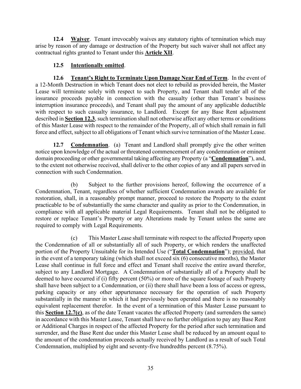 35 12.4 Waiver. Tenant irrevocably waives any statutory rights of termination which may arise by reason of any damage or destruction of the Property but such waiver shall not affect any contractual rights granted to Tenant under this Article XII. 12.5 Intentionally omitted. 12.6 Tenant’s Right to Terminate Upon Damage Near End of Term. In the event of a 12-Month Destruction in which Tenant does not elect to rebuild as provided herein, the Master Lease will terminate solely with respect to such Property, and Tenant shall tender all of the insurance proceeds payable in connection with the casualty (other than Tenant’s business interruption insurance proceeds), and Tenant shall pay the amount of any applicable deductible with respect to such casualty insurance, to Landlord. Except for any Base Rent adjustment described in Section 12.3, such termination shall not otherwise affect any other terms or conditions of this Master Lease with respect to the remainder of the Property, all of which shall remain in full force and effect, subject to all obligations of Tenant which survive termination of the Master Lease. 12.7 Condemnation. (a) Tenant and Landlord shall promptly give the other written notice upon knowledge of the actual or threatened commencement of any condemnation or eminent domain proceeding or other governmental taking affecting any Property (a “Condemnation”), and, to the extent not otherwise received, shall deliver to the other copies of any and all papers served in connection with such Condemnation. (b) Subject to the further provisions hereof, following the occurrence of a Condemnation, Tenant, regardless of whether sufficient Condemnation awards are available for restoration, shall, in a reasonably prompt manner, proceed to restore the Property to the extent practicable to be of substantially the same character and quality as prior to the Condemnation, in compliance with all applicable material Legal Requirements. Tenant shall not be obligated to restore or replace Tenant’s Property or any Alterations made by Tenant unless the same are required to comply with Legal Requirements. (c) This Master Lease shall terminate with respect to the affected Property upon the Condemnation of all or substantially all of such Property, or which renders the unaffected portion of the Property Unsuitable for its Intended Use (“Total Condemnation”); provided, that in the event of a temporary taking (which shall not exceed six (6) consecutive months), the Master Lease shall continue in full force and effect and Tenant shall receive the entire award therefor, subject to any Landlord Mortgage. A Condemnation of substantially all of a Property shall be deemed to have occurred if (i) fifty percent (50%) or more of the square footage of such Property shall have been subject to a Condemnation, or (ii) there shall have been a loss of access or egress, parking capacity or any other appurtenance necessary for the operation of such Property substantially in the manner in which it had previously been operated and there is no reasonably equivalent replacement therefor. In the event of a termination of this Master Lease pursuant to this Section 12.7(c), as of the date Tenant vacates the affected Property (and surrenders the same) in accordance with this Master Lease, Tenant shall have no further obligation to pay any Base Rent or Additional Charges in respect of the affected Property for the period after such termination and surrender, and the Base Rent due under this Master Lease shall be reduced by an amount equal to the amount of the condemnation proceeds actually received by Landlord as a result of such Total Condemnation, multiplied by eight and seventy-five hundredths percent (8.75%).