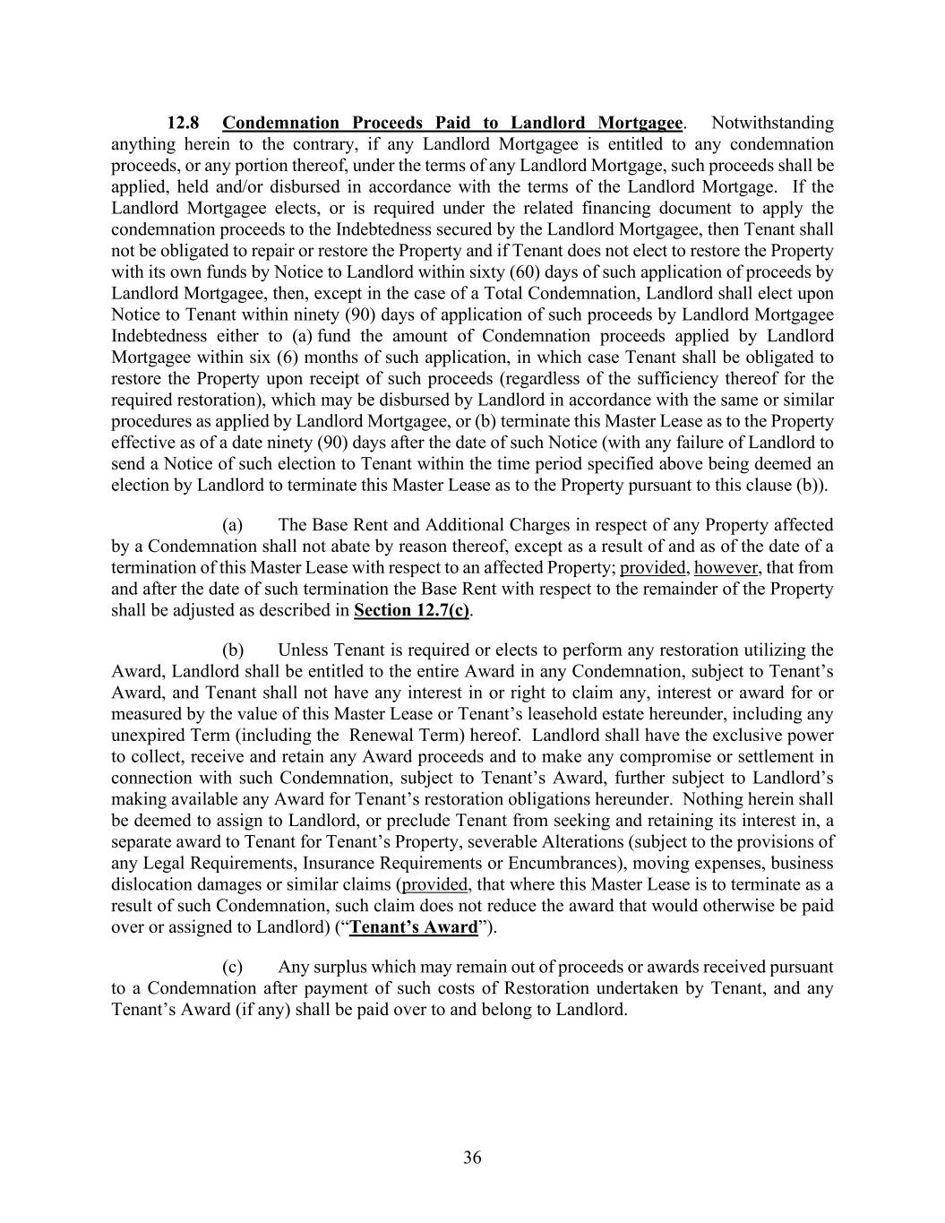 36 12.8 Condemnation Proceeds Paid to Landlord Mortgagee. Notwithstanding anything herein to the contrary, if any Landlord Mortgagee is entitled to any condemnation proceeds, or any portion thereof, under the terms of any Landlord Mortgage, such proceeds shall be applied, held and/or disbursed in accordance with the terms of the Landlord Mortgage. If the Landlord Mortgagee elects, or is required under the related financing document to apply the condemnation proceeds to the Indebtedness secured by the Landlord Mortgagee, then Tenant shall not be obligated to repair or restore the Property and if Tenant does not elect to restore the Property with its own funds by Notice to Landlord within sixty (60) days of such application of proceeds by Landlord Mortgagee, then, except in the case of a Total Condemnation, Landlord shall elect upon Notice to Tenant within ninety (90) days of application of such proceeds by Landlord Mortgagee Indebtedness either to (a) fund the amount of Condemnation proceeds applied by Landlord Mortgagee within six (6) months of such application, in which case Tenant shall be obligated to restore the Property upon receipt of such proceeds (regardless of the sufficiency thereof for the required restoration), which may be disbursed by Landlord in accordance with the same or similar procedures as applied by Landlord Mortgagee, or (b) terminate this Master Lease as to the Property effective as of a date ninety (90) days after the date of such Notice (with any failure of Landlord to send a Notice of such election to Tenant within the time period specified above being deemed an election by Landlord to terminate this Master Lease as to the Property pursuant to this clause (b)). (a) The Base Rent and Additional Charges in respect of any Property affected by a Condemnation shall not abate by reason thereof, except as a result of and as of the date of a termination of this Master Lease with respect to an affected Property; provided, however, that from and after the date of such termination the Base Rent with respect to the remainder of the Property shall be adjusted as described in Section 12.7(c). (b) Unless Tenant is required or elects to perform any restoration utilizing the Award, Landlord shall be entitled to the entire Award in any Condemnation, subject to Tenant’s Award, and Tenant shall not have any interest in or right to claim any, interest or award for or measured by the value of this Master Lease or Tenant’s leasehold estate hereunder, including any unexpired Term (including the Renewal Term) hereof. Landlord shall have the exclusive power to collect, receive and retain any Award proceeds and to make any compromise or settlement in connection with such Condemnation, subject to Tenant’s Award, further subject to Landlord’s making available any Award for Tenant’s restoration obligations hereunder. Nothing herein shall be deemed to assign to Landlord, or preclude Tenant from seeking and retaining its interest in, a separate award to Tenant for Tenant’s Property, severable Alterations (subject to the provisions of any Legal Requirements, Insurance Requirements or Encumbrances), moving expenses, business dislocation damages or similar claims (provided, that where this Master Lease is to terminate as a result of such Condemnation, such claim does not reduce the award that would otherwise be paid over or assigned to Landlord) (“Tenant’s Award”). (c) Any surplus which may remain out of proceeds or awards received pursuant to a Condemnation after payment of such costs of Restoration undertaken by Tenant, and any Tenant’s Award (if any) shall be paid over to and belong to Landlord.