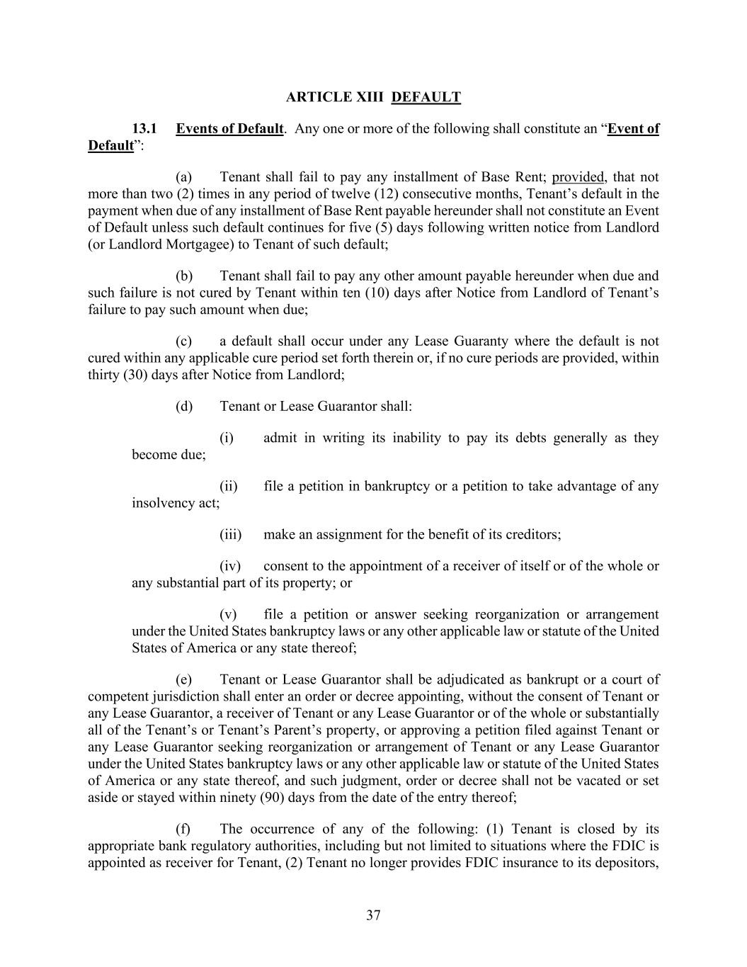 37 ARTICLE XIII DEFAULT 13.1 Events of Default. Any one or more of the following shall constitute an “Event of Default”: (a) Tenant shall fail to pay any installment of Base Rent; provided, that not more than two (2) times in any period of twelve (12) consecutive months, Tenant’s default in the payment when due of any installment of Base Rent payable hereunder shall not constitute an Event of Default unless such default continues for five (5) days following written notice from Landlord (or Landlord Mortgagee) to Tenant of such default; (b) Tenant shall fail to pay any other amount payable hereunder when due and such failure is not cured by Tenant within ten (10) days after Notice from Landlord of Tenant’s failure to pay such amount when due; (c) a default shall occur under any Lease Guaranty where the default is not cured within any applicable cure period set forth therein or, if no cure periods are provided, within thirty (30) days after Notice from Landlord; (d) Tenant or Lease Guarantor shall: (i) admit in writing its inability to pay its debts generally as they become due; (ii) file a petition in bankruptcy or a petition to take advantage of any insolvency act; (iii) make an assignment for the benefit of its creditors; (iv) consent to the appointment of a receiver of itself or of the whole or any substantial part of its property; or (v) file a petition or answer seeking reorganization or arrangement under the United States bankruptcy laws or any other applicable law or statute of the United States of America or any state thereof; (e) Tenant or Lease Guarantor shall be adjudicated as bankrupt or a court of competent jurisdiction shall enter an order or decree appointing, without the consent of Tenant or any Lease Guarantor, a receiver of Tenant or any Lease Guarantor or of the whole or substantially all of the Tenant’s or Tenant’s Parent’s property, or approving a petition filed against Tenant or any Lease Guarantor seeking reorganization or arrangement of Tenant or any Lease Guarantor under the United States bankruptcy laws or any other applicable law or statute of the United States of America or any state thereof, and such judgment, order or decree shall not be vacated or set aside or stayed within ninety (90) days from the date of the entry thereof; (f) The occurrence of any of the following: (1) Tenant is closed by its appropriate bank regulatory authorities, including but not limited to situations where the FDIC is appointed as receiver for Tenant, (2) Tenant no longer provides FDIC insurance to its depositors,