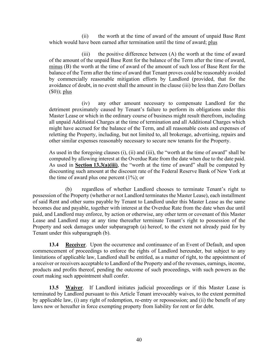 40 (ii) the worth at the time of award of the amount of unpaid Base Rent which would have been earned after termination until the time of award; plus (iii) the positive difference between (A) the worth at the time of award of the amount of the unpaid Base Rent for the balance of the Term after the time of award, minus (B) the worth at the time of award of the amount of such loss of Base Rent for the balance of the Term after the time of award that Tenant proves could be reasonably avoided by commercially reasonable mitigation efforts by Landlord (provided, that for the avoidance of doubt, in no event shall the amount in the clause (iii) be less than Zero Dollars ($0)); plus (iv) any other amount necessary to compensate Landlord for the detriment proximately caused by Tenant’s failure to perform its obligations under this Master Lease or which in the ordinary course of business might result therefrom, including all unpaid Additional Charges at the time of termination and all Additional Charges which might have accrued for the balance of the Term, and all reasonable costs and expenses of reletting the Property, including, but not limited to, all brokerage, advertising, repairs and other similar expenses reasonably necessary to secure new tenants for the Property. As used in the foregoing clauses (i), (ii) and (iii), the “worth at the time of award” shall be computed by allowing interest at the Overdue Rate from the date when due to the date paid. As used in Section 13.3(a)(iii), the “worth at the time of award” shall be computed by discounting such amount at the discount rate of the Federal Reserve Bank of New York at the time of award plus one percent (1%); or (b) regardless of whether Landlord chooses to terminate Tenant’s right to possession of the Property (whether or not Landlord terminates the Master Lease), each installment of said Rent and other sums payable by Tenant to Landlord under this Master Lease as the same becomes due and payable, together with interest at the Overdue Rate from the date when due until paid, and Landlord may enforce, by action or otherwise, any other term or covenant of this Master Lease and Landlord may at any time thereafter terminate Tenant’s right to possession of the Property and seek damages under subparagraph (a) hereof, to the extent not already paid for by Tenant under this subparagraph (b). 13.4 Receiver. Upon the occurrence and continuance of an Event of Default, and upon commencement of proceedings to enforce the rights of Landlord hereunder, but subject to any limitations of applicable law, Landlord shall be entitled, as a matter of right, to the appointment of a receiver or receivers acceptable to Landlord of the Property and of the revenues, earnings, income, products and profits thereof, pending the outcome of such proceedings, with such powers as the court making such appointment shall confer. 13.5 Waiver. If Landlord initiates judicial proceedings or if this Master Lease is terminated by Landlord pursuant to this Article Tenant irrevocably waives, to the extent permitted by applicable law, (i) any right of redemption, re-entry or repossession; and (ii) the benefit of any laws now or hereafter in force exempting property from liability for rent or for debt.