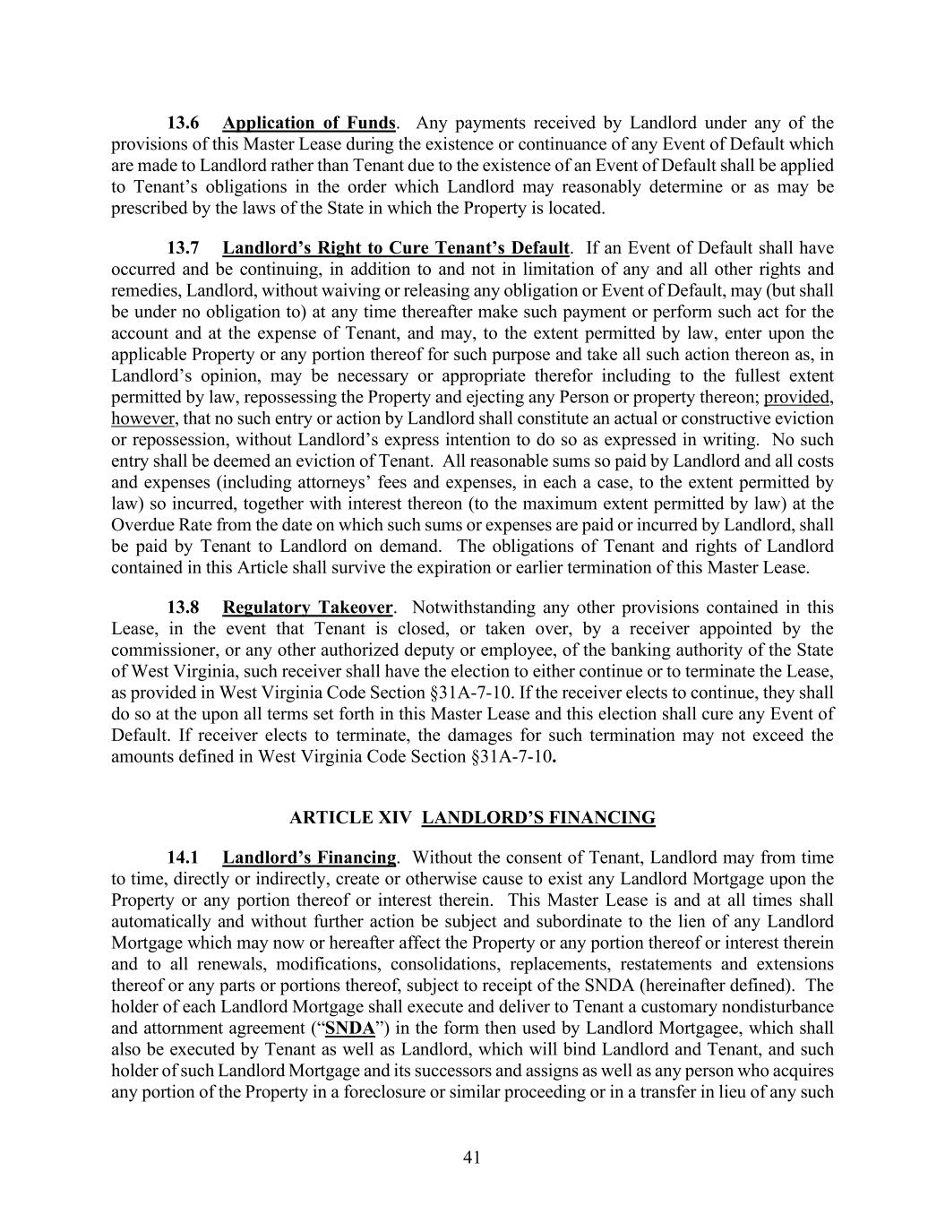 41 13.6 Application of Funds. Any payments received by Landlord under any of the provisions of this Master Lease during the existence or continuance of any Event of Default which are made to Landlord rather than Tenant due to the existence of an Event of Default shall be applied to Tenant’s obligations in the order which Landlord may reasonably determine or as may be prescribed by the laws of the State in which the Property is located. 13.7 Landlord’s Right to Cure Tenant’s Default. If an Event of Default shall have occurred and be continuing, in addition to and not in limitation of any and all other rights and remedies, Landlord, without waiving or releasing any obligation or Event of Default, may (but shall be under no obligation to) at any time thereafter make such payment or perform such act for the account and at the expense of Tenant, and may, to the extent permitted by law, enter upon the applicable Property or any portion thereof for such purpose and take all such action thereon as, in Landlord’s opinion, may be necessary or appropriate therefor including to the fullest extent permitted by law, repossessing the Property and ejecting any Person or property thereon; provided, however, that no such entry or action by Landlord shall constitute an actual or constructive eviction or repossession, without Landlord’s express intention to do so as expressed in writing. No such entry shall be deemed an eviction of Tenant. All reasonable sums so paid by Landlord and all costs and expenses (including attorneys’ fees and expenses, in each a case, to the extent permitted by law) so incurred, together with interest thereon (to the maximum extent permitted by law) at the Overdue Rate from the date on which such sums or expenses are paid or incurred by Landlord, shall be paid by Tenant to Landlord on demand. The obligations of Tenant and rights of Landlord contained in this Article shall survive the expiration or earlier termination of this Master Lease. 13.8 Regulatory Takeover. Notwithstanding any other provisions contained in this Lease, in the event that Tenant is closed, or taken over, by a receiver appointed by the commissioner, or any other authorized deputy or employee, of the banking authority of the State of West Virginia, such receiver shall have the election to either continue or to terminate the Lease, as provided in West Virginia Code Section §31A-7-10. If the receiver elects to continue, they shall do so at the upon all terms set forth in this Master Lease and this election shall cure any Event of Default. If receiver elects to terminate, the damages for such termination may not exceed the amounts defined in West Virginia Code Section §31A-7-10. ARTICLE XIV LANDLORD’S FINANCING 14.1 Landlord’s Financing. Without the consent of Tenant, Landlord may from time to time, directly or indirectly, create or otherwise cause to exist any Landlord Mortgage upon the Property or any portion thereof or interest therein. This Master Lease is and at all times shall automatically and without further action be subject and subordinate to the lien of any Landlord Mortgage which may now or hereafter affect the Property or any portion thereof or interest therein and to all renewals, modifications, consolidations, replacements, restatements and extensions thereof or any parts or portions thereof, subject to receipt of the SNDA (hereinafter defined). The holder of each Landlord Mortgage shall execute and deliver to Tenant a customary nondisturbance and attornment agreement (“SNDA”) in the form then used by Landlord Mortgagee, which shall also be executed by Tenant as well as Landlord, which will bind Landlord and Tenant, and such holder of such Landlord Mortgage and its successors and assigns as well as any person who acquires any portion of the Property in a foreclosure or similar proceeding or in a transfer in lieu of any such