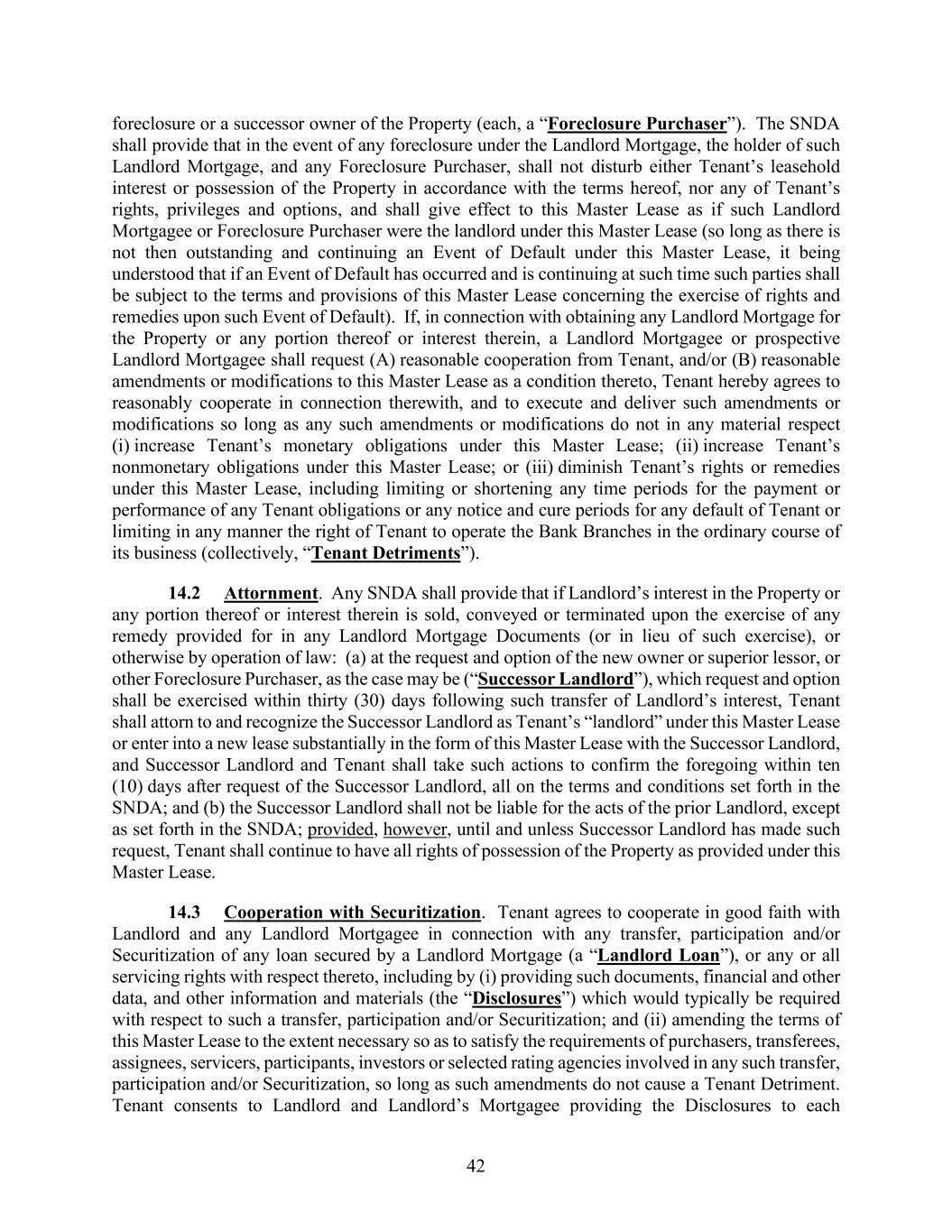 42 foreclosure or a successor owner of the Property (each, a “Foreclosure Purchaser”). The SNDA shall provide that in the event of any foreclosure under the Landlord Mortgage, the holder of such Landlord Mortgage, and any Foreclosure Purchaser, shall not disturb either Tenant’s leasehold interest or possession of the Property in accordance with the terms hereof, nor any of Tenant’s rights, privileges and options, and shall give effect to this Master Lease as if such Landlord Mortgagee or Foreclosure Purchaser were the landlord under this Master Lease (so long as there is not then outstanding and continuing an Event of Default under this Master Lease, it being understood that if an Event of Default has occurred and is continuing at such time such parties shall be subject to the terms and provisions of this Master Lease concerning the exercise of rights and remedies upon such Event of Default). If, in connection with obtaining any Landlord Mortgage for the Property or any portion thereof or interest therein, a Landlord Mortgagee or prospective Landlord Mortgagee shall request (A) reasonable cooperation from Tenant, and/or (B) reasonable amendments or modifications to this Master Lease as a condition thereto, Tenant hereby agrees to reasonably cooperate in connection therewith, and to execute and deliver such amendments or modifications so long as any such amendments or modifications do not in any material respect (i) increase Tenant’s monetary obligations under this Master Lease; (ii) increase Tenant’s nonmonetary obligations under this Master Lease; or (iii) diminish Tenant’s rights or remedies under this Master Lease, including limiting or shortening any time periods for the payment or performance of any Tenant obligations or any notice and cure periods for any default of Tenant or limiting in any manner the right of Tenant to operate the Bank Branches in the ordinary course of its business (collectively, “Tenant Detriments”). 14.2 Attornment. Any SNDA shall provide that if Landlord’s interest in the Property or any portion thereof or interest therein is sold, conveyed or terminated upon the exercise of any remedy provided for in any Landlord Mortgage Documents (or in lieu of such exercise), or otherwise by operation of law: (a) at the request and option of the new owner or superior lessor, or other Foreclosure Purchaser, as the case may be (“Successor Landlord”), which request and option shall be exercised within thirty (30) days following such transfer of Landlord’s interest, Tenant shall attorn to and recognize the Successor Landlord as Tenant’s “landlord” under this Master Lease or enter into a new lease substantially in the form of this Master Lease with the Successor Landlord, and Successor Landlord and Tenant shall take such actions to confirm the foregoing within ten (10) days after request of the Successor Landlord, all on the terms and conditions set forth in the SNDA; and (b) the Successor Landlord shall not be liable for the acts of the prior Landlord, except as set forth in the SNDA; provided, however, until and unless Successor Landlord has made such request, Tenant shall continue to have all rights of possession of the Property as provided under this Master Lease. 14.3 Cooperation with Securitization. Tenant agrees to cooperate in good faith with Landlord and any Landlord Mortgagee in connection with any transfer, participation and/or Securitization of any loan secured by a Landlord Mortgage (a “Landlord Loan”), or any or all servicing rights with respect thereto, including by (i) providing such documents, financial and other data, and other information and materials (the “Disclosures”) which would typically be required with respect to such a transfer, participation and/or Securitization; and (ii) amending the terms of this Master Lease to the extent necessary so as to satisfy the requirements of purchasers, transferees, assignees, servicers, participants, investors or selected rating agencies involved in any such transfer, participation and/or Securitization, so long as such amendments do not cause a Tenant Detriment. Tenant consents to Landlord and Landlord’s Mortgagee providing the Disclosures to each