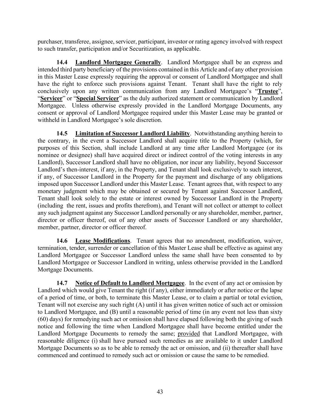 43 purchaser, transferee, assignee, servicer, participant, investor or rating agency involved with respect to such transfer, participation and/or Securitization, as applicable. 14.4 Landlord Mortgagee Generally. Landlord Mortgagee shall be an express and intended third party beneficiary of the provisions contained in this Article and of any other provision in this Master Lease expressly requiring the approval or consent of Landlord Mortgagee and shall have the right to enforce such provisions against Tenant. Tenant shall have the right to rely conclusively upon any written communication from any Landlord Mortgagee’s “Trustee”, “Servicer” or “Special Servicer” as the duly authorized statement or communication by Landlord Mortgagee. Unless otherwise expressly provided in the Landlord Mortgage Documents, any consent or approval of Landlord Mortgagee required under this Master Lease may be granted or withheld in Landlord Mortgagee’s sole discretion. 14.5 Limitation of Successor Landlord Liability. Notwithstanding anything herein to the contrary, in the event a Successor Landlord shall acquire title to the Property (which, for purposes of this Section, shall include Landlord at any time after Landlord Mortgagee (or its nominee or designee) shall have acquired direct or indirect control of the voting interests in any Landlord), Successor Landlord shall have no obligation, nor incur any liability, beyond Successor Landlord’s then-interest, if any, in the Property, and Tenant shall look exclusively to such interest, if any, of Successor Landlord in the Property for the payment and discharge of any obligations imposed upon Successor Landlord under this Master Lease. Tenant agrees that, with respect to any monetary judgment which may be obtained or secured by Tenant against Successor Landlord, Tenant shall look solely to the estate or interest owned by Successor Landlord in the Property (including the rent, issues and profits therefrom), and Tenant will not collect or attempt to collect any such judgment against any Successor Landlord personally or any shareholder, member, partner, director or officer thereof, out of any other assets of Successor Landlord or any shareholder, member, partner, director or officer thereof. 14.6 Lease Modifications. Tenant agrees that no amendment, modification, waiver, termination, tender, surrender or cancellation of this Master Lease shall be effective as against any Landlord Mortgagee or Successor Landlord unless the same shall have been consented to by Landlord Mortgagee or Successor Landlord in writing, unless otherwise provided in the Landlord Mortgage Documents. 14.7 Notice of Default to Landlord Mortgagee. In the event of any act or omission by Landlord which would give Tenant the right (if any), either immediately or after notice or the lapse of a period of time, or both, to terminate this Master Lease, or to claim a partial or total eviction, Tenant will not exercise any such right (A) until it has given written notice of such act or omission to Landlord Mortgagee, and (B) until a reasonable period of time (in any event not less than sixty (60) days) for remedying such act or omission shall have elapsed following both the giving of such notice and following the time when Landlord Mortgagee shall have become entitled under the Landlord Mortgage Documents to remedy the same; provided that Landlord Mortgagee, with reasonable diligence (i) shall have pursued such remedies as are available to it under Landlord Mortgage Documents so as to be able to remedy the act or omission, and (ii) thereafter shall have commenced and continued to remedy such act or omission or cause the same to be remedied.