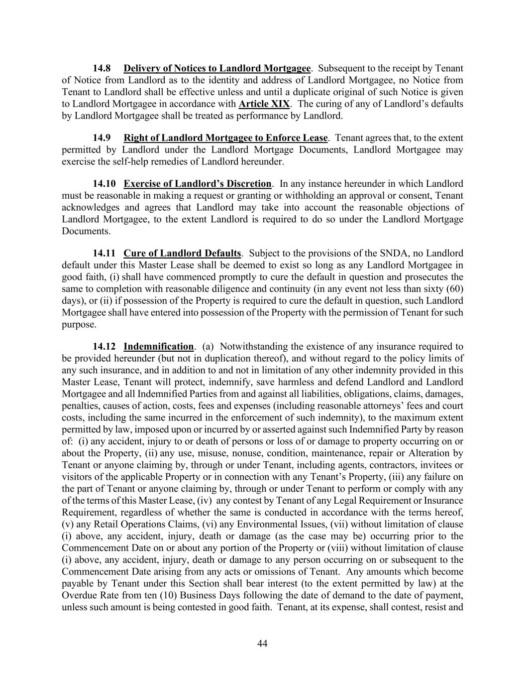 44 14.8 Delivery of Notices to Landlord Mortgagee. Subsequent to the receipt by Tenant of Notice from Landlord as to the identity and address of Landlord Mortgagee, no Notice from Tenant to Landlord shall be effective unless and until a duplicate original of such Notice is given to Landlord Mortgagee in accordance with Article XIX. The curing of any of Landlord’s defaults by Landlord Mortgagee shall be treated as performance by Landlord. 14.9 Right of Landlord Mortgagee to Enforce Lease. Tenant agrees that, to the extent permitted by Landlord under the Landlord Mortgage Documents, Landlord Mortgagee may exercise the self-help remedies of Landlord hereunder. 14.10 Exercise of Landlord’s Discretion. In any instance hereunder in which Landlord must be reasonable in making a request or granting or withholding an approval or consent, Tenant acknowledges and agrees that Landlord may take into account the reasonable objections of Landlord Mortgagee, to the extent Landlord is required to do so under the Landlord Mortgage Documents. 14.11 Cure of Landlord Defaults. Subject to the provisions of the SNDA, no Landlord default under this Master Lease shall be deemed to exist so long as any Landlord Mortgagee in good faith, (i) shall have commenced promptly to cure the default in question and prosecutes the same to completion with reasonable diligence and continuity (in any event not less than sixty (60) days), or (ii) if possession of the Property is required to cure the default in question, such Landlord Mortgagee shall have entered into possession of the Property with the permission of Tenant for such purpose. 14.12 Indemnification. (a) Notwithstanding the existence of any insurance required to be provided hereunder (but not in duplication thereof), and without regard to the policy limits of any such insurance, and in addition to and not in limitation of any other indemnity provided in this Master Lease, Tenant will protect, indemnify, save harmless and defend Landlord and Landlord Mortgagee and all Indemnified Parties from and against all liabilities, obligations, claims, damages, penalties, causes of action, costs, fees and expenses (including reasonable attorneys’ fees and court costs, including the same incurred in the enforcement of such indemnity), to the maximum extent permitted by law, imposed upon or incurred by or asserted against such Indemnified Party by reason of: (i) any accident, injury to or death of persons or loss of or damage to property occurring on or about the Property, (ii) any use, misuse, nonuse, condition, maintenance, repair or Alteration by Tenant or anyone claiming by, through or under Tenant, including agents, contractors, invitees or visitors of the applicable Property or in connection with any Tenant’s Property, (iii) any failure on the part of Tenant or anyone claiming by, through or under Tenant to perform or comply with any of the terms of this Master Lease, (iv) any contest by Tenant of any Legal Requirement or Insurance Requirement, regardless of whether the same is conducted in accordance with the terms hereof, (v) any Retail Operations Claims, (vi) any Environmental Issues, (vii) without limitation of clause (i) above, any accident, injury, death or damage (as the case may be) occurring prior to the Commencement Date on or about any portion of the Property or (viii) without limitation of clause (i) above, any accident, injury, death or damage to any person occurring on or subsequent to the Commencement Date arising from any acts or omissions of Tenant. Any amounts which become payable by Tenant under this Section shall bear interest (to the extent permitted by law) at the Overdue Rate from ten (10) Business Days following the date of demand to the date of payment, unless such amount is being contested in good faith. Tenant, at its expense, shall contest, resist and