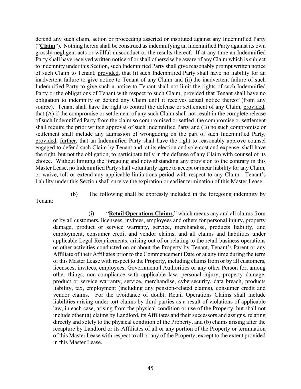 45 defend any such claim, action or proceeding asserted or instituted against any Indemnified Party (“Claim”). Nothing herein shall be construed as indemnifying an Indemnified Party against its own grossly negligent acts or willful misconduct or the results thereof. If at any time an Indemnified Party shall have received written notice of or shall otherwise be aware of any Claim which is subject to indemnity under this Section, such Indemnified Party shall give reasonably prompt written notice of such Claim to Tenant; provided, that (i) such Indemnified Party shall have no liability for an inadvertent failure to give notice to Tenant of any Claim and (ii) the inadvertent failure of such Indemnified Party to give such a notice to Tenant shall not limit the rights of such Indemnified Party or the obligations of Tenant with respect to such Claim, provided that Tenant shall have no obligation to indemnify or defend any Claim until it receives actual notice thereof (from any source). Tenant shall have the right to control the defense or settlement of any Claim, provided, that (A) if the compromise or settlement of any such Claim shall not result in the complete release of such Indemnified Party from the claim so compromised or settled, the compromise or settlement shall require the prior written approval of such Indemnified Party and (B) no such compromise or settlement shall include any admission of wrongdoing on the part of such Indemnified Party, provided, further, that an Indemnified Party shall have the right to reasonably approve counsel engaged to defend such Claim by Tenant and, at its election and sole cost and expense, shall have the right, but not the obligation, to participate fully in the defense of any Claim with counsel of its choice. Without limiting the foregoing and notwithstanding any provision to the contrary in this Master Lease, no Indemnified Party shall voluntarily agree to accept or incur liability for any Claim, or waive, toll or extend any applicable limitations period with respect to any Claim. Tenant’s liability under this Section shall survive the expiration or earlier termination of this Master Lease. (b) The following shall be expressly included in the foregoing indemnity by Tenant: (i) “Retail Operations Claims,” which means any and all claims from or by all customers, licensees, invitees, employees and others for personal injury, property damage, product or service warranty, service, merchandise, products liability, and employment, consumer credit and vendor claims, and all claims and liabilities under applicable Legal Requirements, arising out of or relating to the retail business operations or other activities conducted on or about the Property by Tenant, Tenant’s Parent or any Affiliate of their Affiliates prior to the Commencement Date or at any time during the term of this Master Lease with respect to the Property, including claims from or by all customers, licensees, invitees, employees, Governmental Authorities or any other Person for, among other things, non-compliance with applicable law, personal injury, property damage, product or service warranty, service, merchandise, cybersecurity, data breach, products liability, tax, employment (including any pension-related claims), consumer credit and vendor claims. For the avoidance of doubt, Retail Operations Claims shall include liabilities arising under tort claims by third parties as a result of violations of applicable law, in each case, arising from the physical condition or use of the Property, but shall not include other (a) claims by Landlord, its Affiliates and their successors and assigns, relating directly and solely to the physical condition of the Property, and (b) claims arising after the recapture by Landlord or its Affiliates of all or any portion of the Property or termination of this Master Lease with respect to all or any of the Property, except to the extent provided in this Master Lease.