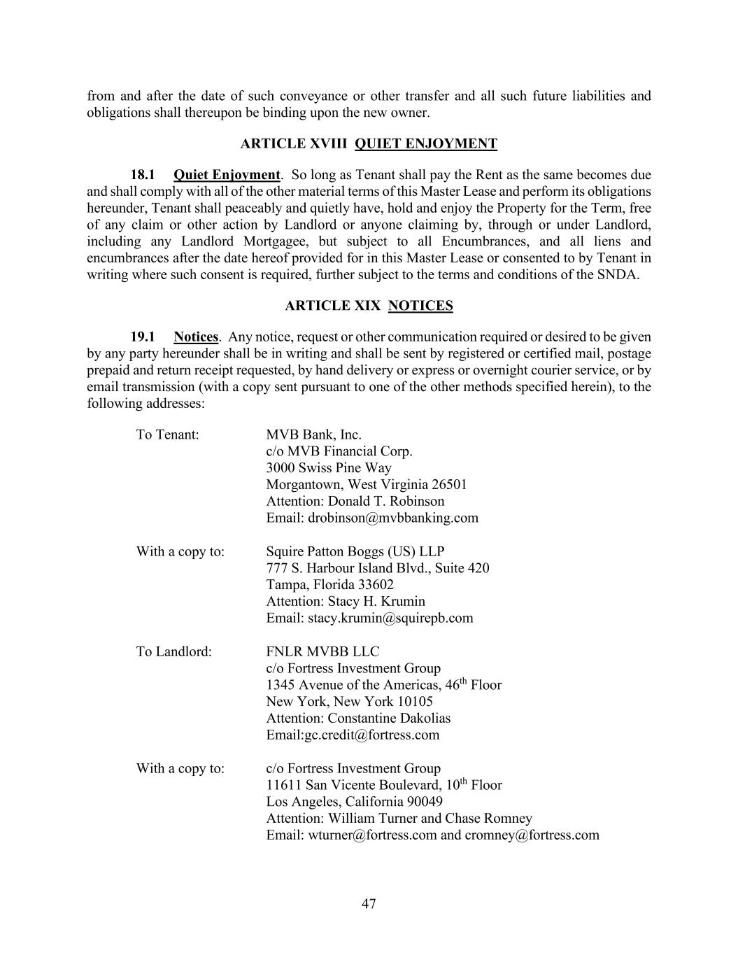 47 from and after the date of such conveyance or other transfer and all such future liabilities and obligations shall thereupon be binding upon the new owner. ARTICLE XVIII QUIET ENJOYMENT 18.1 Quiet Enjoyment. So long as Tenant shall pay the Rent as the same becomes due and shall comply with all of the other material terms of this Master Lease and perform its obligations hereunder, Tenant shall peaceably and quietly have, hold and enjoy the Property for the Term, free of any claim or other action by Landlord or anyone claiming by, through or under Landlord, including any Landlord Mortgagee, but subject to all Encumbrances, and all liens and encumbrances after the date hereof provided for in this Master Lease or consented to by Tenant in writing where such consent is required, further subject to the terms and conditions of the SNDA. ARTICLE XIX NOTICES 19.1 Notices. Any notice, request or other communication required or desired to be given by any party hereunder shall be in writing and shall be sent by registered or certified mail, postage prepaid and return receipt requested, by hand delivery or express or overnight courier service, or by email transmission (with a copy sent pursuant to one of the other methods specified herein), to the following addresses: To Tenant: MVB Bank, Inc. c/o MVB Financial Corp. 3000 Swiss Pine Way Morgantown, West Virginia 26501 Attention: Donald T. Robinson Email: drobinson@mvbbanking.com With a copy to: Squire Patton Boggs (US) LLP 777 S. Harbour Island Blvd., Suite 420 Tampa, Florida 33602 Attention: Stacy H. Krumin Email: stacy.krumin@squirepb.com To Landlord: FNLR MVBB LLC c/o Fortress Investment Group 1345 Avenue of the Americas, 46th Floor New York, New York 10105 Attention: Constantine Dakolias Email:gc.credit@fortress.com With a copy to: c/o Fortress Investment Group 11611 San Vicente Boulevard, 10th Floor Los Angeles, California 90049 Attention: William Turner and Chase Romney Email: wturner@fortress.com and cromney@fortress.com