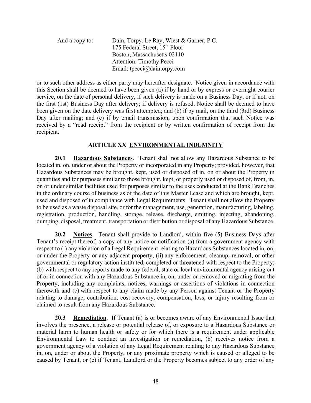 48 And a copy to: Dain, Torpy, Le Ray, Wiest & Garner, P.C. 175 Federal Street, 15th Floor Boston, Massachusetts 02110 Attention: Timothy Pecci Email: tpecci@daintorpy.com or to such other address as either party may hereafter designate. Notice given in accordance with this Section shall be deemed to have been given (a) if by hand or by express or overnight courier service, on the date of personal delivery, if such delivery is made on a Business Day, or if not, on the first (1st) Business Day after delivery; if delivery is refused, Notice shall be deemed to have been given on the date delivery was first attempted; and (b) if by mail, on the third (3rd) Business Day after mailing; and (c) if by email transmission, upon confirmation that such Notice was received by a “read receipt” from the recipient or by written confirmation of receipt from the recipient. ARTICLE XX ENVIRONMENTAL INDEMNITY 20.1 Hazardous Substances. Tenant shall not allow any Hazardous Substance to be located in, on, under or about the Property or incorporated in any Property; provided, however, that Hazardous Substances may be brought, kept, used or disposed of in, on or about the Property in quantities and for purposes similar to those brought, kept, or properly used or disposed of, from, in, on or under similar facilities used for purposes similar to the uses conducted at the Bank Branches in the ordinary course of business as of the date of this Master Lease and which are brought, kept, used and disposed of in compliance with Legal Requirements. Tenant shall not allow the Property to be used as a waste disposal site, or for the management, use, generation, manufacturing, labeling, registration, production, handling, storage, release, discharge, emitting, injecting, abandoning, dumping, disposal, treatment, transportation or distribution or disposal of any Hazardous Substance. 20.2 Notices. Tenant shall provide to Landlord, within five (5) Business Days after Tenant’s receipt thereof, a copy of any notice or notification (a) from a government agency with respect to (i) any violation of a Legal Requirement relating to Hazardous Substances located in, on, or under the Property or any adjacent property, (ii) any enforcement, cleanup, removal, or other governmental or regulatory action instituted, completed or threatened with respect to the Property; (b) with respect to any reports made to any federal, state or local environmental agency arising out of or in connection with any Hazardous Substance in, on, under or removed or migrating from the Property, including any complaints, notices, warnings or assertions of violations in connection therewith and (c) with respect to any claim made by any Person against Tenant or the Property relating to damage, contribution, cost recovery, compensation, loss, or injury resulting from or claimed to result from any Hazardous Substance. 20.3 Remediation. If Tenant (a) is or becomes aware of any Environmental Issue that involves the presence, a release or potential release of, or exposure to a Hazardous Substance or material harm to human health or safety or for which there is a requirement under applicable Environmental Law to conduct an investigation or remediation, (b) receives notice from a government agency of a violation of any Legal Requirement relating to any Hazardous Substance in, on, under or about the Property, or any proximate property which is caused or alleged to be caused by Tenant, or (c) if Tenant, Landlord or the Property becomes subject to any order of any