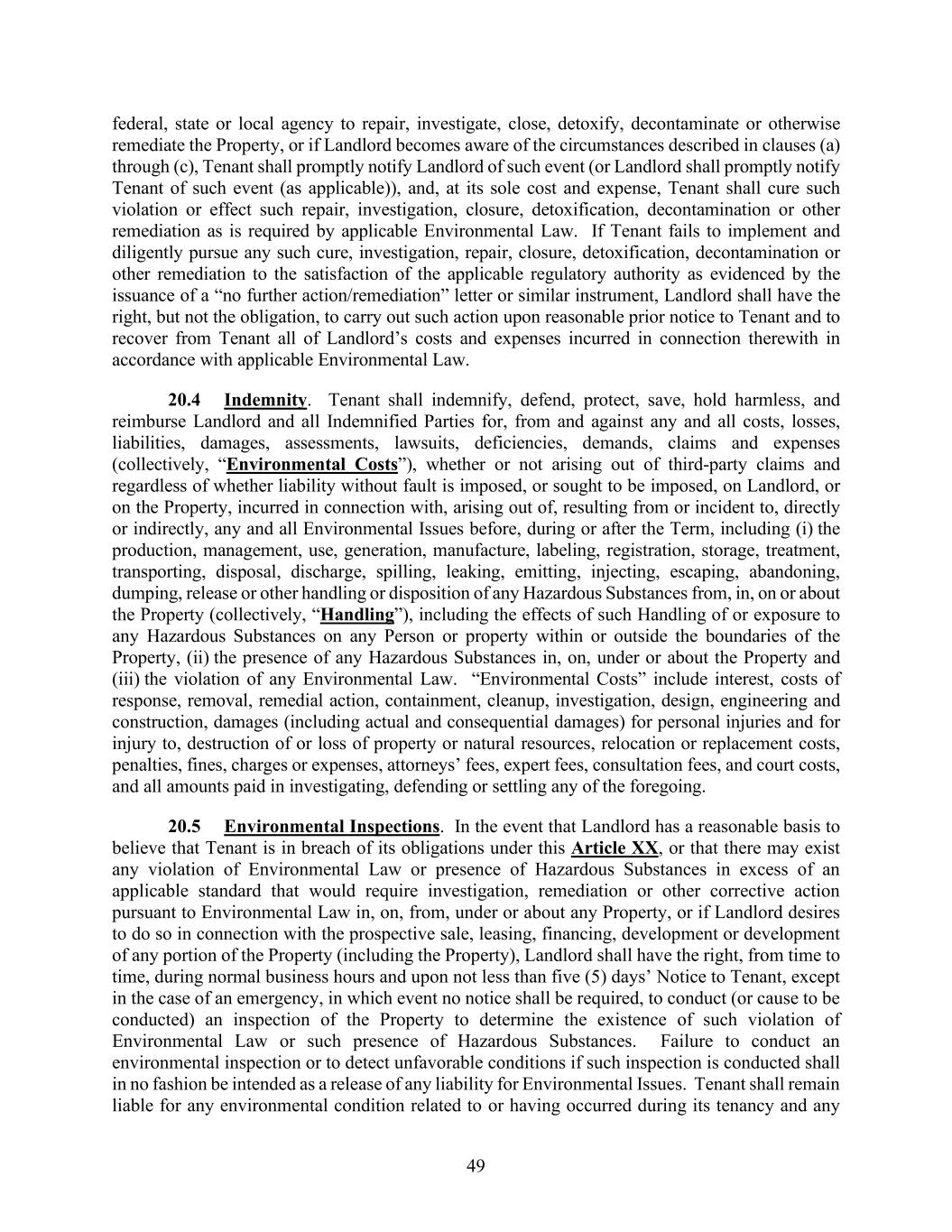 49 federal, state or local agency to repair, investigate, close, detoxify, decontaminate or otherwise remediate the Property, or if Landlord becomes aware of the circumstances described in clauses (a) through (c), Tenant shall promptly notify Landlord of such event (or Landlord shall promptly notify Tenant of such event (as applicable)), and, at its sole cost and expense, Tenant shall cure such violation or effect such repair, investigation, closure, detoxification, decontamination or other remediation as is required by applicable Environmental Law. If Tenant fails to implement and diligently pursue any such cure, investigation, repair, closure, detoxification, decontamination or other remediation to the satisfaction of the applicable regulatory authority as evidenced by the issuance of a “no further action/remediation” letter or similar instrument, Landlord shall have the right, but not the obligation, to carry out such action upon reasonable prior notice to Tenant and to recover from Tenant all of Landlord’s costs and expenses incurred in connection therewith in accordance with applicable Environmental Law. 20.4 Indemnity. Tenant shall indemnify, defend, protect, save, hold harmless, and reimburse Landlord and all Indemnified Parties for, from and against any and all costs, losses, liabilities, damages, assessments, lawsuits, deficiencies, demands, claims and expenses (collectively, “Environmental Costs”), whether or not arising out of third-party claims and regardless of whether liability without fault is imposed, or sought to be imposed, on Landlord, or on the Property, incurred in connection with, arising out of, resulting from or incident to, directly or indirectly, any and all Environmental Issues before, during or after the Term, including (i) the production, management, use, generation, manufacture, labeling, registration, storage, treatment, transporting, disposal, discharge, spilling, leaking, emitting, injecting, escaping, abandoning, dumping, release or other handling or disposition of any Hazardous Substances from, in, on or about the Property (collectively, “Handling”), including the effects of such Handling of or exposure to any Hazardous Substances on any Person or property within or outside the boundaries of the Property, (ii) the presence of any Hazardous Substances in, on, under or about the Property and (iii) the violation of any Environmental Law. “Environmental Costs” include interest, costs of response, removal, remedial action, containment, cleanup, investigation, design, engineering and construction, damages (including actual and consequential damages) for personal injuries and for injury to, destruction of or loss of property or natural resources, relocation or replacement costs, penalties, fines, charges or expenses, attorneys’ fees, expert fees, consultation fees, and court costs, and all amounts paid in investigating, defending or settling any of the foregoing. 20.5 Environmental Inspections. In the event that Landlord has a reasonable basis to believe that Tenant is in breach of its obligations under this Article XX, or that there may exist any violation of Environmental Law or presence of Hazardous Substances in excess of an applicable standard that would require investigation, remediation or other corrective action pursuant to Environmental Law in, on, from, under or about any Property, or if Landlord desires to do so in connection with the prospective sale, leasing, financing, development or development of any portion of the Property (including the Property), Landlord shall have the right, from time to time, during normal business hours and upon not less than five (5) days’ Notice to Tenant, except in the case of an emergency, in which event no notice shall be required, to conduct (or cause to be conducted) an inspection of the Property to determine the existence of such violation of Environmental Law or such presence of Hazardous Substances. Failure to conduct an environmental inspection or to detect unfavorable conditions if such inspection is conducted shall in no fashion be intended as a release of any liability for Environmental Issues. Tenant shall remain liable for any environmental condition related to or having occurred during its tenancy and any
