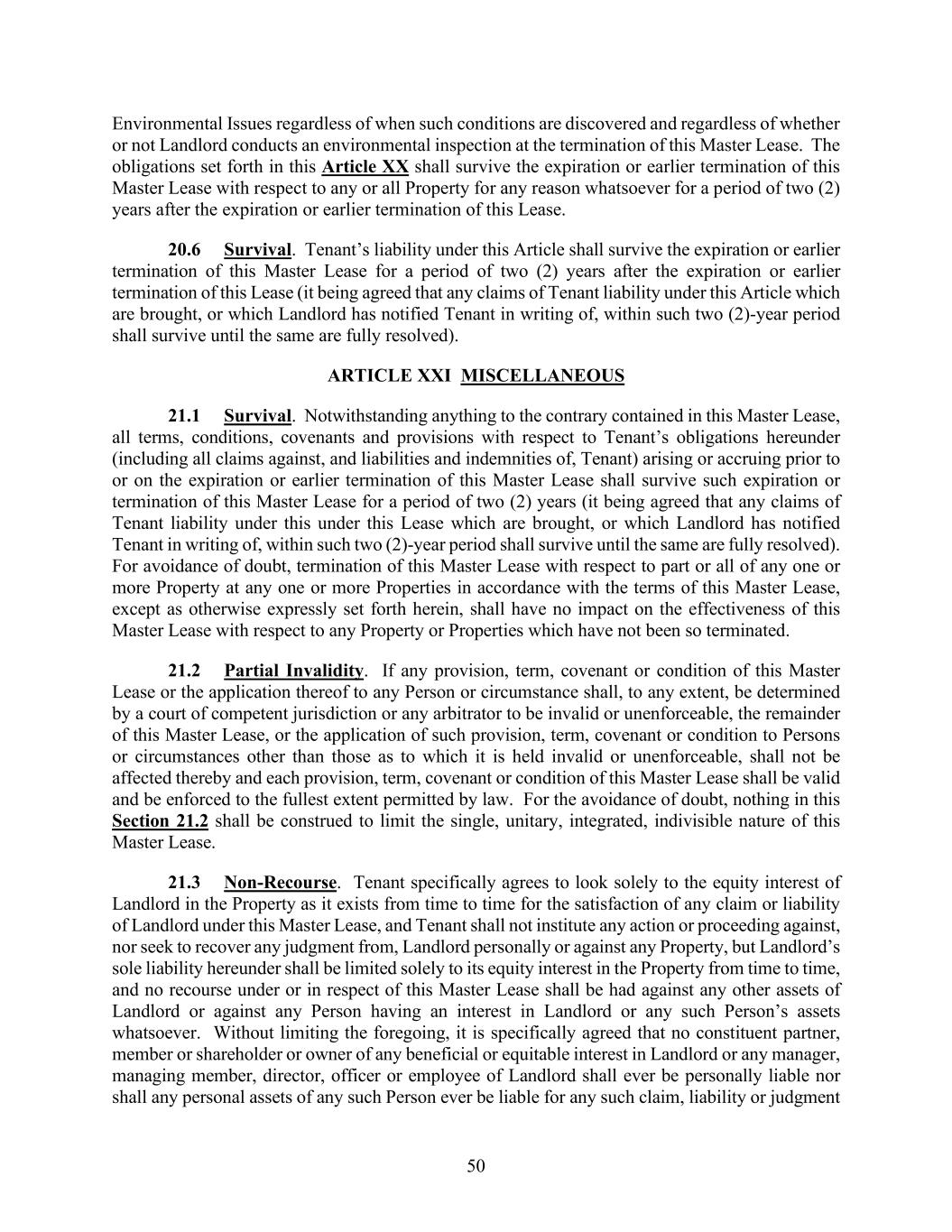 50 Environmental Issues regardless of when such conditions are discovered and regardless of whether or not Landlord conducts an environmental inspection at the termination of this Master Lease. The obligations set forth in this Article XX shall survive the expiration or earlier termination of this Master Lease with respect to any or all Property for any reason whatsoever for a period of two (2) years after the expiration or earlier termination of this Lease. 20.6 Survival. Tenant’s liability under this Article shall survive the expiration or earlier termination of this Master Lease for a period of two (2) years after the expiration or earlier termination of this Lease (it being agreed that any claims of Tenant liability under this Article which are brought, or which Landlord has notified Tenant in writing of, within such two (2)-year period shall survive until the same are fully resolved). ARTICLE XXI MISCELLANEOUS 21.1 Survival. Notwithstanding anything to the contrary contained in this Master Lease, all terms, conditions, covenants and provisions with respect to Tenant’s obligations hereunder (including all claims against, and liabilities and indemnities of, Tenant) arising or accruing prior to or on the expiration or earlier termination of this Master Lease shall survive such expiration or termination of this Master Lease for a period of two (2) years (it being agreed that any claims of Tenant liability under this under this Lease which are brought, or which Landlord has notified Tenant in writing of, within such two (2)-year period shall survive until the same are fully resolved). For avoidance of doubt, termination of this Master Lease with respect to part or all of any one or more Property at any one or more Properties in accordance with the terms of this Master Lease, except as otherwise expressly set forth herein, shall have no impact on the effectiveness of this Master Lease with respect to any Property or Properties which have not been so terminated. 21.2 Partial Invalidity. If any provision, term, covenant or condition of this Master Lease or the application thereof to any Person or circumstance shall, to any extent, be determined by a court of competent jurisdiction or any arbitrator to be invalid or unenforceable, the remainder of this Master Lease, or the application of such provision, term, covenant or condition to Persons or circumstances other than those as to which it is held invalid or unenforceable, shall not be affected thereby and each provision, term, covenant or condition of this Master Lease shall be valid and be enforced to the fullest extent permitted by law. For the avoidance of doubt, nothing in this Section 21.2 shall be construed to limit the single, unitary, integrated, indivisible nature of this Master Lease. 21.3 Non-Recourse. Tenant specifically agrees to look solely to the equity interest of Landlord in the Property as it exists from time to time for the satisfaction of any claim or liability of Landlord under this Master Lease, and Tenant shall not institute any action or proceeding against, nor seek to recover any judgment from, Landlord personally or against any Property, but Landlord’s sole liability hereunder shall be limited solely to its equity interest in the Property from time to time, and no recourse under or in respect of this Master Lease shall be had against any other assets of Landlord or against any Person having an interest in Landlord or any such Person’s assets whatsoever. Without limiting the foregoing, it is specifically agreed that no constituent partner, member or shareholder or owner of any beneficial or equitable interest in Landlord or any manager, managing member, director, officer or employee of Landlord shall ever be personally liable nor shall any personal assets of any such Person ever be liable for any such claim, liability or judgment