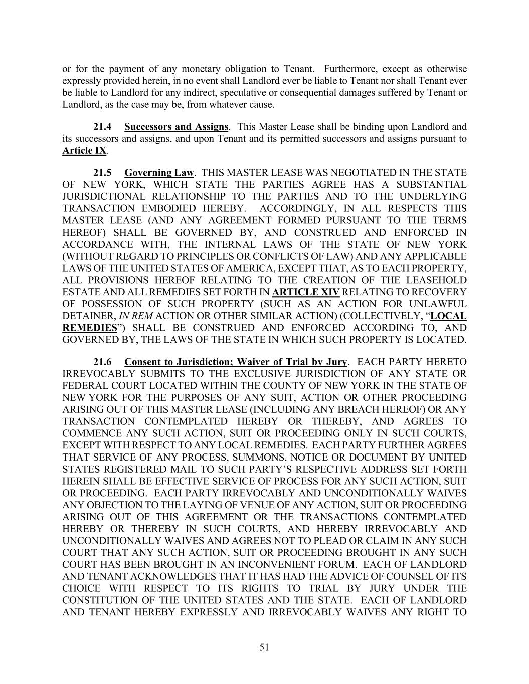 51 or for the payment of any monetary obligation to Tenant. Furthermore, except as otherwise expressly provided herein, in no event shall Landlord ever be liable to Tenant nor shall Tenant ever be liable to Landlord for any indirect, speculative or consequential damages suffered by Tenant or Landlord, as the case may be, from whatever cause. 21.4 Successors and Assigns. This Master Lease shall be binding upon Landlord and its successors and assigns, and upon Tenant and its permitted successors and assigns pursuant to Article IX. 21.5 Governing Law. THIS MASTER LEASE WAS NEGOTIATED IN THE STATE OF NEW YORK, WHICH STATE THE PARTIES AGREE HAS A SUBSTANTIAL JURISDICTIONAL RELATIONSHIP TO THE PARTIES AND TO THE UNDERLYING TRANSACTION EMBODIED HEREBY. ACCORDINGLY, IN ALL RESPECTS THIS MASTER LEASE (AND ANY AGREEMENT FORMED PURSUANT TO THE TERMS HEREOF) SHALL BE GOVERNED BY, AND CONSTRUED AND ENFORCED IN ACCORDANCE WITH, THE INTERNAL LAWS OF THE STATE OF NEW YORK (WITHOUT REGARD TO PRINCIPLES OR CONFLICTS OF LAW) AND ANY APPLICABLE LAWS OF THE UNITED STATES OF AMERICA, EXCEPT THAT, AS TO EACH PROPERTY, ALL PROVISIONS HEREOF RELATING TO THE CREATION OF THE LEASEHOLD ESTATE AND ALL REMEDIES SET FORTH IN ARTICLE XIV RELATING TO RECOVERY OF POSSESSION OF SUCH PROPERTY (SUCH AS AN ACTION FOR UNLAWFUL DETAINER, IN REM ACTION OR OTHER SIMILAR ACTION) (COLLECTIVELY, “LOCAL REMEDIES”) SHALL BE CONSTRUED AND ENFORCED ACCORDING TO, AND GOVERNED BY, THE LAWS OF THE STATE IN WHICH SUCH PROPERTY IS LOCATED. 21.6 Consent to Jurisdiction; Waiver of Trial by Jury. EACH PARTY HERETO IRREVOCABLY SUBMITS TO THE EXCLUSIVE JURISDICTION OF ANY STATE OR FEDERAL COURT LOCATED WITHIN THE COUNTY OF NEW YORK IN THE STATE OF NEW YORK FOR THE PURPOSES OF ANY SUIT, ACTION OR OTHER PROCEEDING ARISING OUT OF THIS MASTER LEASE (INCLUDING ANY BREACH HEREOF) OR ANY TRANSACTION CONTEMPLATED HEREBY OR THEREBY, AND AGREES TO COMMENCE ANY SUCH ACTION, SUIT OR PROCEEDING ONLY IN SUCH COURTS, EXCEPT WITH RESPECT TO ANY LOCAL REMEDIES. EACH PARTY FURTHER AGREES THAT SERVICE OF ANY PROCESS, SUMMONS, NOTICE OR DOCUMENT BY UNITED STATES REGISTERED MAIL TO SUCH PARTY’S RESPECTIVE ADDRESS SET FORTH HEREIN SHALL BE EFFECTIVE SERVICE OF PROCESS FOR ANY SUCH ACTION, SUIT OR PROCEEDING. EACH PARTY IRREVOCABLY AND UNCONDITIONALLY WAIVES ANY OBJECTION TO THE LAYING OF VENUE OF ANY ACTION, SUIT OR PROCEEDING ARISING OUT OF THIS AGREEMENT OR THE TRANSACTIONS CONTEMPLATED HEREBY OR THEREBY IN SUCH COURTS, AND HEREBY IRREVOCABLY AND UNCONDITIONALLY WAIVES AND AGREES NOT TO PLEAD OR CLAIM IN ANY SUCH COURT THAT ANY SUCH ACTION, SUIT OR PROCEEDING BROUGHT IN ANY SUCH COURT HAS BEEN BROUGHT IN AN INCONVENIENT FORUM. EACH OF LANDLORD AND TENANT ACKNOWLEDGES THAT IT HAS HAD THE ADVICE OF COUNSEL OF ITS CHOICE WITH RESPECT TO ITS RIGHTS TO TRIAL BY JURY UNDER THE CONSTITUTION OF THE UNITED STATES AND THE STATE. EACH OF LANDLORD AND TENANT HEREBY EXPRESSLY AND IRREVOCABLY WAIVES ANY RIGHT TO
