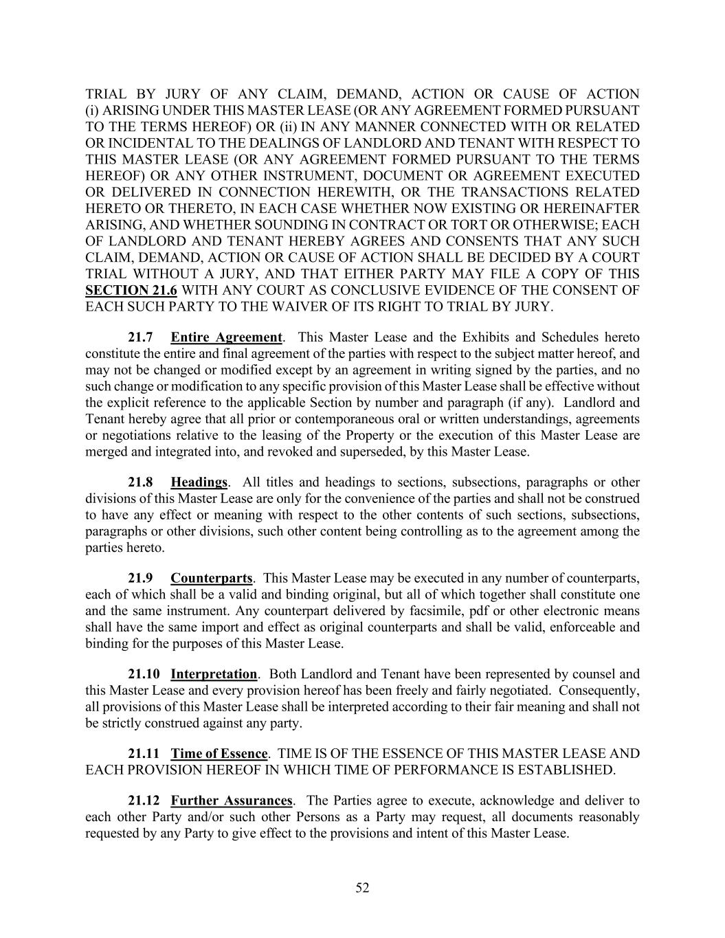 52 TRIAL BY JURY OF ANY CLAIM, DEMAND, ACTION OR CAUSE OF ACTION (i) ARISING UNDER THIS MASTER LEASE (OR ANY AGREEMENT FORMED PURSUANT TO THE TERMS HEREOF) OR (ii) IN ANY MANNER CONNECTED WITH OR RELATED OR INCIDENTAL TO THE DEALINGS OF LANDLORD AND TENANT WITH RESPECT TO THIS MASTER LEASE (OR ANY AGREEMENT FORMED PURSUANT TO THE TERMS HEREOF) OR ANY OTHER INSTRUMENT, DOCUMENT OR AGREEMENT EXECUTED OR DELIVERED IN CONNECTION HEREWITH, OR THE TRANSACTIONS RELATED HERETO OR THERETO, IN EACH CASE WHETHER NOW EXISTING OR HEREINAFTER ARISING, AND WHETHER SOUNDING IN CONTRACT OR TORT OR OTHERWISE; EACH OF LANDLORD AND TENANT HEREBY AGREES AND CONSENTS THAT ANY SUCH CLAIM, DEMAND, ACTION OR CAUSE OF ACTION SHALL BE DECIDED BY A COURT TRIAL WITHOUT A JURY, AND THAT EITHER PARTY MAY FILE A COPY OF THIS SECTION 21.6 WITH ANY COURT AS CONCLUSIVE EVIDENCE OF THE CONSENT OF EACH SUCH PARTY TO THE WAIVER OF ITS RIGHT TO TRIAL BY JURY. 21.7 Entire Agreement. This Master Lease and the Exhibits and Schedules hereto constitute the entire and final agreement of the parties with respect to the subject matter hereof, and may not be changed or modified except by an agreement in writing signed by the parties, and no such change or modification to any specific provision of this Master Lease shall be effective without the explicit reference to the applicable Section by number and paragraph (if any). Landlord and Tenant hereby agree that all prior or contemporaneous oral or written understandings, agreements or negotiations relative to the leasing of the Property or the execution of this Master Lease are merged and integrated into, and revoked and superseded, by this Master Lease. 21.8 Headings. All titles and headings to sections, subsections, paragraphs or other divisions of this Master Lease are only for the convenience of the parties and shall not be construed to have any effect or meaning with respect to the other contents of such sections, subsections, paragraphs or other divisions, such other content being controlling as to the agreement among the parties hereto. 21.9 Counterparts. This Master Lease may be executed in any number of counterparts, each of which shall be a valid and binding original, but all of which together shall constitute one and the same instrument. Any counterpart delivered by facsimile, pdf or other electronic means shall have the same import and effect as original counterparts and shall be valid, enforceable and binding for the purposes of this Master Lease. 21.10 Interpretation. Both Landlord and Tenant have been represented by counsel and this Master Lease and every provision hereof has been freely and fairly negotiated. Consequently, all provisions of this Master Lease shall be interpreted according to their fair meaning and shall not be strictly construed against any party. 21.11 Time of Essence. TIME IS OF THE ESSENCE OF THIS MASTER LEASE AND EACH PROVISION HEREOF IN WHICH TIME OF PERFORMANCE IS ESTABLISHED. 21.12 Further Assurances. The Parties agree to execute, acknowledge and deliver to each other Party and/or such other Persons as a Party may request, all documents reasonably requested by any Party to give effect to the provisions and intent of this Master Lease.