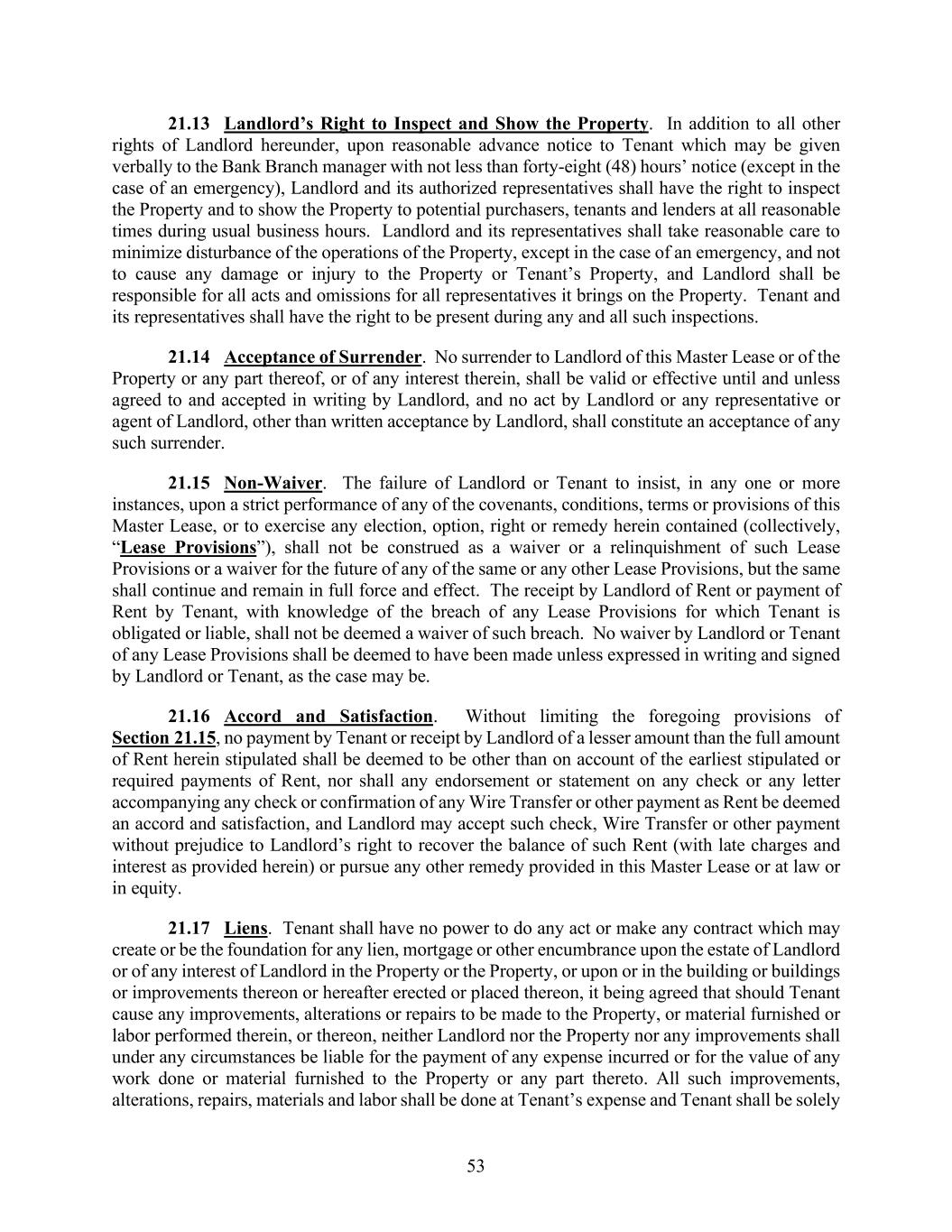53 21.13 Landlord’s Right to Inspect and Show the Property. In addition to all other rights of Landlord hereunder, upon reasonable advance notice to Tenant which may be given verbally to the Bank Branch manager with not less than forty-eight (48) hours’ notice (except in the case of an emergency), Landlord and its authorized representatives shall have the right to inspect the Property and to show the Property to potential purchasers, tenants and lenders at all reasonable times during usual business hours. Landlord and its representatives shall take reasonable care to minimize disturbance of the operations of the Property, except in the case of an emergency, and not to cause any damage or injury to the Property or Tenant’s Property, and Landlord shall be responsible for all acts and omissions for all representatives it brings on the Property. Tenant and its representatives shall have the right to be present during any and all such inspections. 21.14 Acceptance of Surrender. No surrender to Landlord of this Master Lease or of the Property or any part thereof, or of any interest therein, shall be valid or effective until and unless agreed to and accepted in writing by Landlord, and no act by Landlord or any representative or agent of Landlord, other than written acceptance by Landlord, shall constitute an acceptance of any such surrender. 21.15 Non-Waiver. The failure of Landlord or Tenant to insist, in any one or more instances, upon a strict performance of any of the covenants, conditions, terms or provisions of this Master Lease, or to exercise any election, option, right or remedy herein contained (collectively, “Lease Provisions”), shall not be construed as a waiver or a relinquishment of such Lease Provisions or a waiver for the future of any of the same or any other Lease Provisions, but the same shall continue and remain in full force and effect. The receipt by Landlord of Rent or payment of Rent by Tenant, with knowledge of the breach of any Lease Provisions for which Tenant is obligated or liable, shall not be deemed a waiver of such breach. No waiver by Landlord or Tenant of any Lease Provisions shall be deemed to have been made unless expressed in writing and signed by Landlord or Tenant, as the case may be. 21.16 Accord and Satisfaction. Without limiting the foregoing provisions of Section 21.15, no payment by Tenant or receipt by Landlord of a lesser amount than the full amount of Rent herein stipulated shall be deemed to be other than on account of the earliest stipulated or required payments of Rent, nor shall any endorsement or statement on any check or any letter accompanying any check or confirmation of any Wire Transfer or other payment as Rent be deemed an accord and satisfaction, and Landlord may accept such check, Wire Transfer or other payment without prejudice to Landlord’s right to recover the balance of such Rent (with late charges and interest as provided herein) or pursue any other remedy provided in this Master Lease or at law or in equity. 21.17 Liens. Tenant shall have no power to do any act or make any contract which may create or be the foundation for any lien, mortgage or other encumbrance upon the estate of Landlord or of any interest of Landlord in the Property or the Property, or upon or in the building or buildings or improvements thereon or hereafter erected or placed thereon, it being agreed that should Tenant cause any improvements, alterations or repairs to be made to the Property, or material furnished or labor performed therein, or thereon, neither Landlord nor the Property nor any improvements shall under any circumstances be liable for the payment of any expense incurred or for the value of any work done or material furnished to the Property or any part thereto. All such improvements, alterations, repairs, materials and labor shall be done at Tenant’s expense and Tenant shall be solely