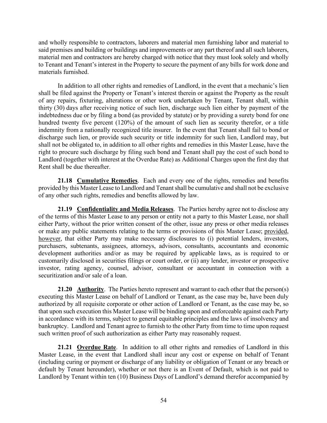 54 and wholly responsible to contractors, laborers and material men furnishing labor and material to said premises and building or buildings and improvements or any part thereof and all such laborers, material men and contractors are hereby charged with notice that they must look solely and wholly to Tenant and Tenant’s interest in the Property to secure the payment of any bills for work done and materials furnished. In addition to all other rights and remedies of Landlord, in the event that a mechanic’s lien shall be filed against the Property or Tenant’s interest therein or against the Property as the result of any repairs, fixturing, alterations or other work undertaken by Tenant, Tenant shall, within thirty (30) days after receiving notice of such lien, discharge such lien either by payment of the indebtedness due or by filing a bond (as provided by statute) or by providing a surety bond for one hundred twenty five percent (120%) of the amount of such lien as security therefor, or a title indemnity from a nationally recognized title insurer. In the event that Tenant shall fail to bond or discharge such lien, or provide such security or title indemnity for such lien, Landlord may, but shall not be obligated to, in addition to all other rights and remedies in this Master Lease, have the right to procure such discharge by filing such bond and Tenant shall pay the cost of such bond to Landlord (together with interest at the Overdue Rate) as Additional Charges upon the first day that Rent shall be due thereafter. 21.18 Cumulative Remedies. Each and every one of the rights, remedies and benefits provided by this Master Lease to Landlord and Tenant shall be cumulative and shall not be exclusive of any other such rights, remedies and benefits allowed by law. 21.19 Confidentiality and Media Releases. The Parties hereby agree not to disclose any of the terms of this Master Lease to any person or entity not a party to this Master Lease, nor shall either Party, without the prior written consent of the other, issue any press or other media releases or make any public statements relating to the terms or provisions of this Master Lease; provided, however, that either Party may make necessary disclosures to (i) potential lenders, investors, purchasers, subtenants, assignees, attorneys, advisors, consultants, accountants and economic development authorities and/or as may be required by applicable laws, as is required to or customarily disclosed in securities filings or court order, or (ii) any lender, investor or prospective investor, rating agency, counsel, advisor, consultant or accountant in connection with a securitization and/or sale of a loan. 21.20 Authority. The Parties hereto represent and warrant to each other that the person(s) executing this Master Lease on behalf of Landlord or Tenant, as the case may be, have been duly authorized by all requisite corporate or other action of Landlord or Tenant, as the case may be, so that upon such execution this Master Lease will be binding upon and enforceable against each Party in accordance with its terms, subject to general equitable principles and the laws of insolvency and bankruptcy. Landlord and Tenant agree to furnish to the other Party from time to time upon request such written proof of such authorization as either Party may reasonably request. 21.21 Overdue Rate. In addition to all other rights and remedies of Landlord in this Master Lease, in the event that Landlord shall incur any cost or expense on behalf of Tenant (including curing or payment or discharge of any liability or obligation of Tenant or any breach or default by Tenant hereunder), whether or not there is an Event of Default, which is not paid to Landlord by Tenant within ten (10) Business Days of Landlord’s demand therefor accompanied by