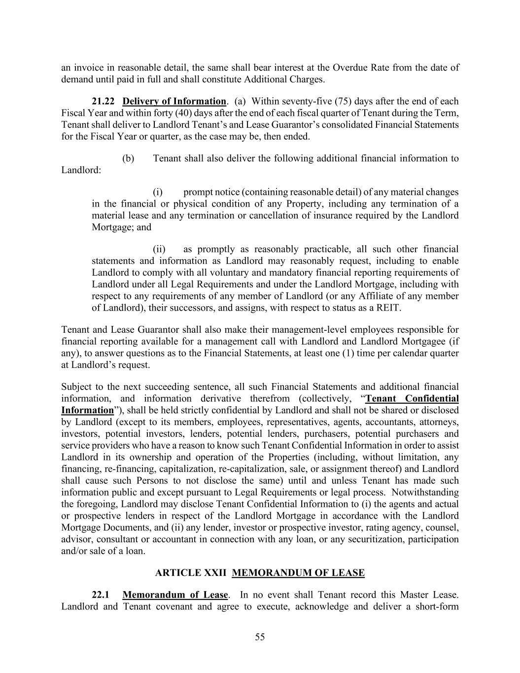 55 an invoice in reasonable detail, the same shall bear interest at the Overdue Rate from the date of demand until paid in full and shall constitute Additional Charges. 21.22 Delivery of Information. (a) Within seventy-five (75) days after the end of each Fiscal Year and within forty (40) days after the end of each fiscal quarter of Tenant during the Term, Tenant shall deliver to Landlord Tenant’s and Lease Guarantor’s consolidated Financial Statements for the Fiscal Year or quarter, as the case may be, then ended. (b) Tenant shall also deliver the following additional financial information to Landlord: (i) prompt notice (containing reasonable detail) of any material changes in the financial or physical condition of any Property, including any termination of a material lease and any termination or cancellation of insurance required by the Landlord Mortgage; and (ii) as promptly as reasonably practicable, all such other financial statements and information as Landlord may reasonably request, including to enable Landlord to comply with all voluntary and mandatory financial reporting requirements of Landlord under all Legal Requirements and under the Landlord Mortgage, including with respect to any requirements of any member of Landlord (or any Affiliate of any member of Landlord), their successors, and assigns, with respect to status as a REIT. Tenant and Lease Guarantor shall also make their management-level employees responsible for financial reporting available for a management call with Landlord and Landlord Mortgagee (if any), to answer questions as to the Financial Statements, at least one (1) time per calendar quarter at Landlord’s request. Subject to the next succeeding sentence, all such Financial Statements and additional financial information, and information derivative therefrom (collectively, “Tenant Confidential Information”), shall be held strictly confidential by Landlord and shall not be shared or disclosed by Landlord (except to its members, employees, representatives, agents, accountants, attorneys, investors, potential investors, lenders, potential lenders, purchasers, potential purchasers and service providers who have a reason to know such Tenant Confidential Information in order to assist Landlord in its ownership and operation of the Properties (including, without limitation, any financing, re-financing, capitalization, re-capitalization, sale, or assignment thereof) and Landlord shall cause such Persons to not disclose the same) until and unless Tenant has made such information public and except pursuant to Legal Requirements or legal process. Notwithstanding the foregoing, Landlord may disclose Tenant Confidential Information to (i) the agents and actual or prospective lenders in respect of the Landlord Mortgage in accordance with the Landlord Mortgage Documents, and (ii) any lender, investor or prospective investor, rating agency, counsel, advisor, consultant or accountant in connection with any loan, or any securitization, participation and/or sale of a loan. ARTICLE XXII MEMORANDUM OF LEASE 22.1 Memorandum of Lease. In no event shall Tenant record this Master Lease. Landlord and Tenant covenant and agree to execute, acknowledge and deliver a short-form