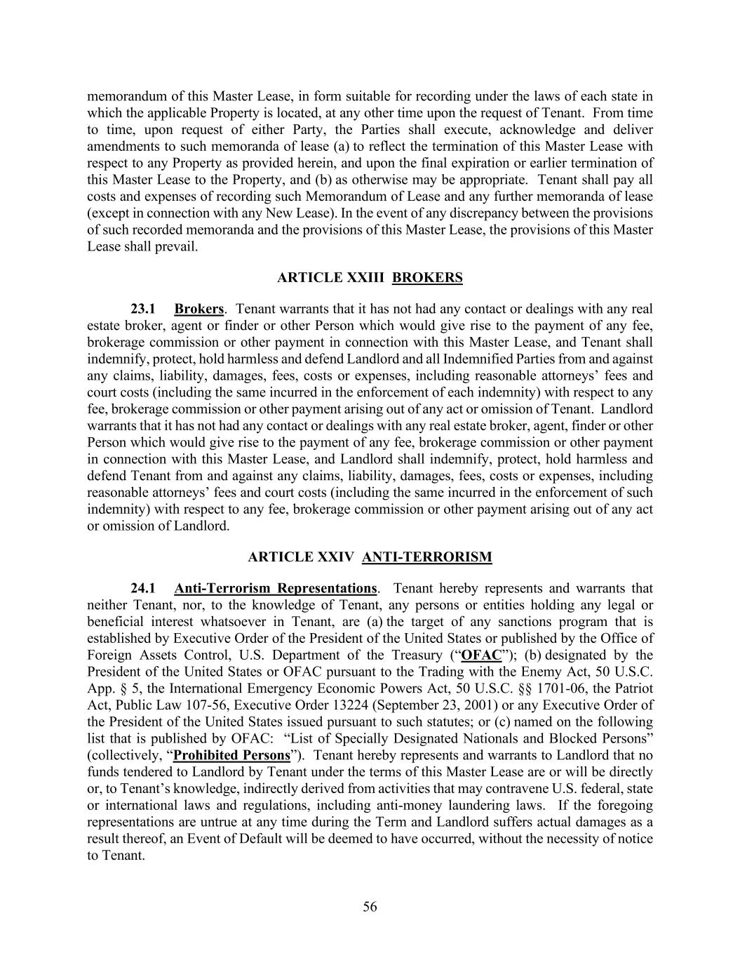 56 memorandum of this Master Lease, in form suitable for recording under the laws of each state in which the applicable Property is located, at any other time upon the request of Tenant. From time to time, upon request of either Party, the Parties shall execute, acknowledge and deliver amendments to such memoranda of lease (a) to reflect the termination of this Master Lease with respect to any Property as provided herein, and upon the final expiration or earlier termination of this Master Lease to the Property, and (b) as otherwise may be appropriate. Tenant shall pay all costs and expenses of recording such Memorandum of Lease and any further memoranda of lease (except in connection with any New Lease). In the event of any discrepancy between the provisions of such recorded memoranda and the provisions of this Master Lease, the provisions of this Master Lease shall prevail. ARTICLE XXIII BROKERS 23.1 Brokers. Tenant warrants that it has not had any contact or dealings with any real estate broker, agent or finder or other Person which would give rise to the payment of any fee, brokerage commission or other payment in connection with this Master Lease, and Tenant shall indemnify, protect, hold harmless and defend Landlord and all Indemnified Parties from and against any claims, liability, damages, fees, costs or expenses, including reasonable attorneys’ fees and court costs (including the same incurred in the enforcement of each indemnity) with respect to any fee, brokerage commission or other payment arising out of any act or omission of Tenant. Landlord warrants that it has not had any contact or dealings with any real estate broker, agent, finder or other Person which would give rise to the payment of any fee, brokerage commission or other payment in connection with this Master Lease, and Landlord shall indemnify, protect, hold harmless and defend Tenant from and against any claims, liability, damages, fees, costs or expenses, including reasonable attorneys’ fees and court costs (including the same incurred in the enforcement of such indemnity) with respect to any fee, brokerage commission or other payment arising out of any act or omission of Landlord. ARTICLE XXIV ANTI-TERRORISM 24.1 Anti-Terrorism Representations. Tenant hereby represents and warrants that neither Tenant, nor, to the knowledge of Tenant, any persons or entities holding any legal or beneficial interest whatsoever in Tenant, are (a) the target of any sanctions program that is established by Executive Order of the President of the United States or published by the Office of Foreign Assets Control, U.S. Department of the Treasury (“OFAC”); (b) designated by the President of the United States or OFAC pursuant to the Trading with the Enemy Act, 50 U.S.C. App. § 5, the International Emergency Economic Powers Act, 50 U.S.C. §§ 1701-06, the Patriot Act, Public Law 107-56, Executive Order 13224 (September 23, 2001) or any Executive Order of the President of the United States issued pursuant to such statutes; or (c) named on the following list that is published by OFAC: “List of Specially Designated Nationals and Blocked Persons” (collectively, “Prohibited Persons”). Tenant hereby represents and warrants to Landlord that no funds tendered to Landlord by Tenant under the terms of this Master Lease are or will be directly or, to Tenant’s knowledge, indirectly derived from activities that may contravene U.S. federal, state or international laws and regulations, including anti-money laundering laws. If the foregoing representations are untrue at any time during the Term and Landlord suffers actual damages as a result thereof, an Event of Default will be deemed to have occurred, without the necessity of notice to Tenant.