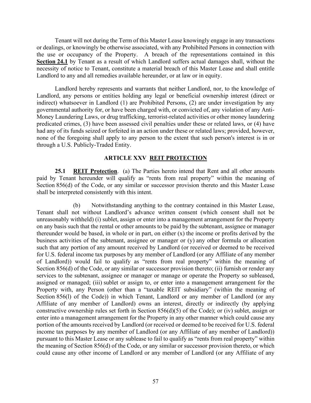 57 Tenant will not during the Term of this Master Lease knowingly engage in any transactions or dealings, or knowingly be otherwise associated, with any Prohibited Persons in connection with the use or occupancy of the Property. A breach of the representations contained in this Section 24.1 by Tenant as a result of which Landlord suffers actual damages shall, without the necessity of notice to Tenant, constitute a material breach of this Master Lease and shall entitle Landlord to any and all remedies available hereunder, or at law or in equity. Landlord hereby represents and warrants that neither Landlord, nor, to the knowledge of Landlord, any persons or entities holding any legal or beneficial ownership interest (direct or indirect) whatsoever in Landlord (1) are Prohibited Persons, (2) are under investigation by any governmental authority for, or have been charged with, or convicted of, any violation of any Anti- Money Laundering Laws, or drug trafficking, terrorist-related activities or other money laundering predicated crimes, (3) have been assessed civil penalties under these or related laws, or (4) have had any of its funds seized or forfeited in an action under these or related laws; provided, however, none of the foregoing shall apply to any person to the extent that such person's interest is in or through a U.S. Publicly-Traded Entity. ARTICLE XXV REIT PROTECTION 25.1 REIT Protection. (a) The Parties hereto intend that Rent and all other amounts paid by Tenant hereunder will qualify as “rents from real property” within the meaning of Section 856(d) of the Code, or any similar or successor provision thereto and this Master Lease shall be interpreted consistently with this intent. (b) Notwithstanding anything to the contrary contained in this Master Lease, Tenant shall not without Landlord’s advance written consent (which consent shall not be unreasonably withheld) (i) sublet, assign or enter into a management arrangement for the Property on any basis such that the rental or other amounts to be paid by the subtenant, assignee or manager thereunder would be based, in whole or in part, on either (x) the income or profits derived by the business activities of the subtenant, assignee or manager or (y) any other formula or allocation such that any portion of any amount received by Landlord (or received or deemed to be received for U.S. federal income tax purposes by any member of Landlord (or any Affiliate of any member of Landlord)) would fail to qualify as “rents from real property” within the meaning of Section 856(d) of the Code, or any similar or successor provision thereto; (ii) furnish or render any services to the subtenant, assignee or manager or manage or operate the Property so subleased, assigned or managed; (iii) sublet or assign to, or enter into a management arrangement for the Property with, any Person (other than a “taxable REIT subsidiary” (within the meaning of Section 856(l) of the Code)) in which Tenant, Landlord or any member of Landlord (or any Affiliate of any member of Landlord) owns an interest, directly or indirectly (by applying constructive ownership rules set forth in Section 856(d)(5) of the Code); or (iv) sublet, assign or enter into a management arrangement for the Property in any other manner which could cause any portion of the amounts received by Landlord (or received or deemed to be received for U.S. federal income tax purposes by any member of Landlord (or any Affiliate of any member of Landlord)) pursuant to this Master Lease or any sublease to fail to qualify as “rents from real property” within the meaning of Section 856(d) of the Code, or any similar or successor provision thereto, or which could cause any other income of Landlord or any member of Landlord (or any Affiliate of any