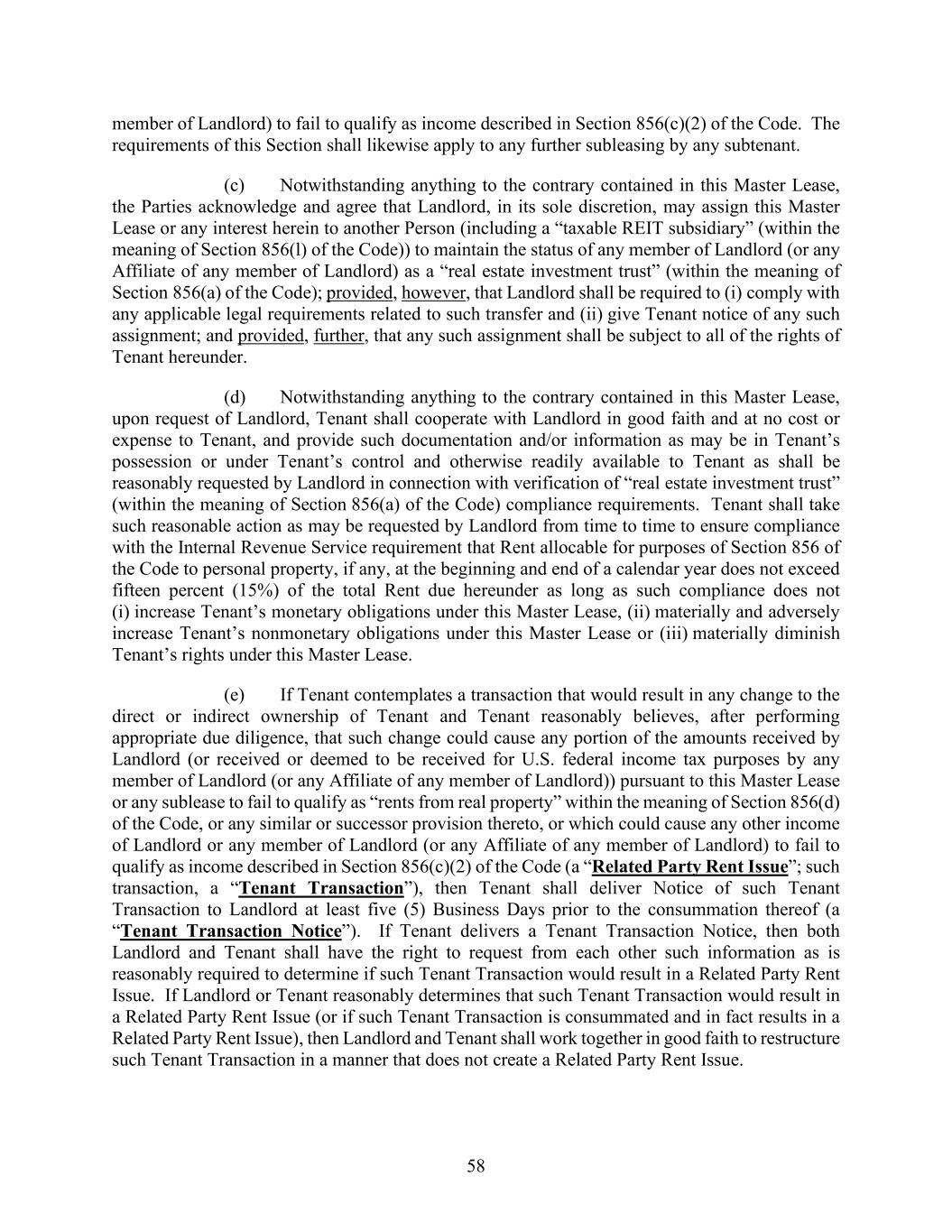 58 member of Landlord) to fail to qualify as income described in Section 856(c)(2) of the Code. The requirements of this Section shall likewise apply to any further subleasing by any subtenant. (c) Notwithstanding anything to the contrary contained in this Master Lease, the Parties acknowledge and agree that Landlord, in its sole discretion, may assign this Master Lease or any interest herein to another Person (including a “taxable REIT subsidiary” (within the meaning of Section 856(l) of the Code)) to maintain the status of any member of Landlord (or any Affiliate of any member of Landlord) as a “real estate investment trust” (within the meaning of Section 856(a) of the Code); provided, however, that Landlord shall be required to (i) comply with any applicable legal requirements related to such transfer and (ii) give Tenant notice of any such assignment; and provided, further, that any such assignment shall be subject to all of the rights of Tenant hereunder. (d) Notwithstanding anything to the contrary contained in this Master Lease, upon request of Landlord, Tenant shall cooperate with Landlord in good faith and at no cost or expense to Tenant, and provide such documentation and/or information as may be in Tenant’s possession or under Tenant’s control and otherwise readily available to Tenant as shall be reasonably requested by Landlord in connection with verification of “real estate investment trust” (within the meaning of Section 856(a) of the Code) compliance requirements. Tenant shall take such reasonable action as may be requested by Landlord from time to time to ensure compliance with the Internal Revenue Service requirement that Rent allocable for purposes of Section 856 of the Code to personal property, if any, at the beginning and end of a calendar year does not exceed fifteen percent (15%) of the total Rent due hereunder as long as such compliance does not (i) increase Tenant’s monetary obligations under this Master Lease, (ii) materially and adversely increase Tenant’s nonmonetary obligations under this Master Lease or (iii) materially diminish Tenant’s rights under this Master Lease. (e) If Tenant contemplates a transaction that would result in any change to the direct or indirect ownership of Tenant and Tenant reasonably believes, after performing appropriate due diligence, that such change could cause any portion of the amounts received by Landlord (or received or deemed to be received for U.S. federal income tax purposes by any member of Landlord (or any Affiliate of any member of Landlord)) pursuant to this Master Lease or any sublease to fail to qualify as “rents from real property” within the meaning of Section 856(d) of the Code, or any similar or successor provision thereto, or which could cause any other income of Landlord or any member of Landlord (or any Affiliate of any member of Landlord) to fail to qualify as income described in Section 856(c)(2) of the Code (a “Related Party Rent Issue”; such transaction, a “Tenant Transaction”), then Tenant shall deliver Notice of such Tenant Transaction to Landlord at least five (5) Business Days prior to the consummation thereof (a “Tenant Transaction Notice”). If Tenant delivers a Tenant Transaction Notice, then both Landlord and Tenant shall have the right to request from each other such information as is reasonably required to determine if such Tenant Transaction would result in a Related Party Rent Issue. If Landlord or Tenant reasonably determines that such Tenant Transaction would result in a Related Party Rent Issue (or if such Tenant Transaction is consummated and in fact results in a Related Party Rent Issue), then Landlord and Tenant shall work together in good faith to restructure such Tenant Transaction in a manner that does not create a Related Party Rent Issue.