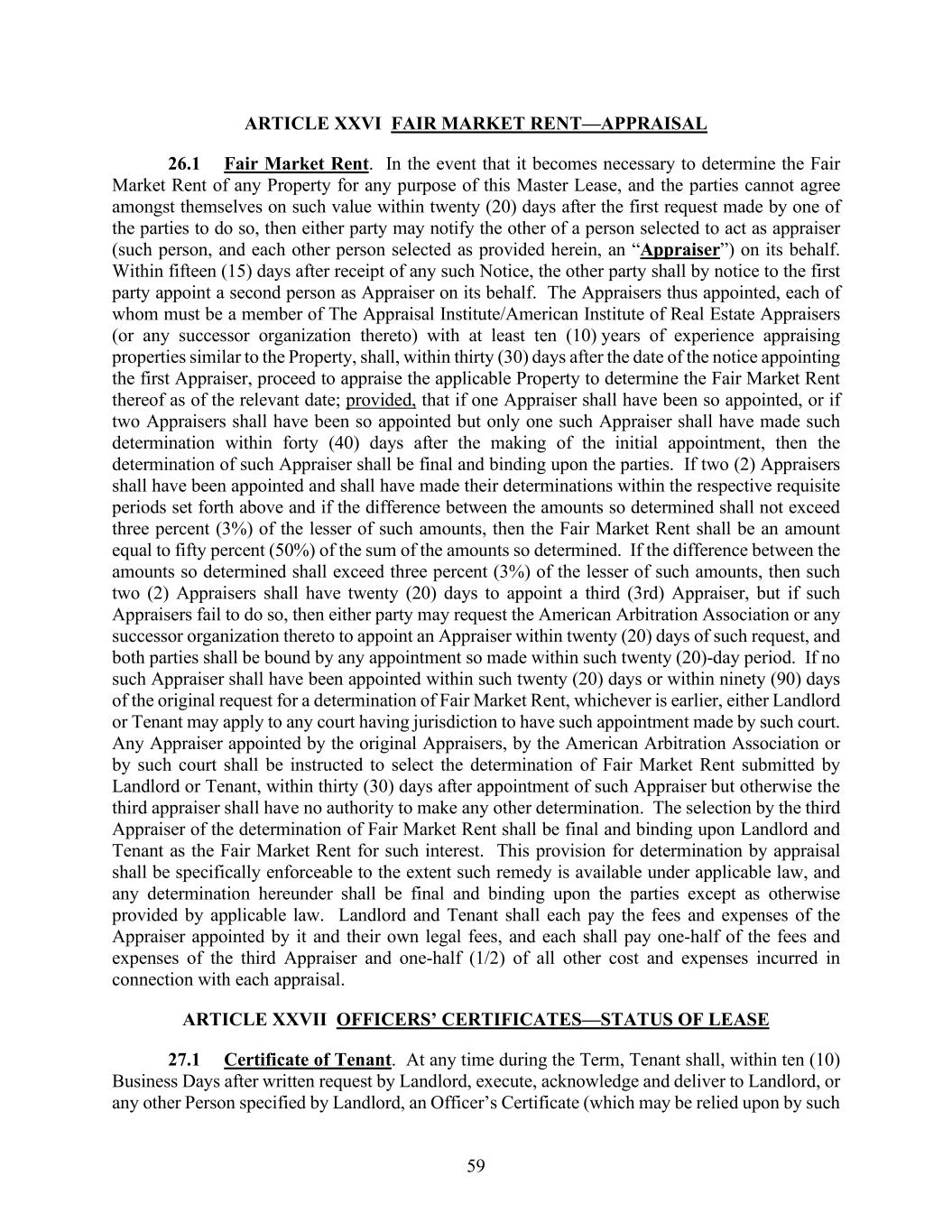 59 ARTICLE XXVI FAIR MARKET RENT—APPRAISAL 26.1 Fair Market Rent. In the event that it becomes necessary to determine the Fair Market Rent of any Property for any purpose of this Master Lease, and the parties cannot agree amongst themselves on such value within twenty (20) days after the first request made by one of the parties to do so, then either party may notify the other of a person selected to act as appraiser (such person, and each other person selected as provided herein, an “Appraiser”) on its behalf. Within fifteen (15) days after receipt of any such Notice, the other party shall by notice to the first party appoint a second person as Appraiser on its behalf. The Appraisers thus appointed, each of whom must be a member of The Appraisal Institute/American Institute of Real Estate Appraisers (or any successor organization thereto) with at least ten (10) years of experience appraising properties similar to the Property, shall, within thirty (30) days after the date of the notice appointing the first Appraiser, proceed to appraise the applicable Property to determine the Fair Market Rent thereof as of the relevant date; provided, that if one Appraiser shall have been so appointed, or if two Appraisers shall have been so appointed but only one such Appraiser shall have made such determination within forty (40) days after the making of the initial appointment, then the determination of such Appraiser shall be final and binding upon the parties. If two (2) Appraisers shall have been appointed and shall have made their determinations within the respective requisite periods set forth above and if the difference between the amounts so determined shall not exceed three percent (3%) of the lesser of such amounts, then the Fair Market Rent shall be an amount equal to fifty percent (50%) of the sum of the amounts so determined. If the difference between the amounts so determined shall exceed three percent (3%) of the lesser of such amounts, then such two (2) Appraisers shall have twenty (20) days to appoint a third (3rd) Appraiser, but if such Appraisers fail to do so, then either party may request the American Arbitration Association or any successor organization thereto to appoint an Appraiser within twenty (20) days of such request, and both parties shall be bound by any appointment so made within such twenty (20)-day period. If no such Appraiser shall have been appointed within such twenty (20) days or within ninety (90) days of the original request for a determination of Fair Market Rent, whichever is earlier, either Landlord or Tenant may apply to any court having jurisdiction to have such appointment made by such court. Any Appraiser appointed by the original Appraisers, by the American Arbitration Association or by such court shall be instructed to select the determination of Fair Market Rent submitted by Landlord or Tenant, within thirty (30) days after appointment of such Appraiser but otherwise the third appraiser shall have no authority to make any other determination. The selection by the third Appraiser of the determination of Fair Market Rent shall be final and binding upon Landlord and Tenant as the Fair Market Rent for such interest. This provision for determination by appraisal shall be specifically enforceable to the extent such remedy is available under applicable law, and any determination hereunder shall be final and binding upon the parties except as otherwise provided by applicable law. Landlord and Tenant shall each pay the fees and expenses of the Appraiser appointed by it and their own legal fees, and each shall pay one-half of the fees and expenses of the third Appraiser and one-half (1/2) of all other cost and expenses incurred in connection with each appraisal. ARTICLE XXVII OFFICERS’ CERTIFICATES—STATUS OF LEASE 27.1 Certificate of Tenant. At any time during the Term, Tenant shall, within ten (10) Business Days after written request by Landlord, execute, acknowledge and deliver to Landlord, or any other Person specified by Landlord, an Officer’s Certificate (which may be relied upon by such