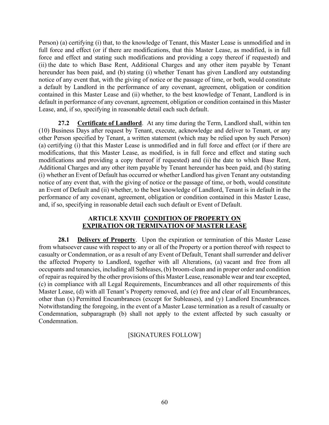 60 Person) (a) certifying (i) that, to the knowledge of Tenant, this Master Lease is unmodified and in full force and effect (or if there are modifications, that this Master Lease, as modified, is in full force and effect and stating such modifications and providing a copy thereof if requested) and (ii) the date to which Base Rent, Additional Charges and any other item payable by Tenant hereunder has been paid, and (b) stating (i) whether Tenant has given Landlord any outstanding notice of any event that, with the giving of notice or the passage of time, or both, would constitute a default by Landlord in the performance of any covenant, agreement, obligation or condition contained in this Master Lease and (ii) whether, to the best knowledge of Tenant, Landlord is in default in performance of any covenant, agreement, obligation or condition contained in this Master Lease, and, if so, specifying in reasonable detail each such default. 27.2 Certificate of Landlord. At any time during the Term, Landlord shall, within ten (10) Business Days after request by Tenant, execute, acknowledge and deliver to Tenant, or any other Person specified by Tenant, a written statement (which may be relied upon by such Person) (a) certifying (i) that this Master Lease is unmodified and in full force and effect (or if there are modifications, that this Master Lease, as modified, is in full force and effect and stating such modifications and providing a copy thereof if requested) and (ii) the date to which Base Rent, Additional Charges and any other item payable by Tenant hereunder has been paid, and (b) stating (i) whether an Event of Default has occurred or whether Landlord has given Tenant any outstanding notice of any event that, with the giving of notice or the passage of time, or both, would constitute an Event of Default and (ii) whether, to the best knowledge of Landlord, Tenant is in default in the performance of any covenant, agreement, obligation or condition contained in this Master Lease, and, if so, specifying in reasonable detail each such default or Event of Default. ARTICLE XXVIII CONDITION OF PROPERTY ON EXPIRATION OR TERMINATION OF MASTER LEASE 28.1 Delivery of Property. Upon the expiration or termination of this Master Lease from whatsoever cause with respect to any or all of the Property or a portion thereof with respect to casualty or Condemnation, or as a result of any Event of Default, Tenant shall surrender and deliver the affected Property to Landlord, together with all Alterations, (a) vacant and free from all occupants and tenancies, including all Subleases, (b) broom-clean and in proper order and condition of repair as required by the other provisions of this Master Lease, reasonable wear and tear excepted, (c) in compliance with all Legal Requirements, Encumbrances and all other requirements of this Master Lease, (d) with all Tenant’s Property removed, and (e) free and clear of all Encumbrances, other than (x) Permitted Encumbrances (except for Subleases), and (y) Landlord Encumbrances. Notwithstanding the foregoing, in the event of a Master Lease termination as a result of casualty or Condemnation, subparagraph (b) shall not apply to the extent affected by such casualty or Condemnation. [SIGNATURES FOLLOW]